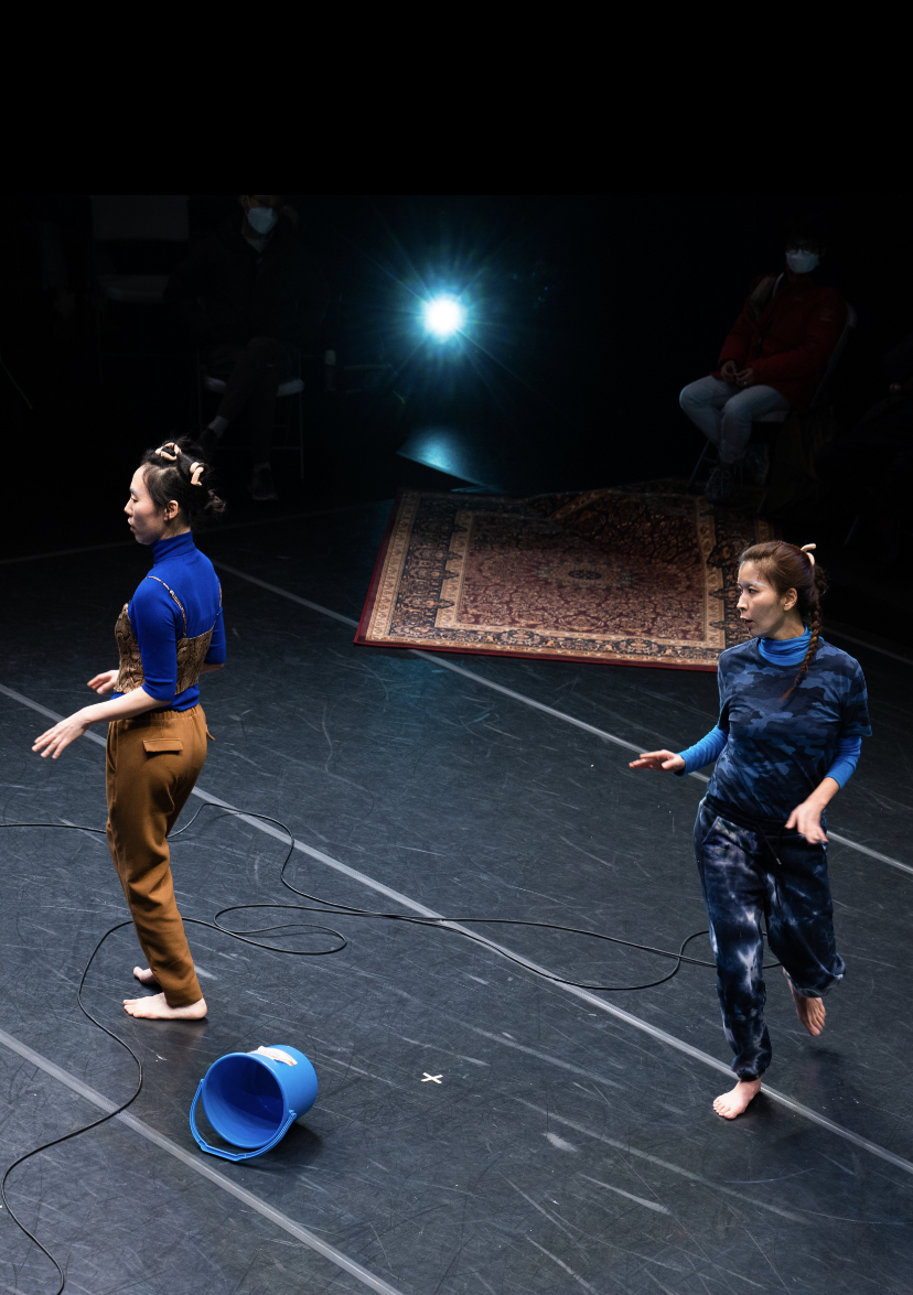 장혜진과 김명신의 관계는 미미크리로 맺어지는데, 이는 마주 볼 때 그나마 극대화되지만, 의식적으로 이뤄진다고는 보이지 않는다. 다만 의식을 이룬 신체들로서의 위상을 내려놓는다고는 할 수 있겠다. 두 사람 간에는 일정 정도 시차가 있고, 형태의 동형성을 유지하지만, 완전히 일치하지는 않는다. 둘의 모방은 물리적으로는 복제와도 양식적으로는 군무와도 다르며, 거울 효과같이 관계 맺지 않고 ‘우연하게’ 이뤄진다. 2 두 퍼포머가 무대 가를 이동하는 가운데, 마이크 하나를 들고 관객 무릎 위를 스치듯 지나가는 장면처럼 움직임은 바깥을 향하고, 경계를 끊임없이 지시하는데(불투명한 얼굴은 소통의 기호를 선사하는 대신 유령으로서 감지되지 않는 퍼포머에게서 이전된 관객의 위상을 건드린다.), 이는 카펫이 두 개씩 하나의 사선 끝점에만 위치하는 것과 같이, 무대를 대략 사선으로 가르는 양 끝에 위치해 무대를 양분한다.
