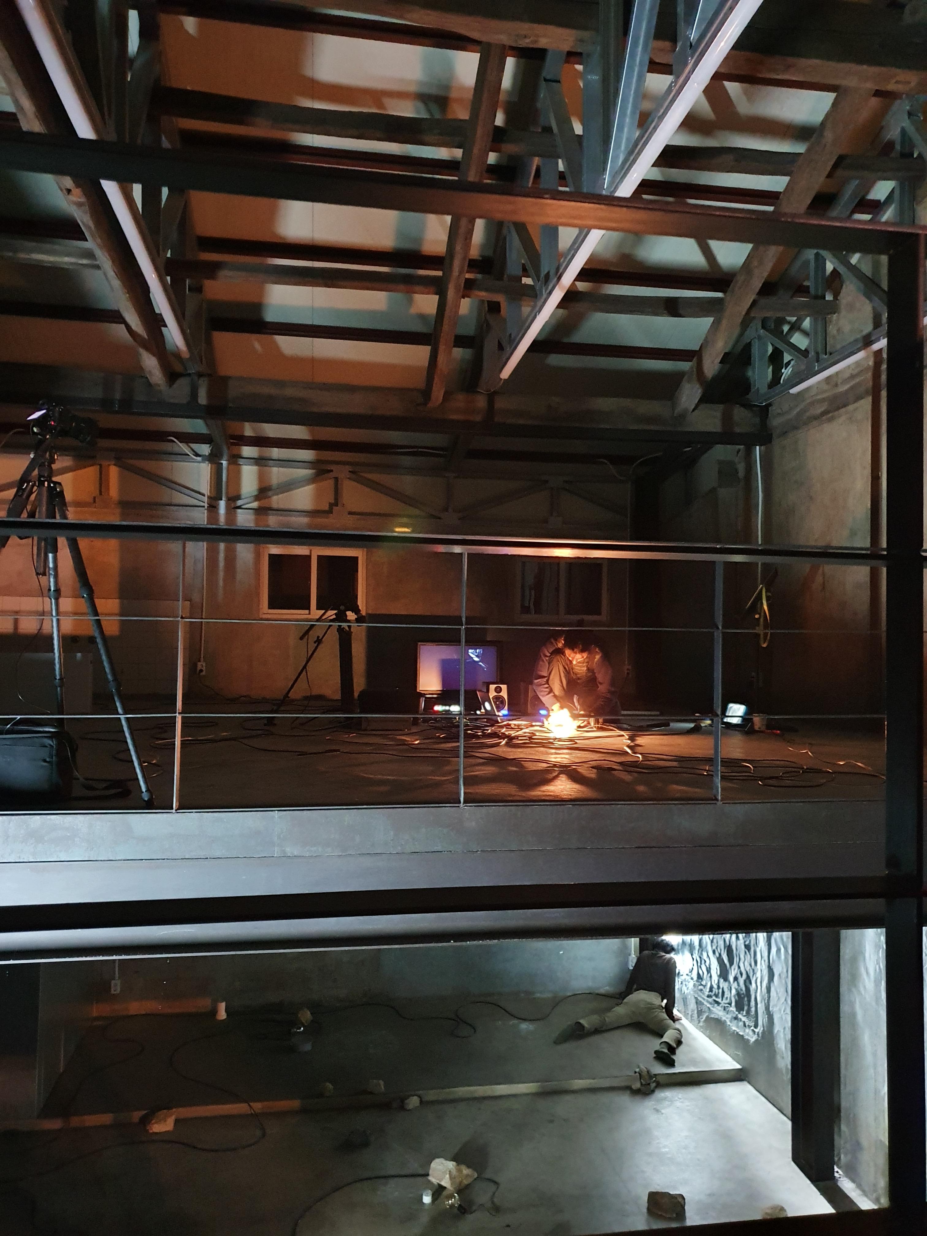 이어 그 위치인 2층의 구멍 공간의 난간에서 1층을 바라보며 마이크를 내려놓는다. 곧 온갖 현실적인 소리로 동기화를 꾀하는 소리 장인의 역할에서 음악과 같은 사운드를 여럿 만드는 것에서, 언어적인 형태를 가지고 창작에 대한 흐릿한 사유를 조직하는 것에서 의도적으로 미끄러지는 것으로 그 말을 무화하며 소거해서 하나의 효과 정도로 자리하거나 다시 퍼포머의 움직임을 수음하는 충실한 매개자로 사라진다. 이제 움직임의 끝, 곧 퍼포먼스의 끝을 보기 위해 이동은 거의 잦아든 상태이다.