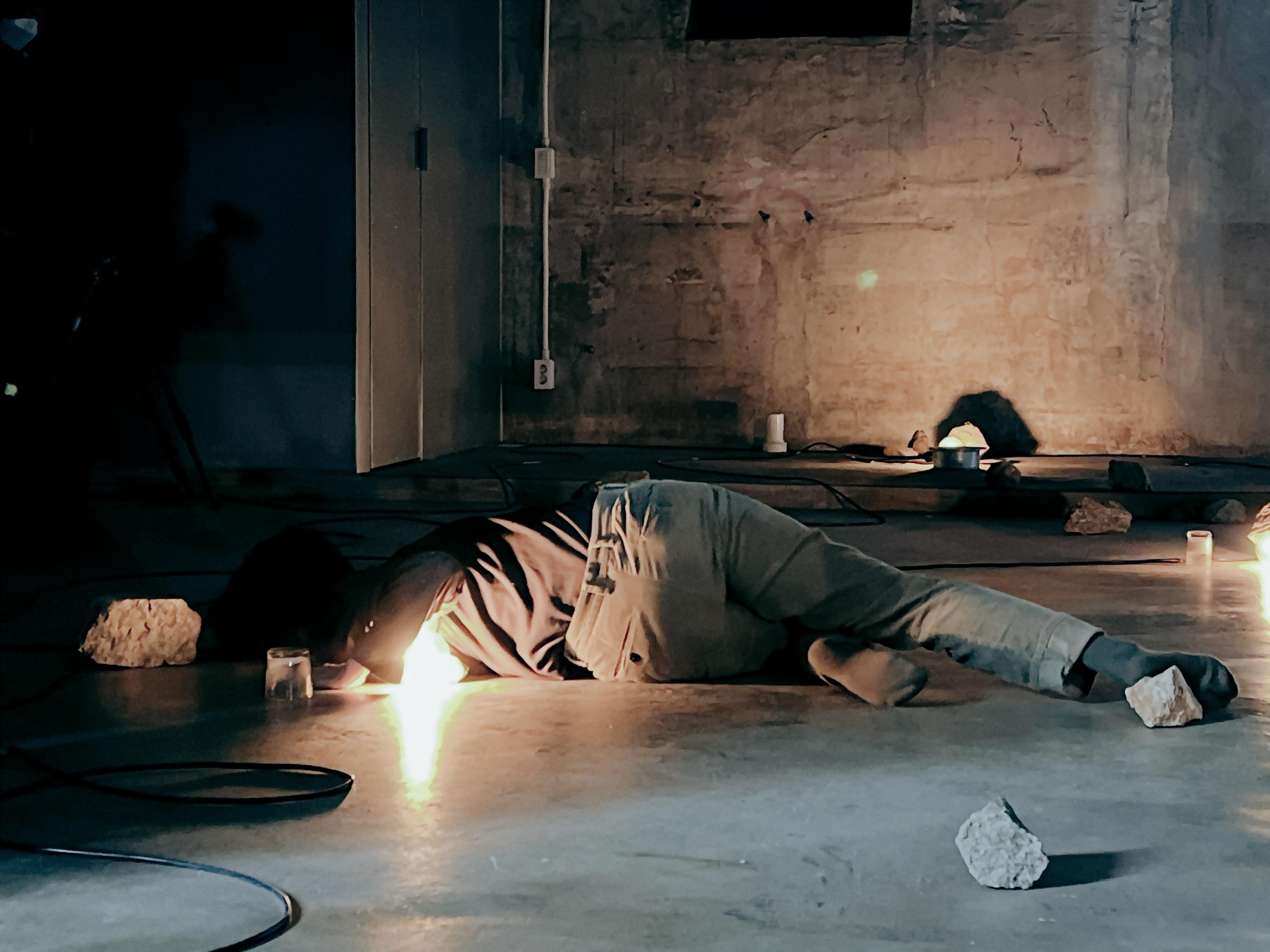 손나예는 한동안 바닥에서 멈춰 있는데, 이는 뜻하지 않게 관객의 난입을 허용한다. 애초에 어떤 발화도 없는 상태로서, 이는 발신이 가능한 텅 빈 용기로서의 혼동을 일으켰다고도 할 수 있다―손나예의 손 위에 관객은 자신의 손을 포갰는데, 손나예는 그로부터 저항하는 대신 오히려 움직임을 멈추고 있었다[각주:1]. 반면 이러한 비인간의 이동은 인간과는 사실상 상관없는 곤충이나 동물과 같은 비체의 얼룩 같은 것이기도 했는데, 그렇다면 이러한 행위는 의도치 않게 그를 존재화시켰다고도 할 수 있을 것이다―반면 이러한 개입은 그 존재하기의 숨은 공식을 가시화시켰다고도 할 수 있을 것이다. 곧 손나예는 눈에 뜨이지 않게 움직이기, 공간의 얼룩처럼 자신의 형상을 말 그대로 공간에 파묻는 것으로써 단지 존재하려 했던 것은 아닐까. 반면 이러한 외부로부터의 사건은 퍼포먼스를 재설정하는 차원을 넘어 작품과 재절합된다. 손나예는 손을 얹진 관객의 위치로 향하며, 더 이상 이동할 수 없는 막다른 위치를 ‘선택’해 멈춤을 끝낸다. 퍼포먼스가 끝나는 순간이다.