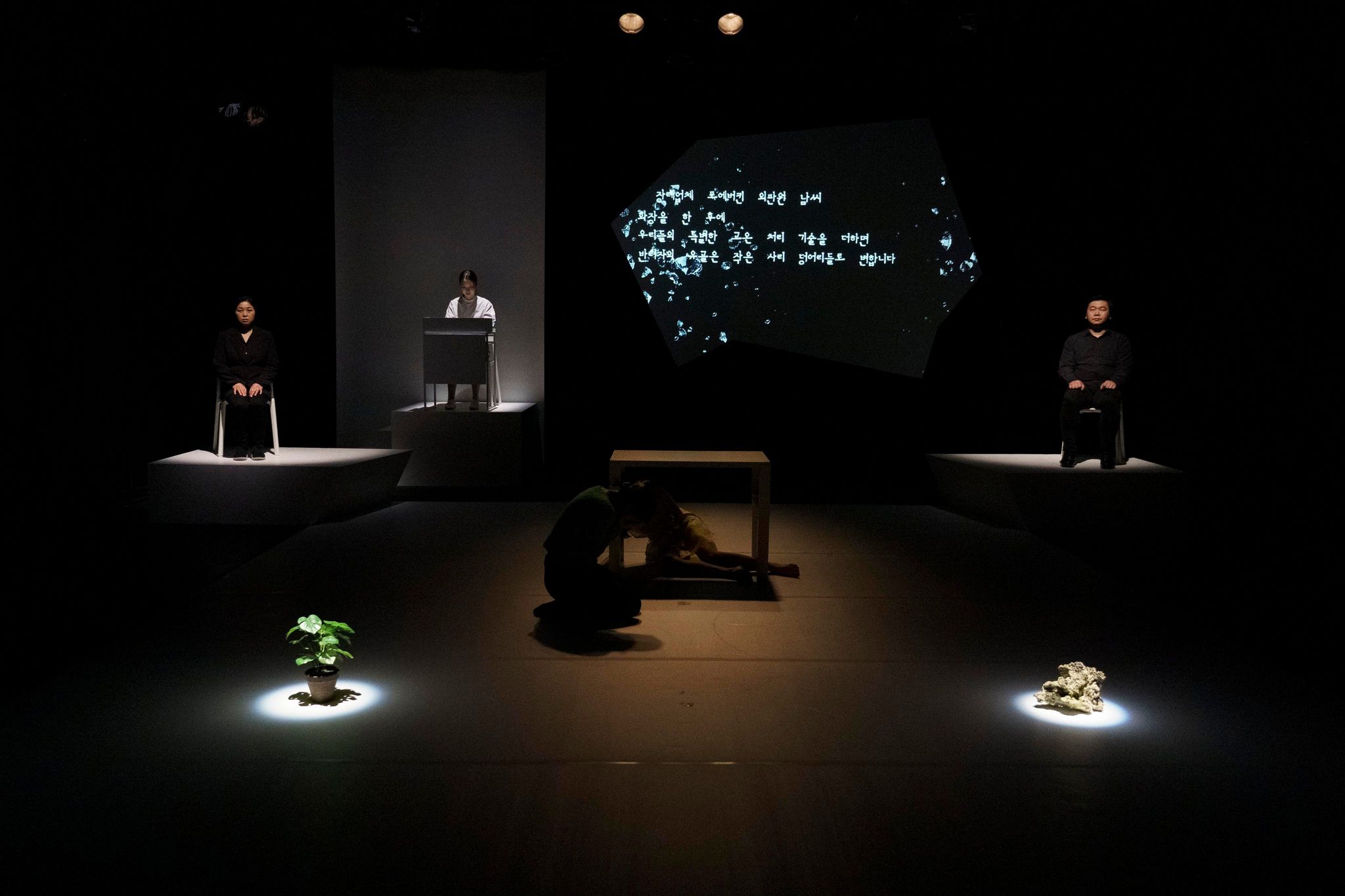 3장, 버섯채집: 모든 생명을 위한 헌법 가장 마지막 장인 “버섯채집: 모든 생명을 위한 헌법”은 누워 있는 무용수들의 신체를 버섯으로 비유하며, 접촉으로써 이를 따는 인간―속기사로 또 다른 번역으로서 기입의 언어를 실천하는 이윤하 배우가 버섯채집자로 분한다.―의 모습을 형상화한다. 일종의 플래시백과 같은 장면으로 지나가는, 별다른 언어가 없는 이 장은, 자연을 착취(?)하는 인간의 행위가 인간의 순전한 아름다움이라는 신비로 비치는 것이 얼마나 기괴한지를 보여주는 장일까. 그럼에도 말이 없는 동시에 움직임도 없는 무용수라는 비인간의 재현이 마지막까지 작동하고 있음을 상상해야 할 것이다. 또한 인간의 신체가 비인간의 신체로 이양되고 있음을 인지해야 할 것이다.