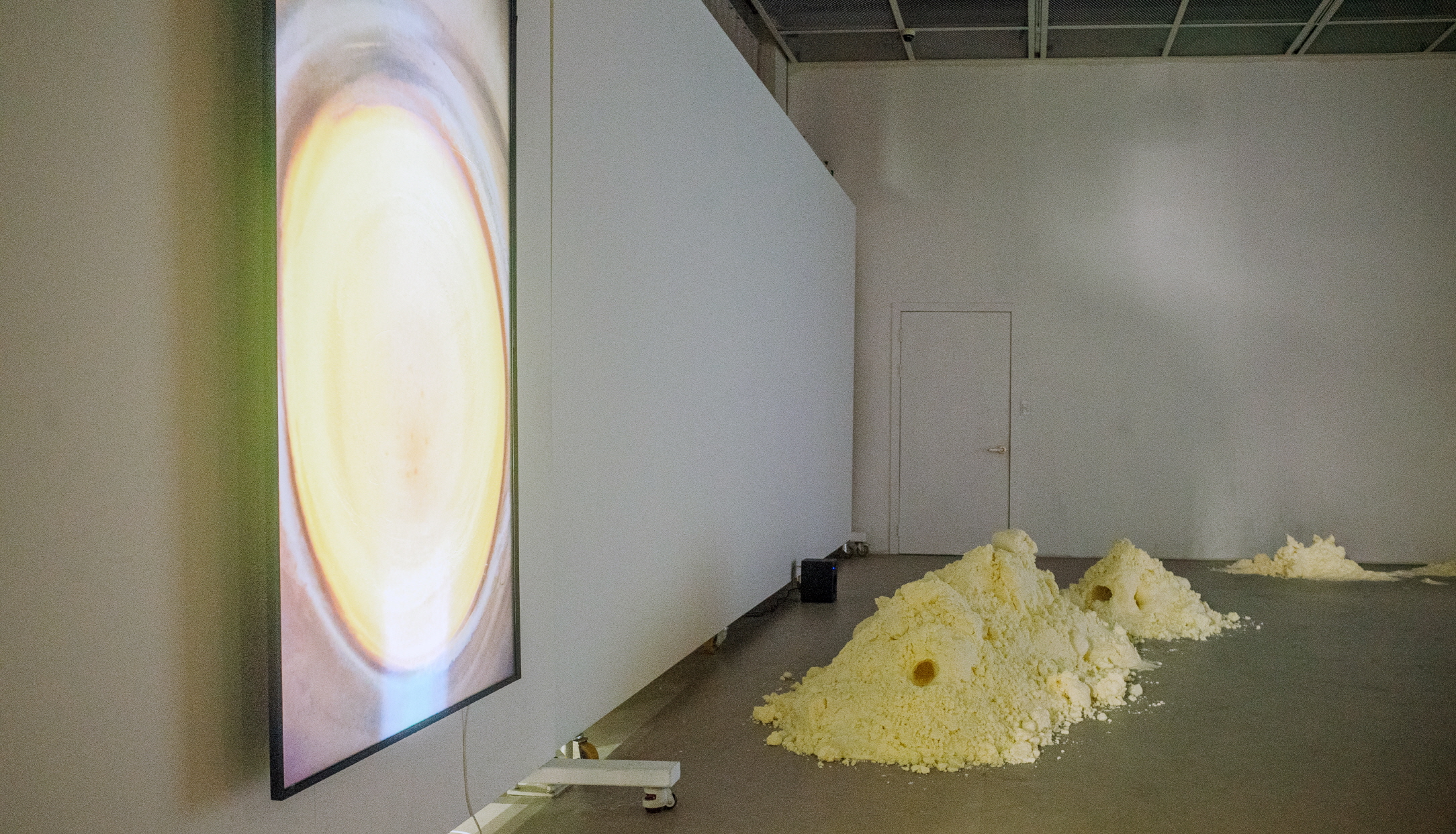 황효덕, 〈불멍〉(2022. 싱글채널 영상, 5분). 이제 가장 큰 부피의 두 작업을 지나면, 〈Frost Bite〉(2022. 싱글채널 영상, 14분 57초)가 전시장 깊숙이 전면에 들어온다. 반대편 벽의 〈불멍〉(2022. 싱글채널 영상, 5분)과의 사이에 〈달은 차고 산은 기운다〉(2021-2022. 옥수수전분, 미네랄 오일)―유일하게 구리의 소재와 구리를 연상시키는 소재가 사용되지 않았다.―가 끼어 있다.