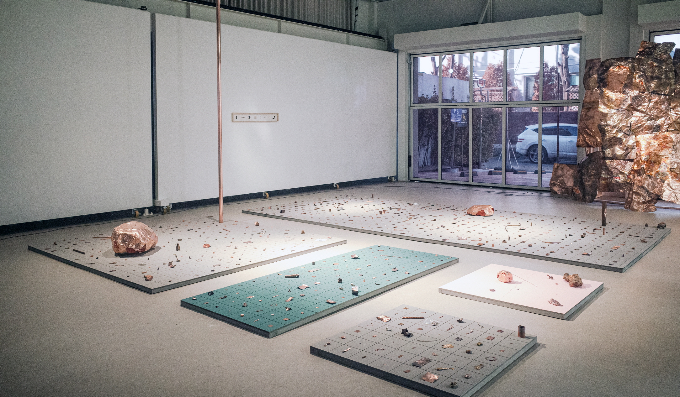〈용바위〉가 색, 바램, 평평함, 접힘, 주름, 입체의 여러 각과 기울기 등을 형성한다면, 〈구리 조각〉(2021-2022. 구리, 1024개.)은 수많은 구리로 만든 파편들이다. 그 자체로 도상이 아닌, 의사-도상이거나 도상으로부터 미끄러지는 어떤 잉여 또는 파편 같은 것들로, 일정 정도의 형태를 지닌다. 읽을 수는 없지만 네모난 칸에 병렬되면서―구리판이 그 자체로 윤곽까지를 포함하는 ‘전체의 변형들’이라면, 이는 임시 경계 안에 구획된 응결된 사물로서 자족성을 띤 전시품으로 놓인다.―, 그러한 파편들의 차이를 박물관적 아카이브의 계열체로 일관되게 수렴시킨다. 여기에는 하나의 빈칸에 들어간 QR 코드가 있고, 이를 따라가 작가의 작업에 대한 이야기를 살필 수 있다는 점에서, 메타-사물로서의 지위는 일련의 기간 단위로 분배하는 작업 과정을 아카이브하는 작가의 서사로 수용된다.