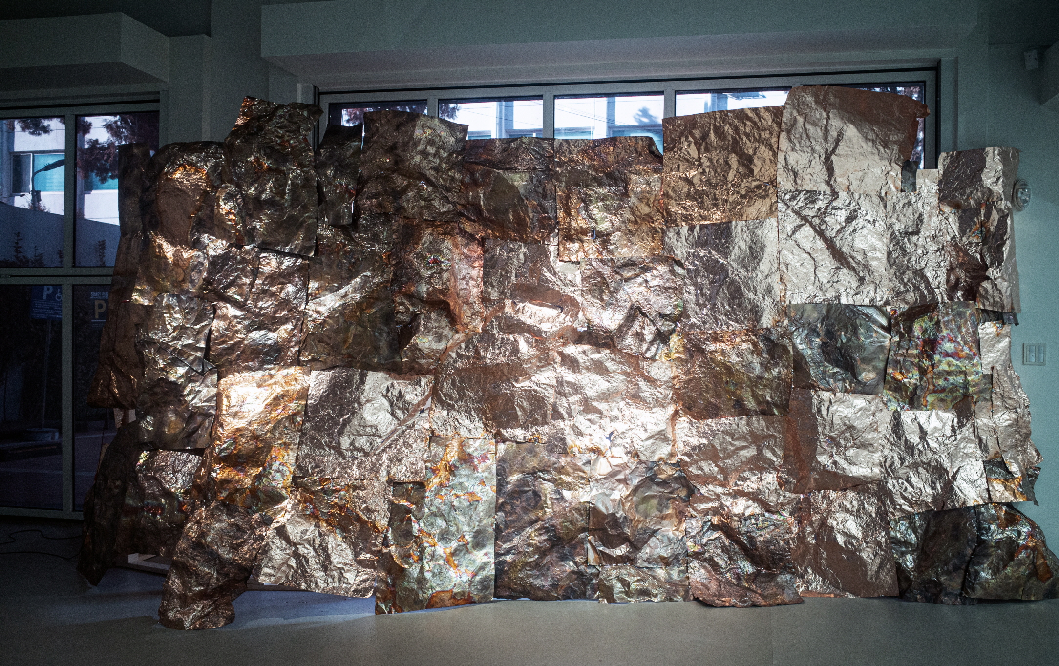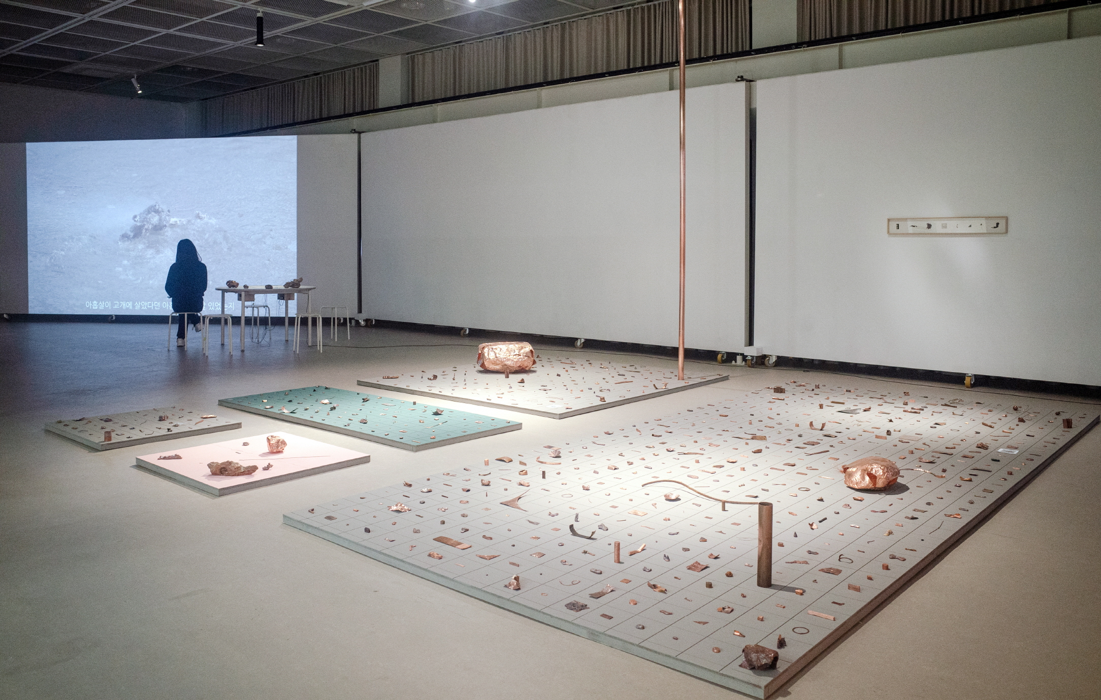 〈용바위〉가 색, 바램, 평평함, 접힘, 주름, 입체의 여러 각과 기울기 등을 형성한다면, 〈구리 조각〉(2021-2022. 구리, 1024개.)은 수많은 구리로 만든 파편들이다. 그 자체로 도상이 아닌, 의사-도상이거나 도상으로부터 미끄러지는 어떤 잉여 또는 파편 같은 것들로, 일정 정도의 형태를 지닌다. 읽을 수는 없지만 네모난 칸에 병렬되면서―구리판이 그 자체로 윤곽까지를 포함하는 ‘전체의 변형들’이라면, 이는 임시 경계 안에 구획된 응결된 사물로서 자족성을 띤 전시품으로 놓인다.―, 그러한 파편들의 차이를 박물관적 아카이브의 계열체로 일관되게 수렴시킨다. 여기에는 하나의 빈칸에 들어간 QR 코드가 있고, 이를 따라가 작가의 작업에 대한 이야기를 살필 수 있다는 점에서, 메타-사물로서의 지위는 일련의 기간 단위로 분배하는 작업 과정을 아카이브하는 작가의 서사로 수용된다.