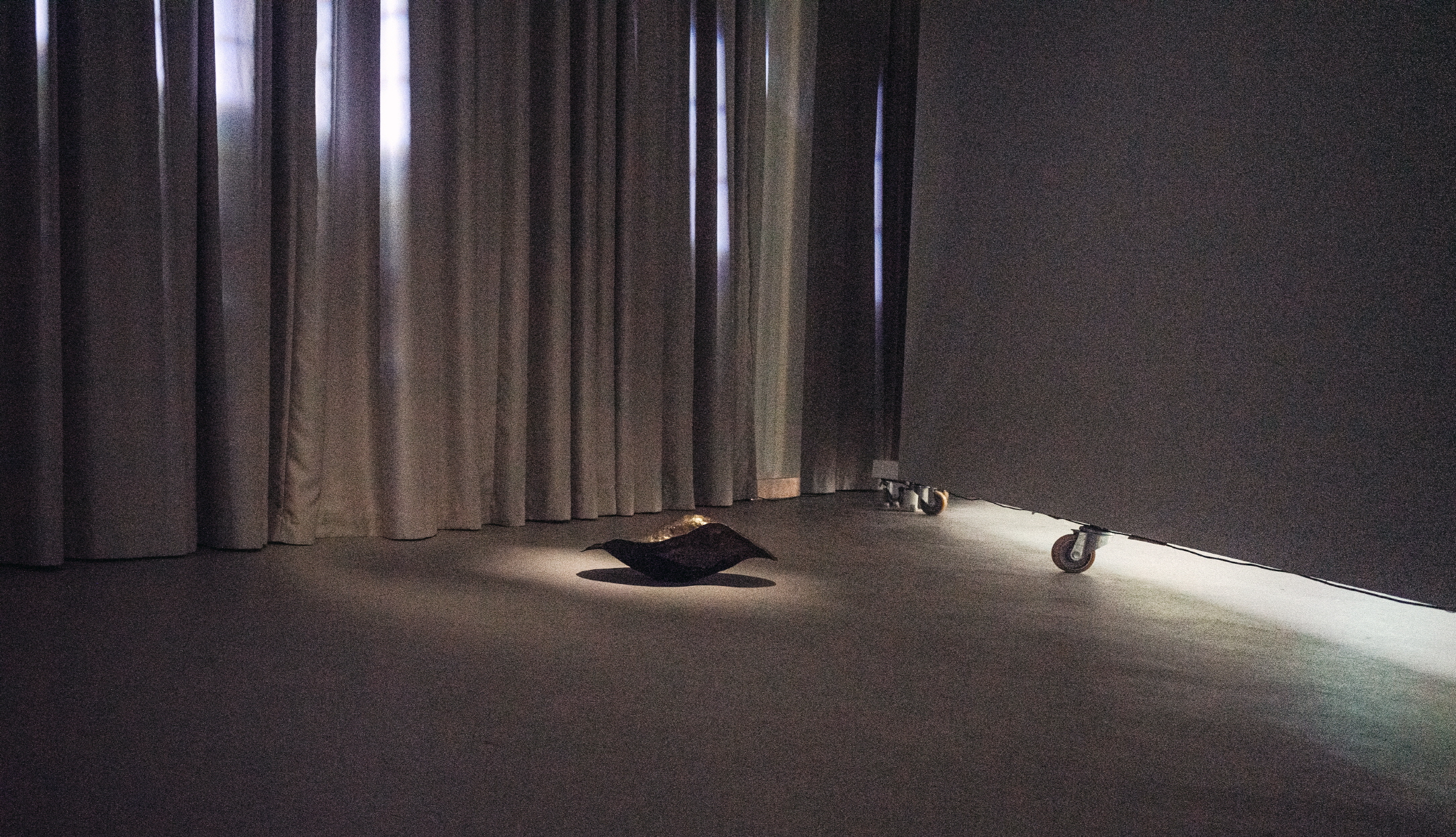 구리의 색감을 스펙트럼으로 확장해 일종의 추상 회화의 동적 변용을 구성하는 영상 작업, 〈불멍〉이 물질적 재료들의 가상-이미지의 도약이라면, 〈달은 차고 산은 기운다〉는 산 중턱을 통과하는 인제 터널의 미니어처식 재현인데, 이 전체를 뚫지 않는 일부 원기둥의 도상이 지닌 인공성은 그 일부만의 자취를 간직하는데, 이는 터널의 사실적 재현에서 미끄러지면서 스크린이 설치된 가벽 뒤의 설치―〈놋쇠 양동이〉(2022. 청동, 60×40×25cm)―를 지시하는 일종의 화살표 같은 도상으로 기능한다. 곧 몸이 그 곡선의 자취를 따르게 하면서 시각적인 이동의 표지를 간직한다. 이는 약간의 점도와 미세한 습도를 머금고 있어 무르고 (단단한 구리와 비교해) 연약한 인상을 준다.