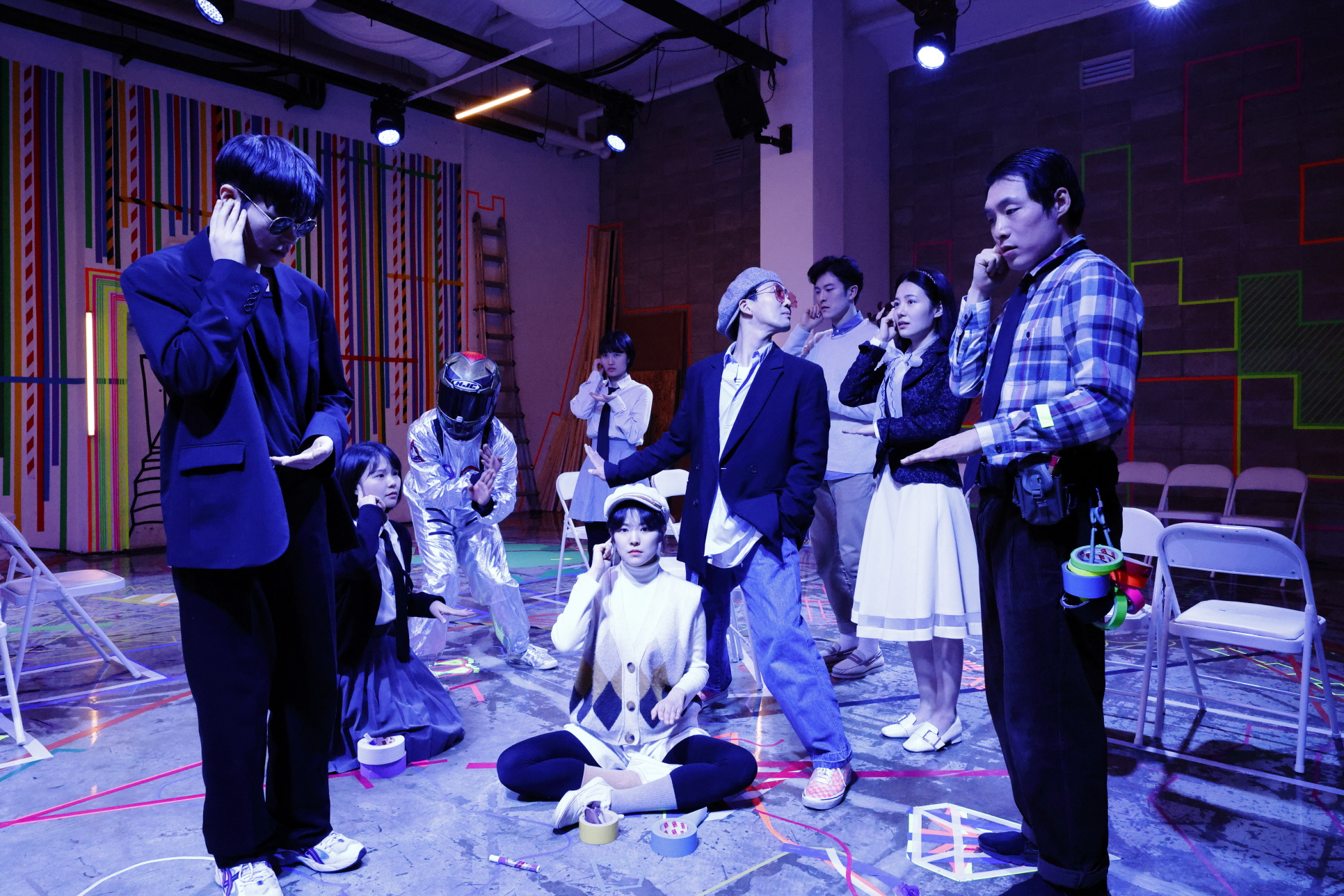 그리고 배우들은 공간을 유령처럼 떠돌며 극장 이전의 장소로 이곳을 설정하는데, 관객이 없는 극장, 공연이 열리지 않는 극장의 상황을 은유한다. 극장이 “연습실”로 설정된 이 상황에서, 관객 역시 유령이 되는 상황을 맞는데, 극장이 이미 발생했던 수많은 행위, 색 테이프가 가로지르고 온갖 낙서의 형상을 지닌 이 극장 공간 전체의 행위가 벌어진 시간으로 ‘회귀’하는 것이다. 이미 형성된 공간의 순수한 연장은 가능하지 않지만, 거기 위에 극장에의 염원을 기입한다. 여기에서 배우들의 발화와 낙서는 전혀 들리지도 보이지도 않는다.