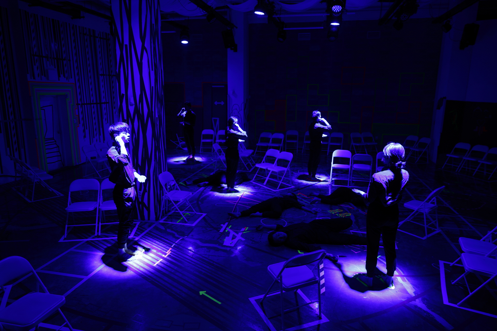 그리고 배우들은 공간을 유령처럼 떠돌며 극장 이전의 장소로 이곳을 설정하는데, 관객이 없는 극장, 공연이 열리지 않는 극장의 상황을 은유한다. 극장이 “연습실”로 설정된 이 상황에서, 관객 역시 유령이 되는 상황을 맞는데, 극장이 이미 발생했던 수많은 행위, 색 테이프가 가로지르고 온갖 낙서의 형상을 지닌 이 극장 공간 전체의 행위가 벌어진 시간으로 ‘회귀’하는 것이다. 이미 형성된 공간의 순수한 연장은 가능하지 않지만, 거기 위에 극장에의 염원을 기입한다. 여기에서 배우들의 발화와 낙서는 전혀 들리지도 보이지도 않는다.
