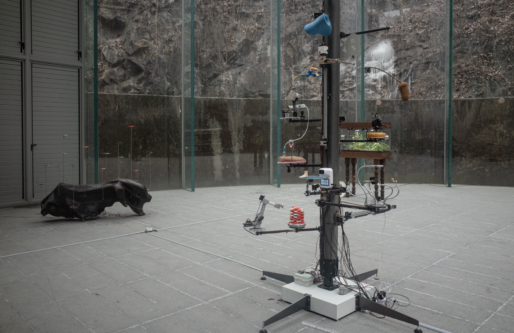 쳇바퀴처럼 지속하는 컨베이어벨트는 이 아상블라주된 인공물의 동력이자 외양의 주요한 상징적인 부분의 하나라고 할 수 있는데, 그것은 결국 전기가 꺼지면서 멈출 것이고, 모터의 수명을 다하면서 멈출 것이라는 점에서, 그것은 가까스로 도는 것이 맞다. 그럼에도 이러한 묘사―“가까스로 작동”―는 인간학적 유비가 아니라 그 반대의 측면이라는 점에서 조금 더 근원적이다. 곧 그 묘사는 기계들이 그 동력의 부족분을 갖고 있거나 원활하게 작동하지 않음을 의미하는 것이 아니라, 오히려 전기와 모터의 동력은 그럼에도 전시에서는 충분할 것이며 일정한 더딘 속도의 덜거덕거리는 지층은 예정된 것으로, 그 움직임은 인간-작가의 계산과 전용, 배치에 의한 결과물로서, 전적으로 인간의 재현이 아니라는 데서 오는 것이기 때문이다.