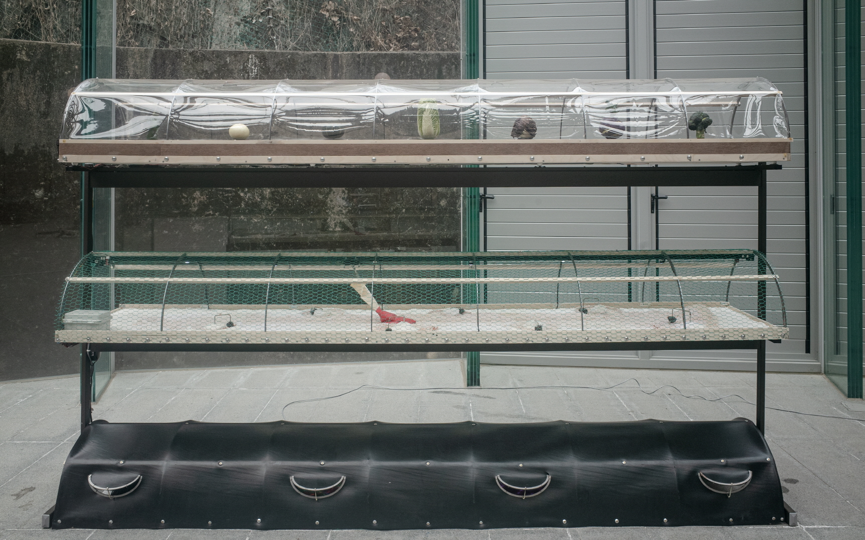 〈잡초의 자리〉가 스마트 팜 시스템의 일차적인 적용이자 장식물로서 온전한 하나의 단위를 이루는 데 반해, 〈워킹홀리데이〉는 생명이 두드러지는 한편, 의사-세계의 재현에 조금 더 초점이 맞춰진, 복잡성의 산물이다. 세 개의 층이 수직으로 분배된다. 가장 위층의 진열장에는 말라붙은 배추, 양배추 등의 채소가 한 칸씩 자리를 차지하고 있고, 소금 바닥의 중간층은 두 방식의 모터에 의해 두 가지 움직임이 만들어지는데, 제자리에서 원을 그리며 도는 여섯 개의 쓸림, 빨간 고무장갑이 전체의 좌우를 오가며 바닥을 스쳐 지나감이 그것이다. 후자의 ‘가까스로’ 가는 움직임이 인상적인데, 이는 파주 김치 공장에서 일하는 외국인 노동자들의 삶을 유비한다. 장갑 위쪽 갈고리와 바닥 사이의 유격은 간신히 끼어 있는 장갑의 지위를 조직한다. 가장 아래층은 안이 보이지 않는 검은색 비닐하우스이다. 상품과 농작물 사이에 인간의 노동의 형상이 끼어 있는 셈이다. (이 세 개의 층위를 아래로부터 실재계, 상징계, 상상계의 도식으로 나눠볼 수도 있을 것이다.) 타자로서 노동(자)의 존재론적 지위는 가장 아래층의 암묵적 층위, 블랙박스에 닿아 있다면, 중간의 노동은 현실적인 차원에서 그것이 일부 드러나는 것에 가깝다. 그리고 또 다른 노동에 의해 농작물은 상품으로 둔갑할, 곧 상상될 것이다.