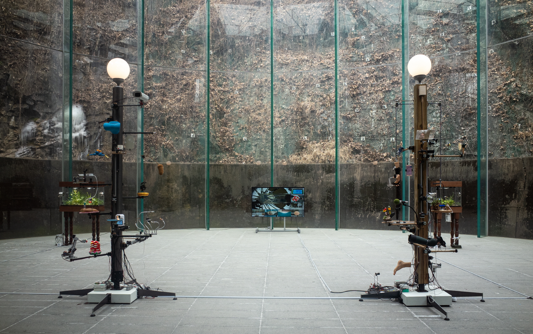 유화수, 《잡초의 자리》(2021.12.10~2022.1.9, 문화비축기지 T1 파빌리온) 전경. ⓒ김민관 유화수 작가의 《잡초의 자리》는 투명한 원형 파빌리온의 특성에 맞춰 수직적 위상을 지닌 작품 한 쌍을 일종의 미심쩍은 관문으로 전면 중앙에 세우고, 나머지 작업을 수평축으로 평행하게 분배한다. 좌우 대칭으로 〈SMART〉(2021. 180×50×150cm, 괴목, 드론 부품.), 〈워킹홀리데이〉(2021. 300×60×175cm, 나무, 철, 소금, 고춧가루, 모터, led, 가습장치, 팬, 채소.)가 위치하며, 그 뒤로 〈잡초의 자리〉(2021. 150×50×175cm, 80×50×175cm, 100×5×5cm, 스마트 팜 시스템, 잡초, 나무, 이끼.)가 분배된다. 이는 입구를 지난 이후의 본문에 해당할 것이다. 공간 가장 안쪽에는 CCTV가 자리하며 〈데이지와 이상한 기계〉(2021. 가변크기, 혼합재료.)에서 작동하는 세부들과 연결된 카메라의 영상들을 모두 담되 순차적으로 작은 화면들은 밀려나며 하나의 큰 화면에 다다른다.