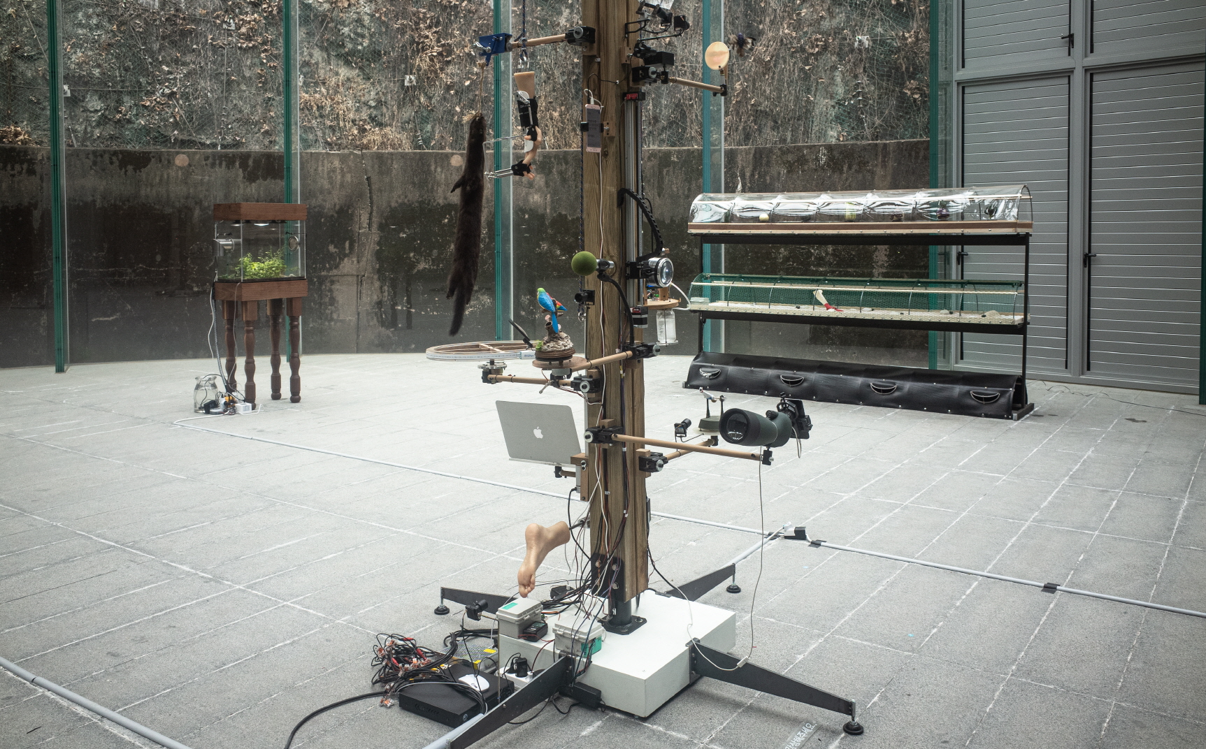 유화수, 사진 좌측부터 〈잡초의 자리〉(2021. 150×50×175cm, 80×50×175cm, 100×5×5cm, 스마트 팜 시스템, 잡초, 나무, 이끼.), 입구 정면에서 봤을 때 〈데이지와 이상한 기계〉(2021. 가변크기, 혼합재료.)의 오른쪽, 〈워킹홀리데이〉(2021. 300×60×175cm, 나무, 철, 소금, 고춧가루, 모터, led, 가습장치, 팬, 채소.). ⓒ김민관 거꾸로 매달린 ‘인형 얼굴-추’가 거울을 투과하며 확장된 이미지로 나오는 것에서부터 오른쪽 〈데이지와 이상한 기계〉는 그 아래 좌우의 방향으로 내려가며 마네킹 오른손에 장착된 물리치료나 재활훈련에 사용되는 손 자세교정기(좌)와 거울 앞의 새, 실시간 텍스트가 흘러나오는 스마트폰 스크린/매달린 수달 인형(좌)과 거울(우), 수음하는 마이크/인조 나무 위에 앉은 새(좌)와 아래에서부터 물병이 연결된 화분, 망원경과 재주 넘는 인형/노트북(우), 그리고 발 등이 자리한다. 노트북-마이크-스마트폰은 하나의 단위를 구성하는데, 노트북은 김초엽 작가의 SF 소설을 독일어로 번역하는 프로그램이 가동 중이고, 이는 음성 지원으로 연장돼 마이크에 수음되고 동시에 화면으로 분절된 단어들이 의미 변용을 이루는 중이다.