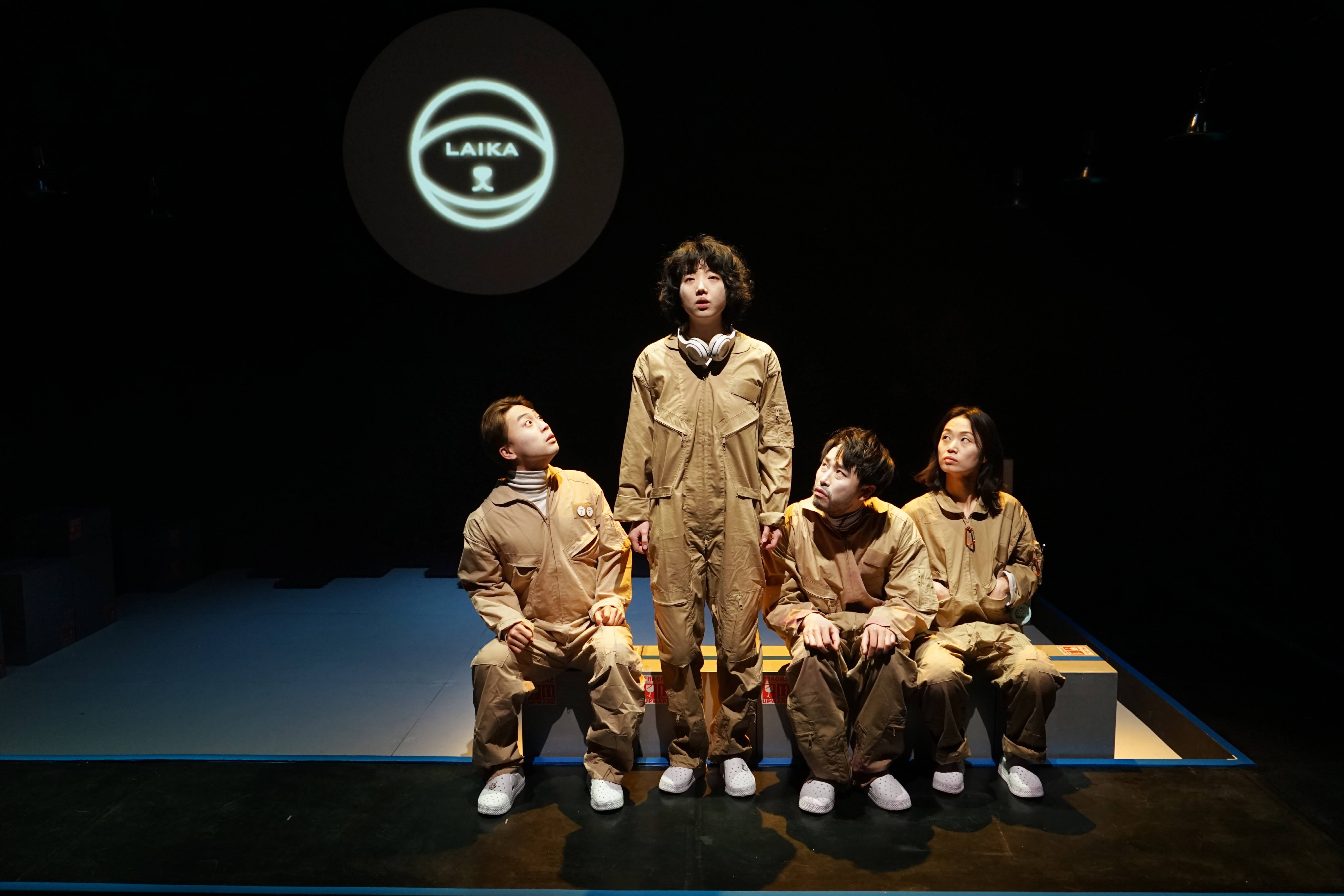 극작_신효진, 연출_임성현, 〈머핀과 치와와〉 ⓒ황가림[사진 제공=신효진](이하 상동). 사진 좌측부터, 자자 역_김의태, 니키 역_이세영, 도루 역_조의진, 사가 역_한혜진. 〈머핀과 치와와〉는 미래 문명의 단면을 ‘라이카’라는 인공지능의 통제 아래 작동하는 단일한 시스템―사각형의 가를 두른 검은 고무판을 하나같이 종종걸음으로 이동하는 배우들은 컨베이어벨트를 따라 이동하는 시스템의 부속으로서 자리한다.―으로 전제한다. 문학적 인간과 새로운 생명력을 가진 존재로의 변이는 이 시스템으로부터 삐져나온 인간적인 무엇, 문학적인 무엇을 보여주지만, 이 같은 존재들은 반동적이거나 체제 위협적인 존재가 아니다. 그들은 체제의 예외적 존재로 자리할 때 그 체제로부터 읽히지 않거나 증발하거나 죽는 존재에 그친다. 시스템에 대한 독해는 그다지 매력적이지 않을뿐더러 작업의 초점을 벗어난다. 시스템은 일종의 기능적인 표면에 불과하다. 라이카는 강력한 통치 장치 역시 아닌데, 타자가 아니라 자아의 연장이거나 모방 정도로 취급될 수 있다.
