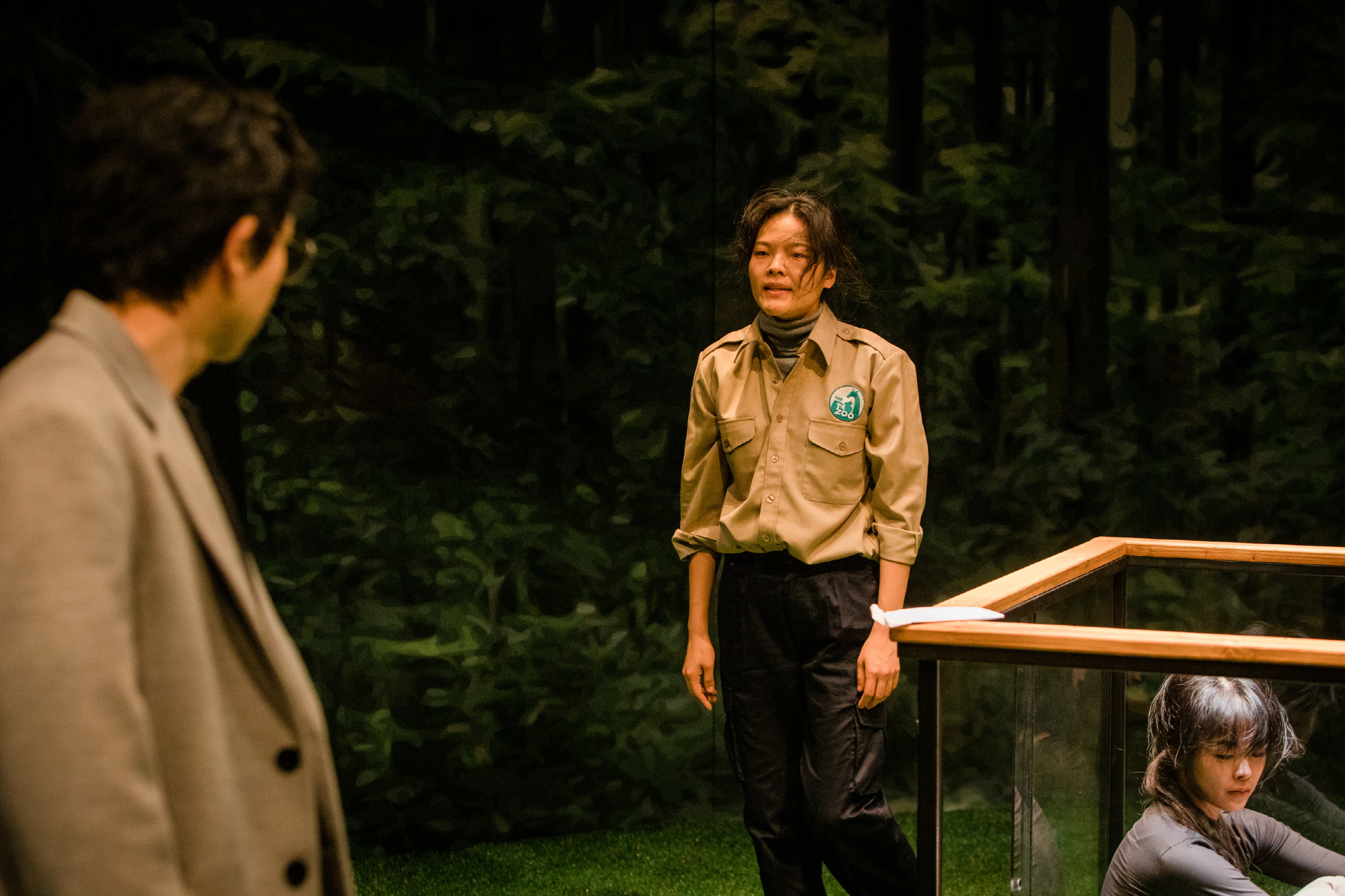 에필로그: 한 번 더 반복한다면사진 왼쪽부터 변승록, 강서희, 하영미 배우. 소진은 아무도 없는 다른 사회에서 시작한다. 그것은 자기와 특별한 관련이 없는 사회라는 점에서 무인도와 같다. 이러한 변경의 부조리함은 그의 성폭력 및 2차 가해의 환경으로 그치지 않고 소진에게도 일부 해당한다. 그는 어떤 자신으로 이러한 부조리한 사회에서 무기력한 역량을 가시화할 직업을 선택하는가. 동물에 대해 전문적으로 알거나 다룰 수 없을 때 그 선택은 윤리적인 것인가. 동물의 언어를 설명해줄 수 있는 사람은 외부의 수의사 정도이다―이를 외부에서 자기 돈으로 부르는 것의 윤리에 대응해 처음부터 이 직장을 선택한 것의 윤리 역시 크게 보면 문제가 된다. 동물(원)이 하나의 은유이자 당위라는 점과 별개로, 그곳이 동물원이라는 조건의 현실 층위를 구성하기 위해서는, 또는 그것을 비판하며 벗어나기 위해서는, 실내 동물원의 특정한 조건에 대한 매개 외에도 동물(원)에 대한 언어, 곧 동물학적 지식을 적극적으로 수용했어야 하지 않을까. 반면 〈탈피〉는 조금 다른 언어들의 층위를 가정하는 듯 보인다.