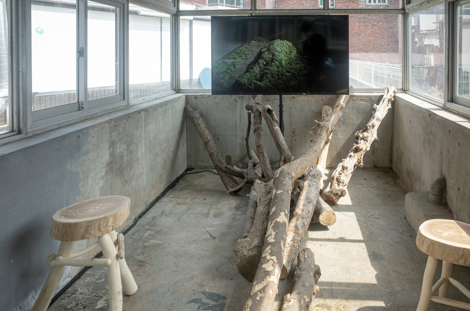 오선영, 〈Terrarium〉(2021. 싱글 채널 비디오, 설치, 00:40:00.). 오선영 작가는 자신의 신체를 배경 일부로 만들며 전면에 드러내는 퍼포먼스와 영상 작업을 선보인다. 초록 식물 위에 그것으로 덮이는 신체를 보여주는 〈Terrarium〉(2021. 싱글 채널 비디오, 00:40:00.)―테라리움, 밀폐된 유리그릇에 구현한 작은 정원의 뜻―과 흙탕물과 식물에서 몸을 뒤척이는 〈Paludarium〉(2022. 싱글 채널 비디오, 00:30:00.)―팔루다리움, 습지 생태계를 인공적으로 조성한 공간―모두 잠이 들며 그 환경 자체가 된다. 눈을 껌뻑이며 카메라를 바라보는 장면 역시 공통되는데, 이는 관계를 맺을 수 없는 친밀하지 않은 타자의 형상을 취하는데, 인간으로 판별하기 힘든 다른 의식을 가진 존재가 강조되는 것이다. 봄로야의 작업이 인간 의식에 틈입하는 자연의 형상과의 정서적인 연대를 포착한다면, 오선영의 작업은 자연으로부터 인간의 탈형상에 직면하게 한다. 오선영은 기꺼이 자신의 몸을 환경에 내어주면서 그 신체에 직면할 것을 요청한다.