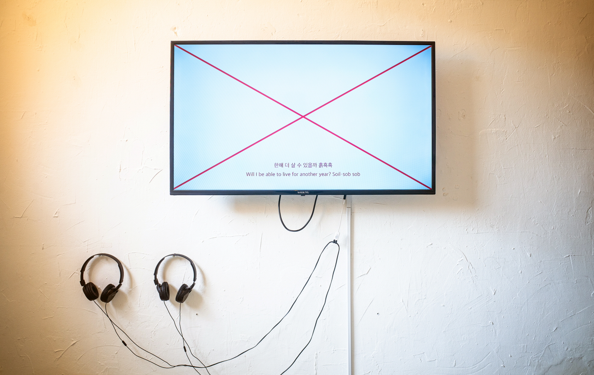 우희서 작가의 〈Bad breath - 탐지도구〉(2022. 호박, 휴대폰, 아크릴, 헤드셋, 가변 설치.). 우희서 작가의 〈Bad breath - 탐지도구〉(2022. 탐지도구, 호박, 휴대폰, 아크릴, 헤드셋, 가변 설치.)는 아마도예술공간의 자투리 공간 같은 공간을 아크릴로 양옆 가벽을 치고, 공간 벽과 연결된 무릎 높이의 타일에, 엎어 놓은 두 개로 분할된 헤드폰으로 서로 다른 소리를 듣게 하는데, 헤드폰 자체가 해체되어 떠돌아다니는 신체인 것처럼 관객의 수용에 의해 가변 설치로 위치하게 된다. 그것은 소리를 듣지 못하게끔 뚜껑처럼 바닥과 붙어 있지만, 달리 말하면 엎어진 가운데 미세하게 소리가 새어 나온다. 그것은 공간에의 작은 반향에 가깝다. 닫힌 소리를 거슬러 능동적인 관람을 통해 이 소리를 택하면 그것은 어떤 데이터에 대한 읽기로의 변환 자체로만 수용된다. 어떤 좌표 혹은 시간에 대한 측정을 지시하는 이러한 음성은 역설적으로 장소에 대한 인지를 무화시킨다.