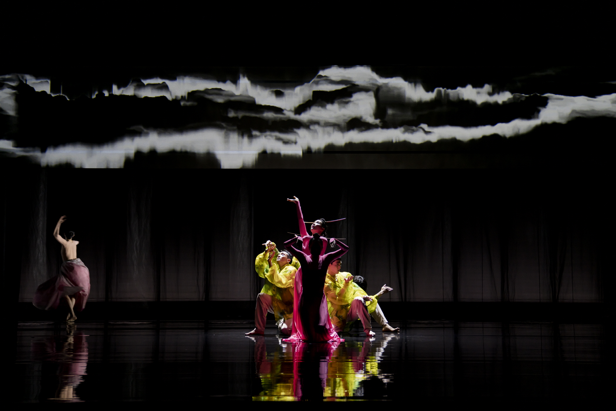 또 다른 〈몽유도원무〉의 막은 종으로 펼쳐지는 일종의 병풍과 같은 막이다. 여기에는 프로젝션이 투사되기도 하고 또 그렇지 않기도 하며, 후자의 경우에, 불투명하게 움직임에 덧씌워지는 프레임으로 적용된다. 이러한 막의 존재와 함께 무용수들은 나타나고 사라지기를 반복하며, 앞선 길의 서사 역시 그친다. 한편으로 무대에 투입된 심은용의 거문고가 한 현씩 무대에 투척되며 서사의 기조가 달라짐을 분명하게 나타내는데, 이는 앞서 말한 것처럼 무용수 한 명 한 명을 일종의 원색 계열로 ‘보정’하며 일종의 스크린 안의 이미지로 이를 전유하는 안무 전략과 맞닿는다. 하임의 전자음악이 전반적으로 공연 아래에 깔려 있는 반면, 〈신선〉과 다르게 〈몽유도원무〉는 음악 사이의 경계를 시험하기보다 차라리 음악 자체의 존재론적 지위를 드러내는 데 초점을 맞추는데, 심은용의 움직임이 그러하다.