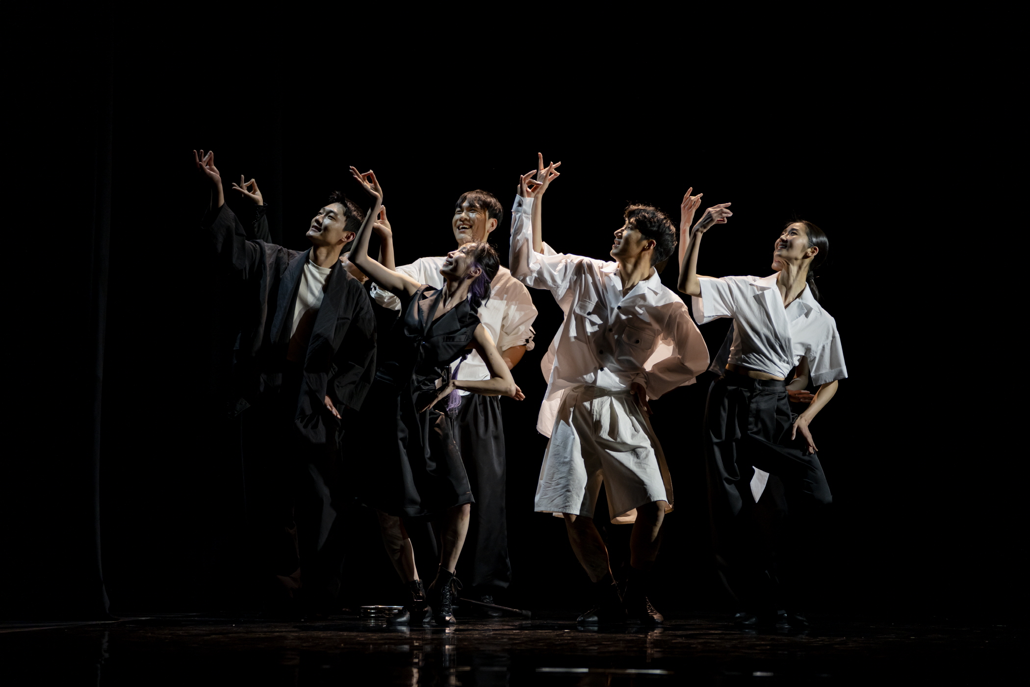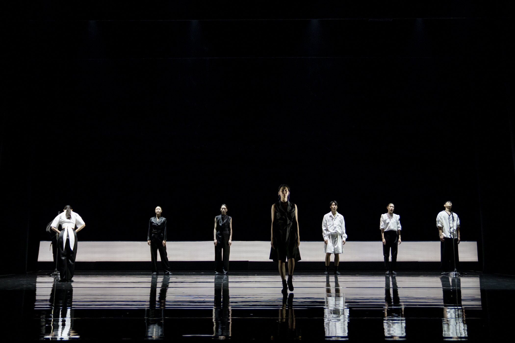 차진엽 안무/연출, 〈몽유도원무〉[사진 제공=국립무용단] 국립무용단의 《더블빌》은 색채가 다른 젊은 외부 안무가를 초대해 하루에 두 다른 무대를 선보이는 식으로 기획되었으며, 활발하게 동시대 무용 신에서 활동 중인 고블린파티와 차진엽 안무가가 각각 안무한 〈신선〉과 〈몽유도원무〉 두 작업으로 구성됐다. 공연이 오른 국립극장 달오름극장은, 중극장 규모로서 그리 크거나 깊지 않게 보였는데, 이는 두 공연 모두 많은 무용수가 출연하고 움직임이 많고 다양하며 무대의 동선을 활발하게 사용하기 때문이다. 무대의 특징이라면, 움직임을 연장하는 글로시한 바닥 자체에 있는데, 〈몽유도원무〉의 경우 두 개의 막을 순차적으로 활용해 단조로운 무대에 변화를 준다.