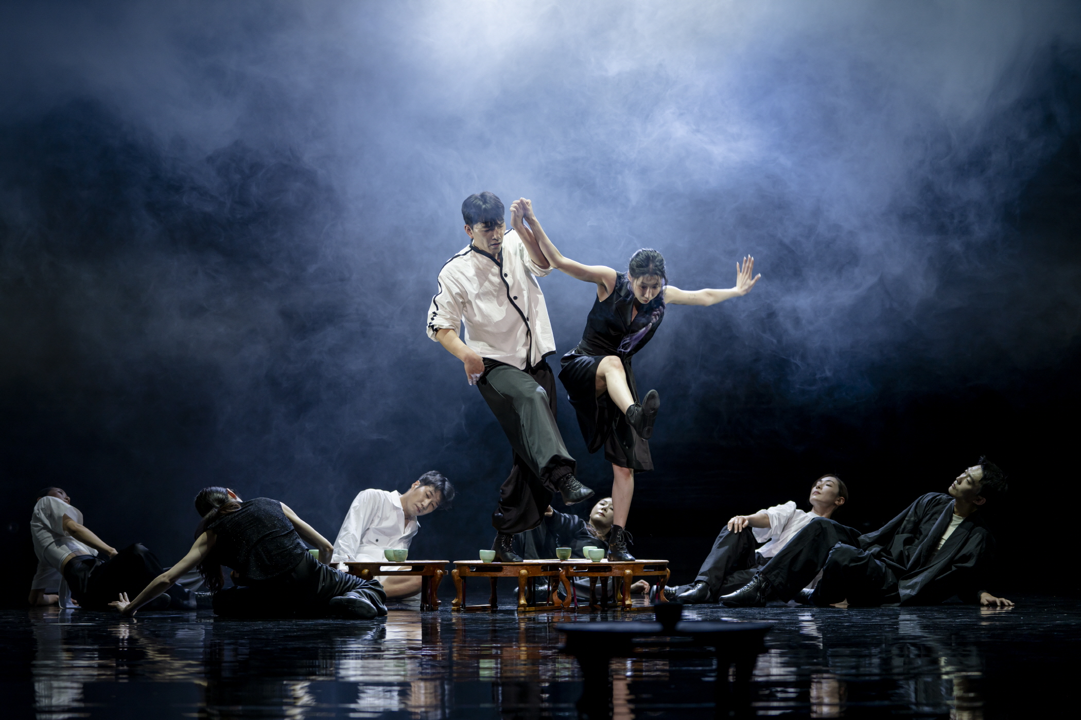 고블린파티 안무, 〈신선〉[사진 제공=국립무용단](이하 상동) 수평으로 서서 술을 건네고 마시는 관계와 자장과 두 다리를 한쪽으로 포개 술을 먹는 비뚜름해진 포즈는 각각 〈신선〉의 음주가 시작되고 마지막을 장식하며, 신선놀음의 서사적 맥락을 구성하는 주요한 장면들이다. 고블린파티는 중간중간 전통적인 술자리보다는 현대의 재현상으로서 이를 연출하는데, 이는 현대에 전통을 접목하는 데 있어 일부 변용된 현대의 모습을 통해 전통을 손쉬운 공통의 것으로 추출하는 것이라 할 수 있다. 오히려 이런 서사의 내용 자체보다는 어떻게 움직임이 특이한 경계에서 작동하는지가 조금 더 주요한 관점의 대상이 된다.