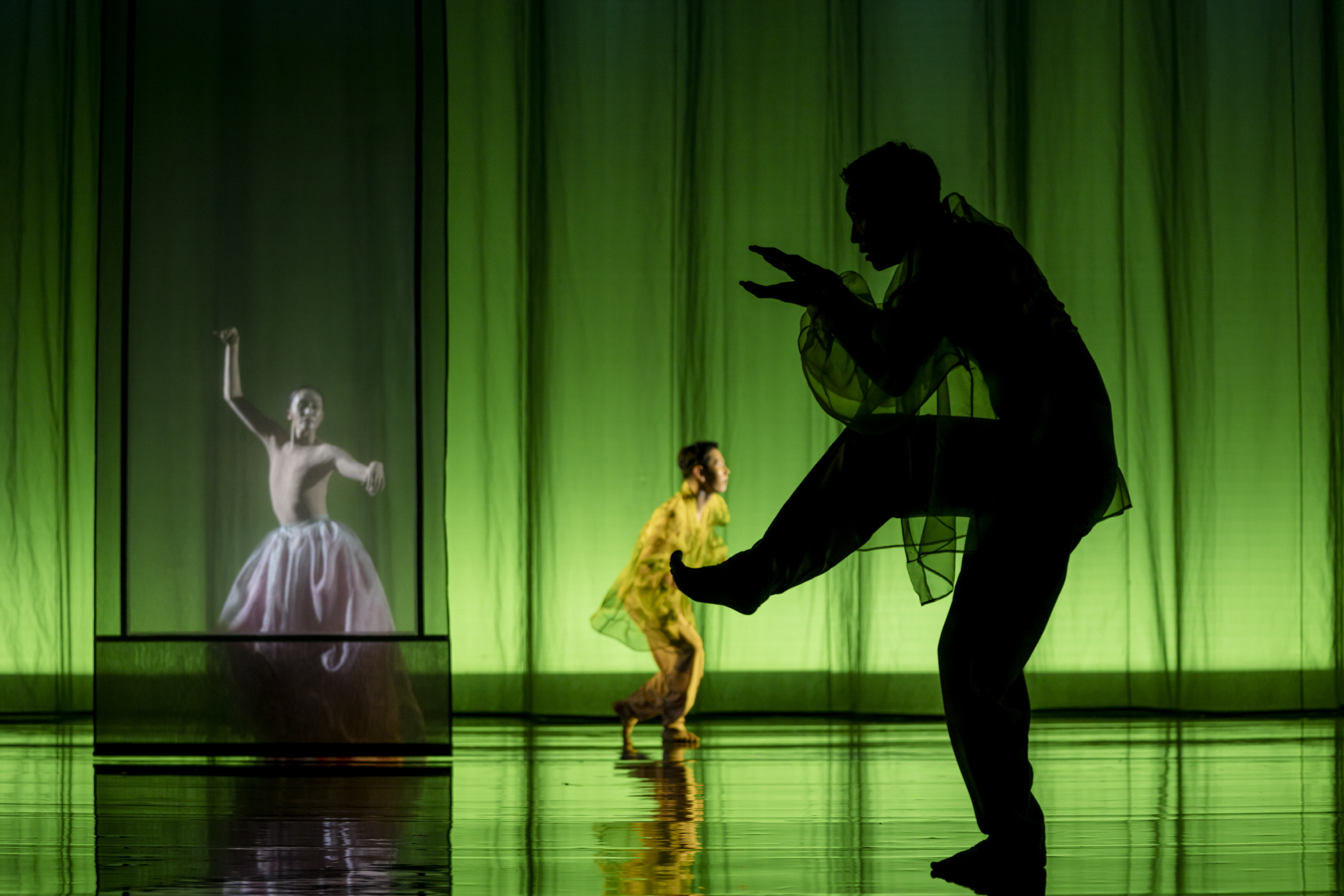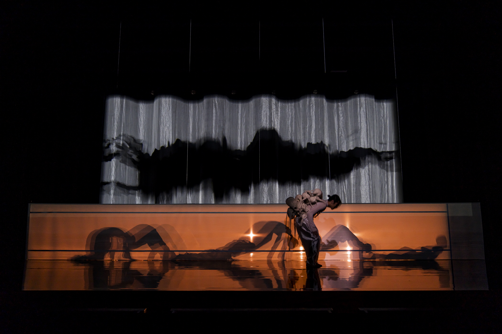 또 다른 〈몽유도원무〉의 막은 종으로 펼쳐지는 일종의 병풍과 같은 막이다. 여기에는 프로젝션이 투사되기도 하고 또 그렇지 않기도 하며, 후자의 경우에, 불투명하게 움직임에 덧씌워지는 프레임으로 적용된다. 이러한 막의 존재와 함께 무용수들은 나타나고 사라지기를 반복하며, 앞선 길의 서사 역시 그친다. 한편으로 무대에 투입된 심은용의 거문고가 한 현씩 무대에 투척되며 서사의 기조가 달라짐을 분명하게 나타내는데, 이는 앞서 말한 것처럼 무용수 한 명 한 명을 일종의 원색 계열로 ‘보정’하며 일종의 스크린 안의 이미지로 이를 전유하는 안무 전략과 맞닿는다. 하임의 전자음악이 전반적으로 공연 아래에 깔려 있는 반면, 〈신선〉과 다르게 〈몽유도원무〉는 음악 사이의 경계를 시험하기보다 차라리 음악 자체의 존재론적 지위를 드러내는 데 초점을 맞추는데, 심은용의 움직임이 그러하다.