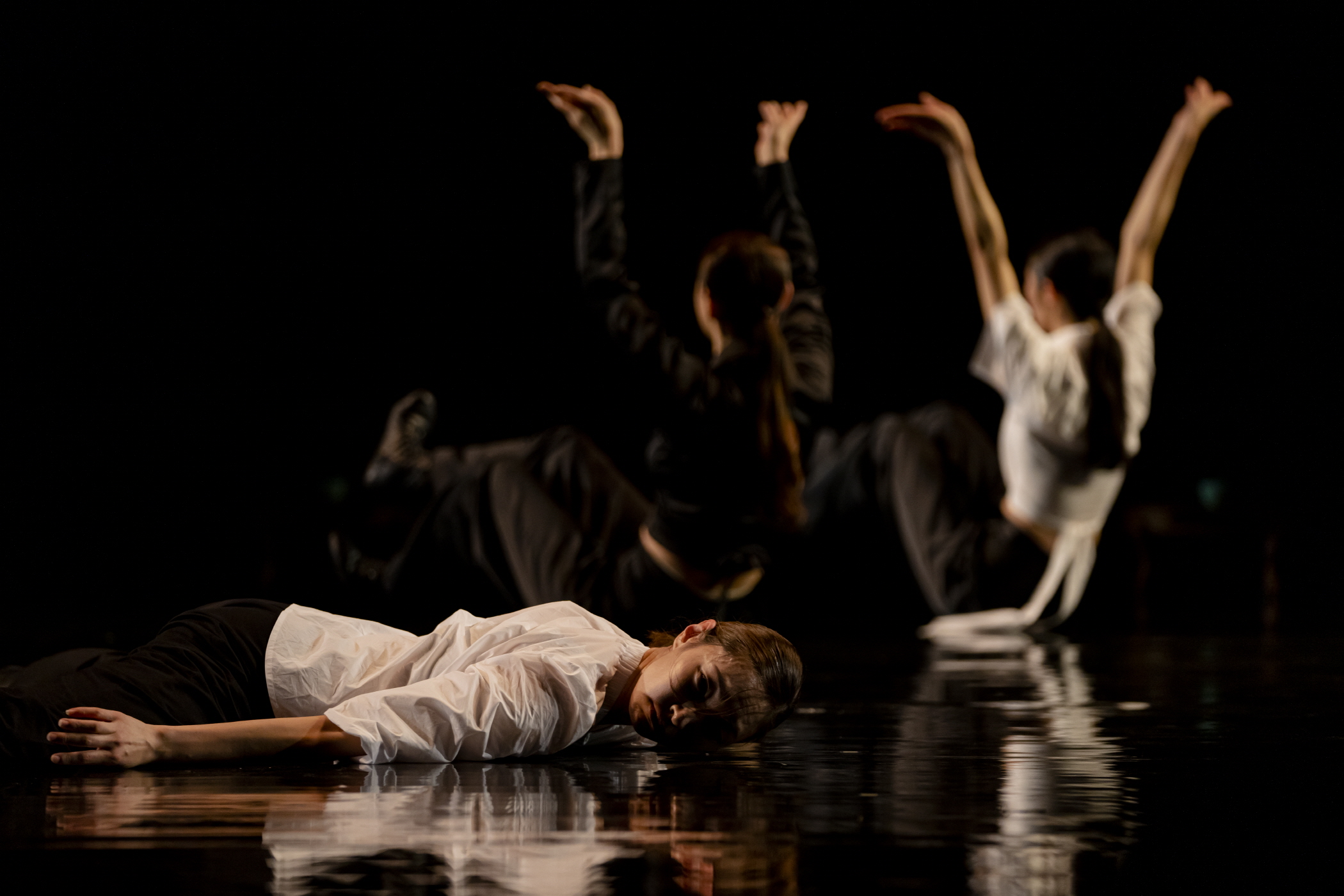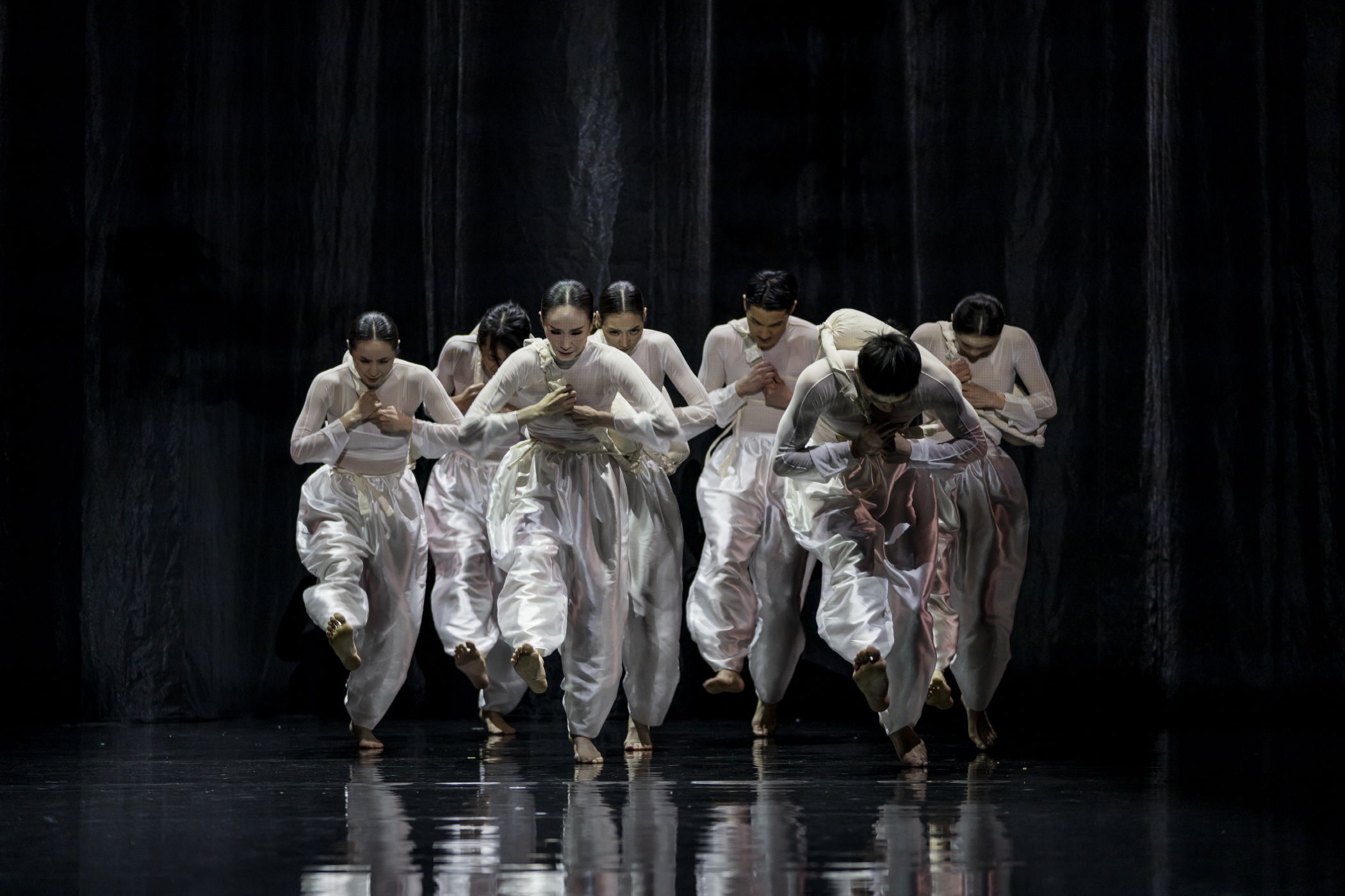 차진엽 안무, 〈몽유도원무〉[사진 제공=국립무용단](이하 상동) 〈몽유도원무〉는 무대를 일종의 스크린으로 두는 관점이 전제된다. 매체적인 차원은 평면 디스플레이 TV 광고의 전유물 같은 무대 구현에 무용수들을 일종의 입체적인 선분과 색감으로 분해하는 것을 의미한다고 할 수 있다. 처음 장막이 무대 전면 하단에 내려온 상태에서 무용수들은 일종의 그림자극을 선보인다. 덩어리로 뭉친 몸들은 선분과 음영의 변화로 나타나고, 무대 깊숙한 하단 조명이 번갈아 바뀌는 것에 따라 그룹 일부가 갑자기 나타나고 또 갑자기 사라지는 착시 효과를 일으킨다. 몸을 이미지로 바꾸는 매체 환경은 마지막 장면에서 한 번 더 반복된다―처음의 막 역시 똑같이 내려온다.