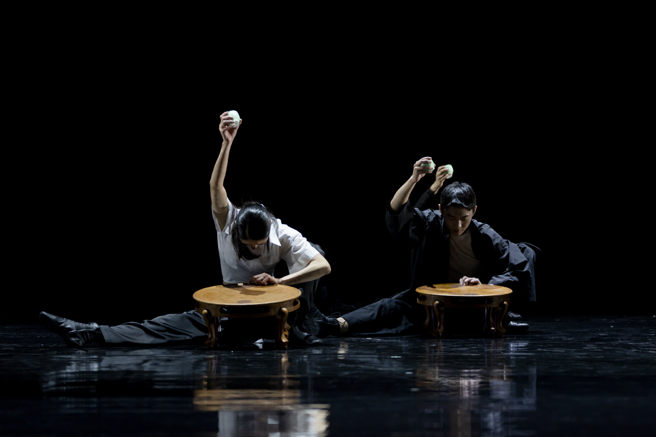 고블린파티 안무, 〈신선〉[사진 제공=국립무용단](이하 상동) 수평으로 서서 술을 건네고 마시는 관계와 자장과 두 다리를 한쪽으로 포개 술을 먹는 비뚜름해진 포즈는 각각 〈신선〉의 음주가 시작되고 마지막을 장식하며, 신선놀음의 서사적 맥락을 구성하는 주요한 장면들이다. 고블린파티는 중간중간 전통적인 술자리보다는 현대의 재현상으로서 이를 연출하는데, 이는 현대에 전통을 접목하는 데 있어 일부 변용된 현대의 모습을 통해 전통을 손쉬운 공통의 것으로 추출하는 것이라 할 수 있다. 오히려 이런 서사의 내용 자체보다는 어떻게 움직임이 특이한 경계에서 작동하는지가 조금 더 주요한 관점의 대상이 된다.