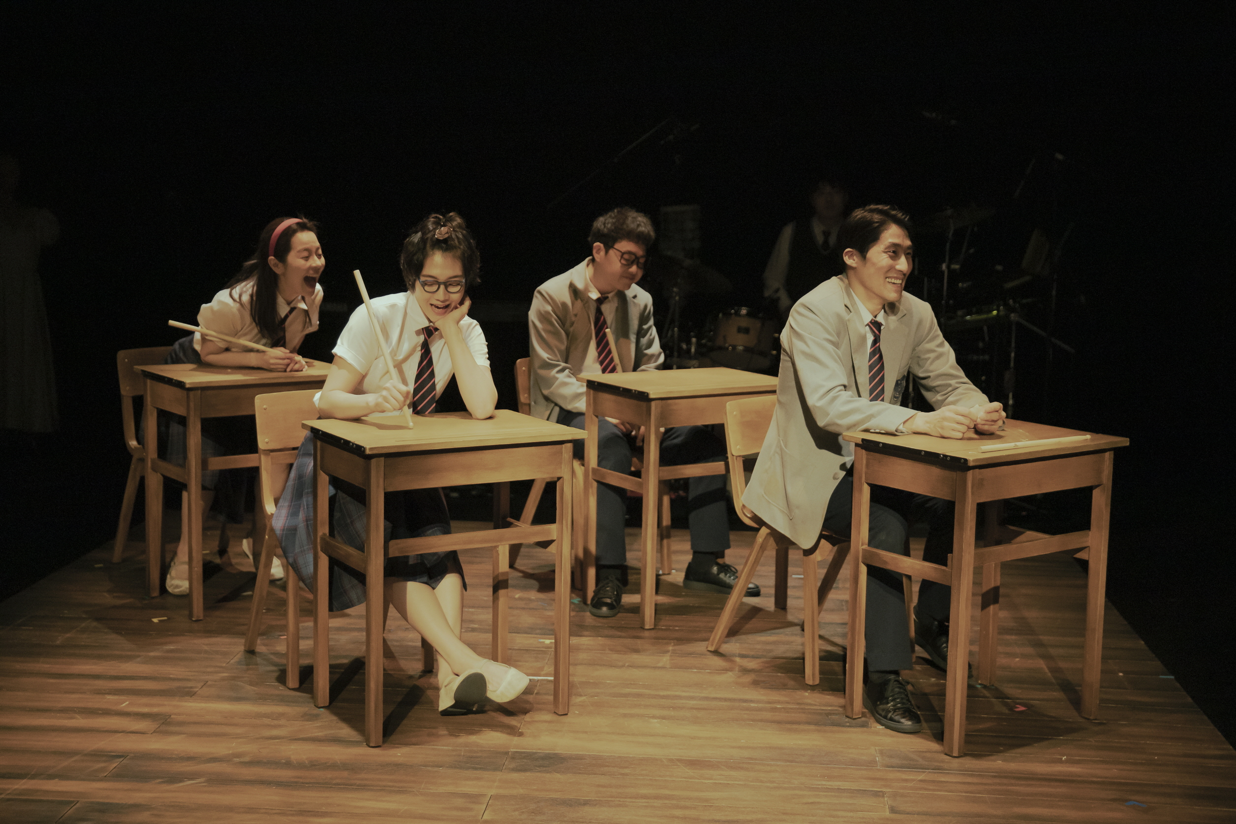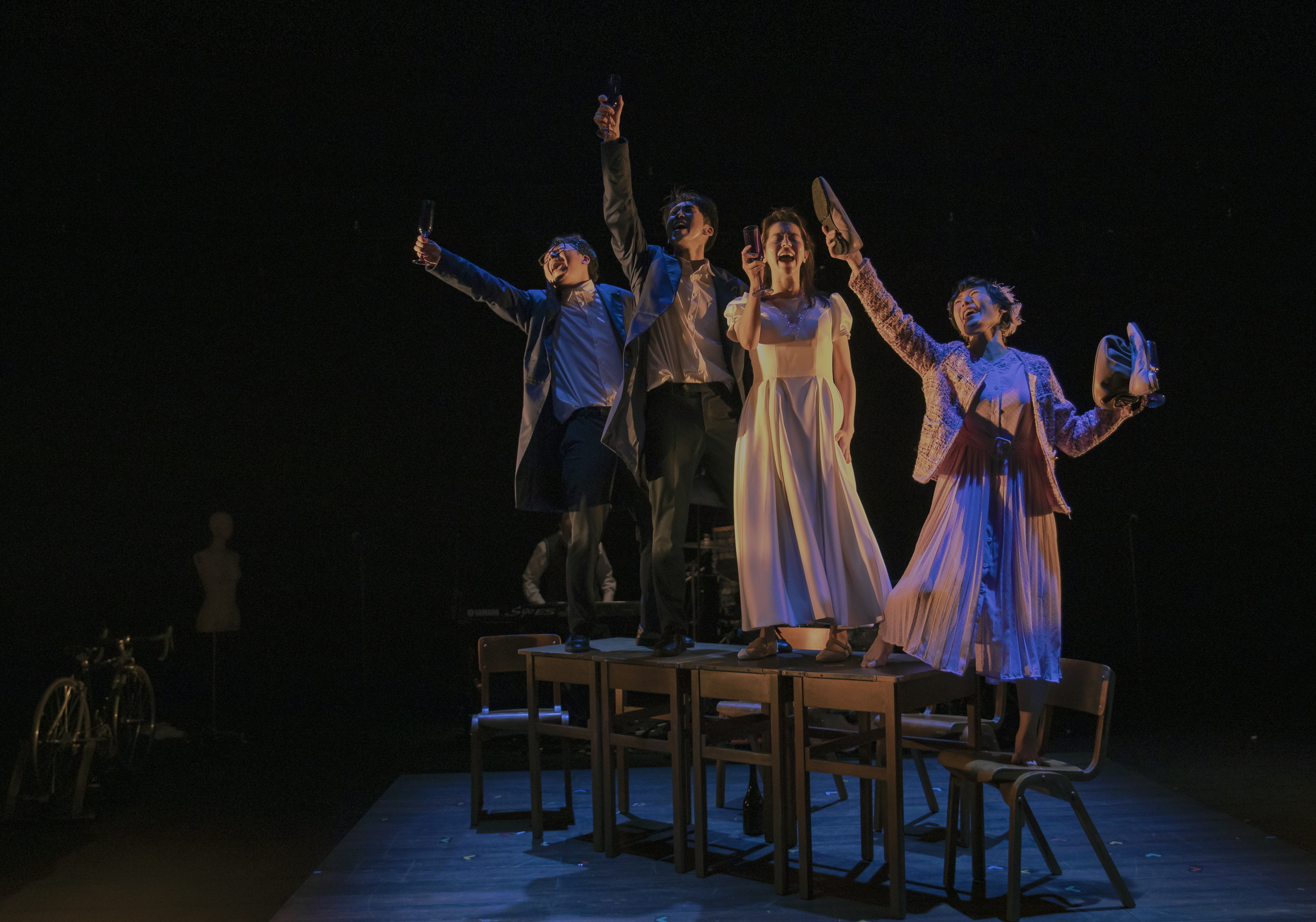 처음 재킷과 빨간 넥타이를 챙겨 입으라는 딸의 말을 듣고 탐이 교복을 입는 순간, 드럼에 달린 심벌즈가 쫘르륵 울린다. 여기서 사운드는 긴장을 불러일으키는 것과 함께 기억의 뒷공간, 곧 실제 무대 위의 또 다른 무대가 펼쳐지는 기제로 작용하며, 물리적으로 또한 감각적으로 더 깊숙하게 잠겨 들어가는 효과를 수행한다. 현재와 달리 과거는 이렇게 무대 위의 정방형 단상 안에서 펼쳐진다는 차이를 갖는다. 옷은 그 경계에서 과거로 들어가는 매개체가 된다. 이 옷들을 과거의 등장인물들이 다 천장으로 집어 던지며 톰은 현재로 돌아오게 된다.