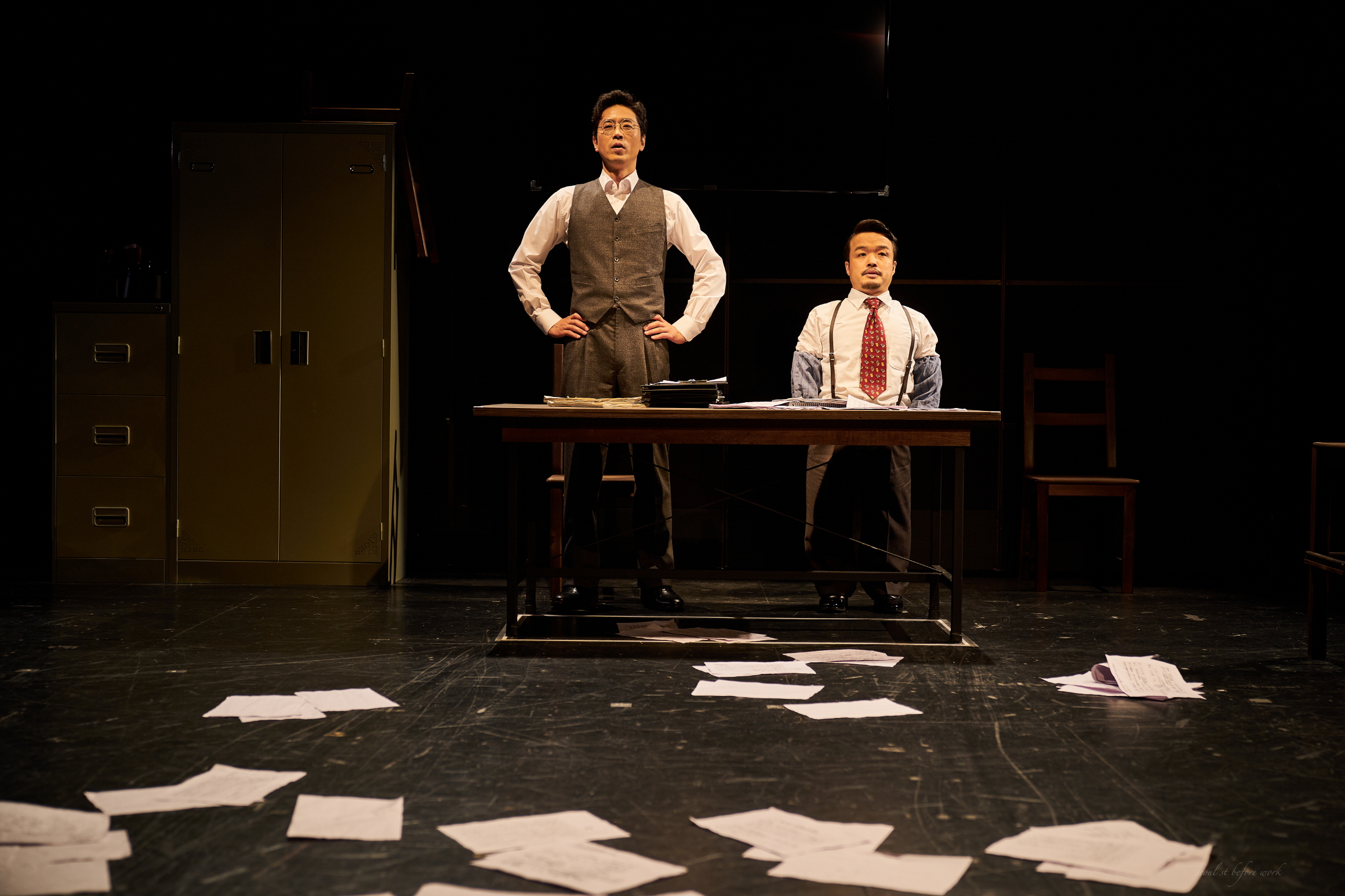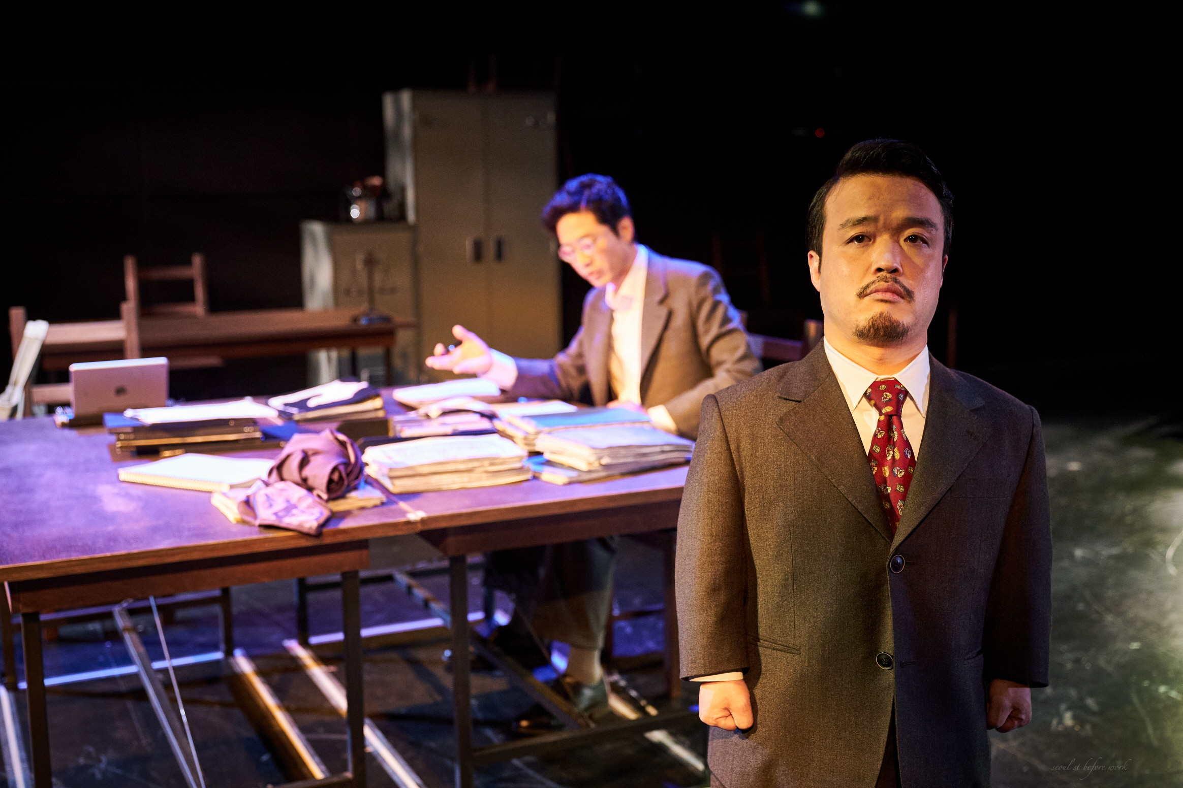 연극 〈당선자 없음〉[사진 제공=두산아트센터](이하 상동). 사진 왼쪽부터 최상영 역의 배우 이윤재, 윤길상 역의 신강수 배우. 〈당선자 없음〉은 제헌헌법이 창립한 경위를 문학적 상상력을 통해 추적해 나가며, 현재를 구성하는 이념의 한 구조적 토대가 되는 헌법의 계보를 가시화함으로써 소수의 자의적인 입법 과정과 그 이후를 사회적 합의가 전제되지 않은 현재로 연장한다. 곧 헌법의 계보학을 좇는 〈당선자 없음〉은 법의 기원을 본질적인 정의의 이념으로 구성하는 대신 외설적인 흔적을 누출한다. 그것은 물론 당대의 영향 아래 있으며, 나아가 자의적이고 우연적이다. 일제강점기에서 해방으로 넘어가는 시기에 법 관련한 전문가는 전자의 친일파에 속해 있을 수밖에 없을 것이다. 역사를 무대로 상연하는 자리에서, 그들―최상영_배우 이윤재과 그를 돕는 윤길상_신강수 배우―은 새로운 해방 정국에서 잔뜩 움츠러든 채 죄인으로서, 입법의 예외적인 역량을 가진 전문가인 동시에 일단의 권력의 네트워크를 가진 자로서 새로운 나라를 위한 헌법 초안을 만든다는 어떤 신념을 실행으로 옮기는 시간을 통해, 처벌받을 미래의 시간을 유예한다.