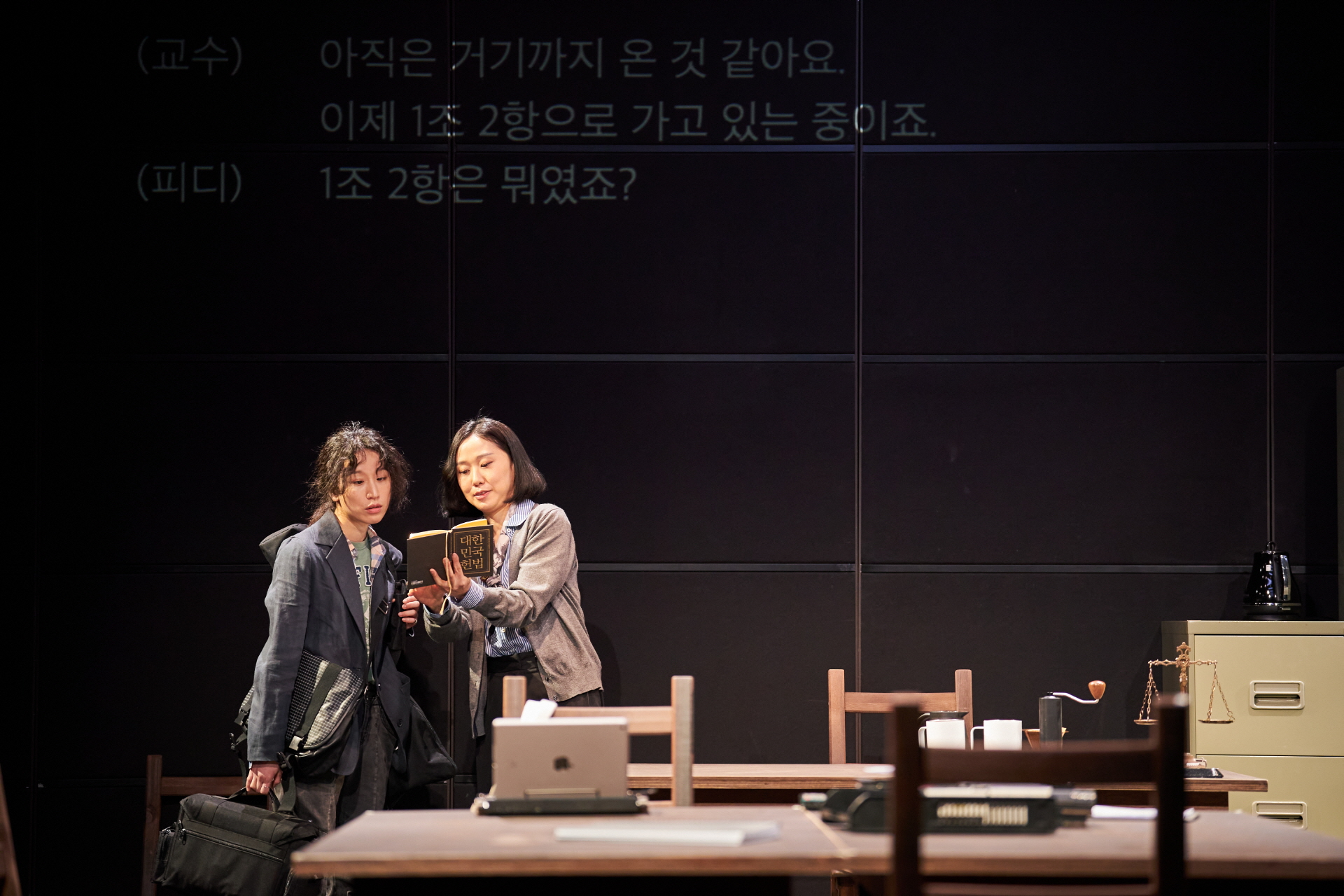 연극 〈당선자 없음〉[사진 제공=두산아트센터](이하 상동). 사진 왼쪽부터 최상영 역의 배우 이윤재, 윤길상 역의 신강수 배우. 〈당선자 없음〉은 제헌헌법이 창립한 경위를 문학적 상상력을 통해 추적해 나가며, 현재를 구성하는 이념의 한 구조적 토대가 되는 헌법의 계보를 가시화함으로써 소수의 자의적인 입법 과정과 그 이후를 사회적 합의가 전제되지 않은 현재로 연장한다. 곧 헌법의 계보학을 좇는 〈당선자 없음〉은 법의 기원을 본질적인 정의의 이념으로 구성하는 대신 외설적인 흔적을 누출한다. 그것은 물론 당대의 영향 아래 있으며, 나아가 자의적이고 우연적이다. 일제강점기에서 해방으로 넘어가는 시기에 법 관련한 전문가는 전자의 친일파에 속해 있을 수밖에 없을 것이다. 역사를 무대로 상연하는 자리에서, 그들―최상영_배우 이윤재과 그를 돕는 윤길상_신강수 배우―은 새로운 해방 정국에서 잔뜩 움츠러든 채 죄인으로서, 입법의 예외적인 역량을 가진 전문가인 동시에 일단의 권력의 네트워크를 가진 자로서 새로운 나라를 위한 헌법 초안을 만든다는 어떤 신념을 실행으로 옮기는 시간을 통해, 처벌받을 미래의 시간을 유예한다.