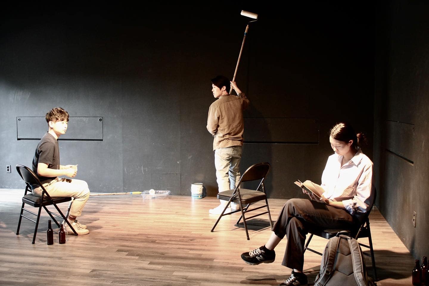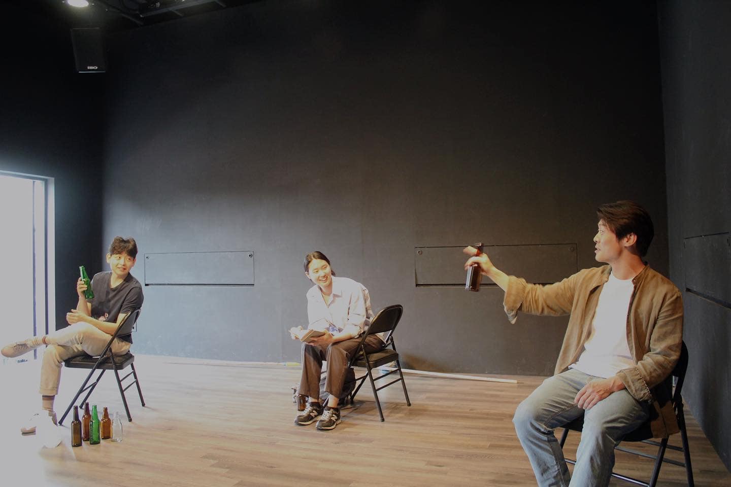 전진모 작/연출, 연극 〈끝이야 시작이야〉[사진 제공=신촌극장](이하 상동). (사진 왼쪽부터) 윤정로, 송철호, 김은지 배우. 〈끝이야 시작이야〉는 연극 이전에 자리하는 극장에 대한 거대한 언설이다. 또는 일상을 빌려와서 극장에 두는 작은 시도이다. 김은지, 송철호, 윤정로 배우 세 명은 매끄러운 서사의 당위를 갖지 않는, 일상의 파편들이 급격히 분절되는 상황 속에서 이전의 시간을 빌려온다. 그들은 서사의 중간에 위치하지 못하며 서사의 시작이자 끝인 어떤 모호함에 자리해야 한다. 분명하게 서사를 매개하는 대신 흐리멍덩한 서사에 적응해야 한다. 따라서 이들은 극장에 놓여 있으며, 그 놓여 있음에 대한 전사를 사유하는 것으로 연기를 대신해야 한다.