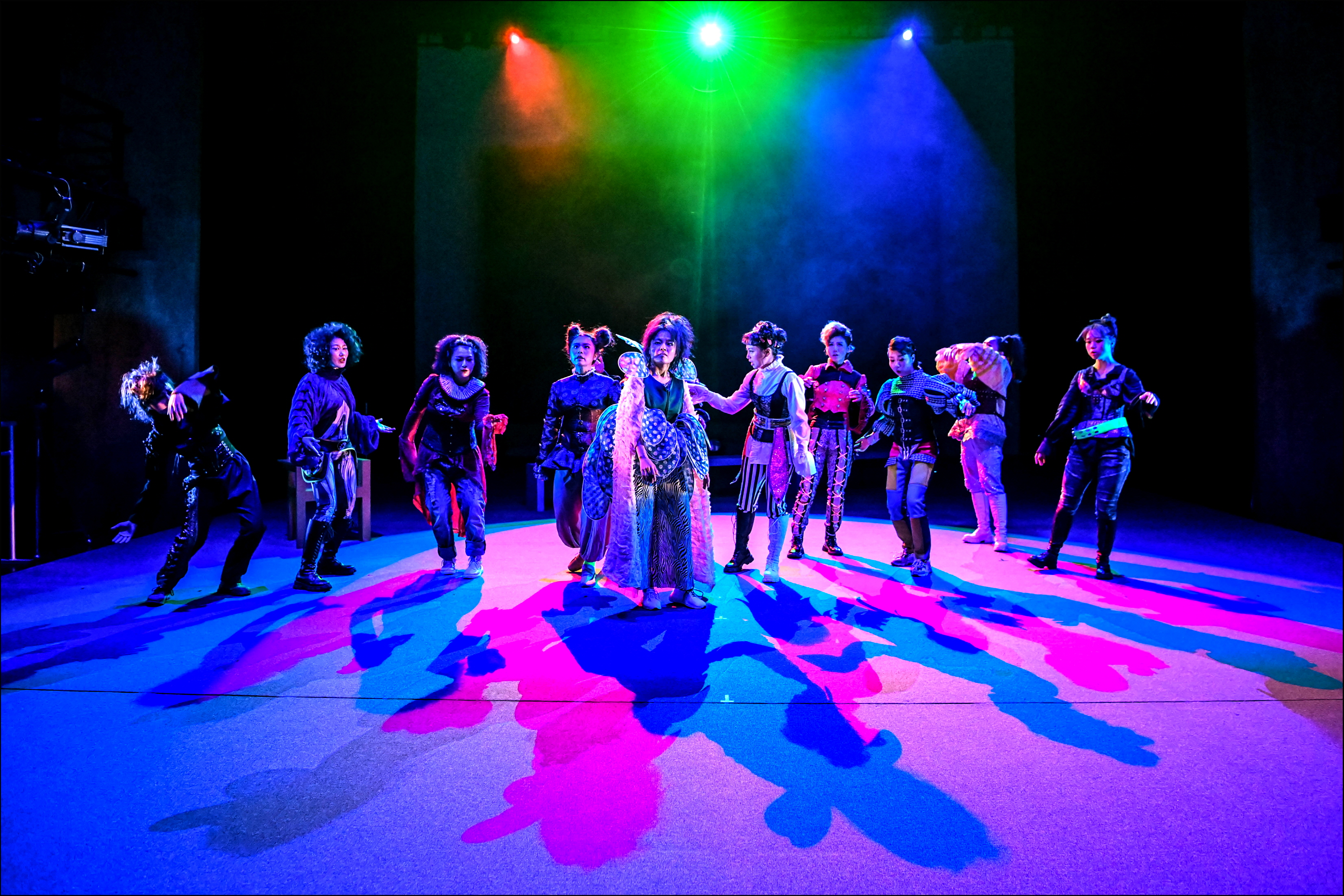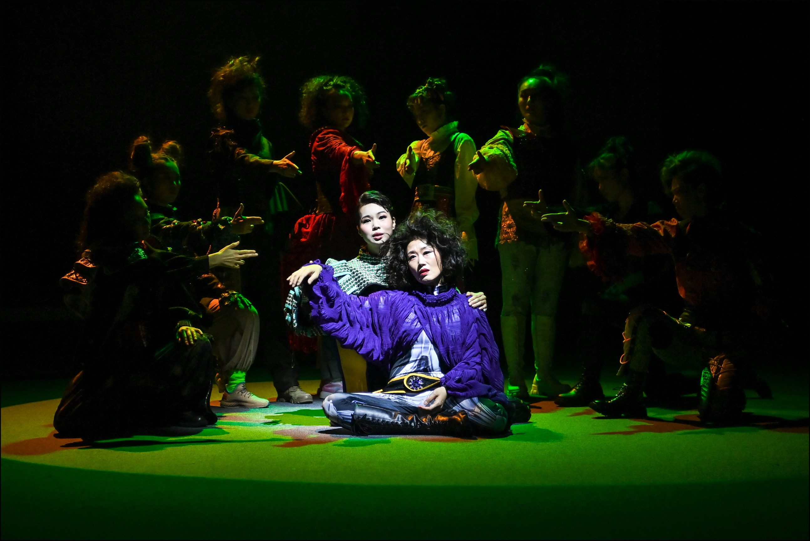 통상 연극은 시작과 끝에 각각 ‘이것이 연극’임을 한 번은 감추고 한 번은 드러낸다. 시작은 암전이라면, 끝은 커튼콜이다. 반면 〈오아시스〉는 시작에 배우 한 명 한 명을 노출하고 마지막에도 한 명 한 명이 호명의 주체로서 각자를 드러내며, 배우는 관객에게 한 번은 박수를 받으며 다른 한 번은 관객과의 마주침으로 각각 시작과 끝에 자신을 현상한다. 일종의 퍼포머로서 배우들은 주연과 조연의 위계 없이 하나의 연체동물의 다리들처럼 움직이는데, 화려한 색채의 각기 다른 옷들은 하나의 이종 생명체들의 군락을 이루고 각자의 촉수를 뻗으며 서로의 말을 받아 거대한 화음을 내는 유동하는 구조물을 만든다.
