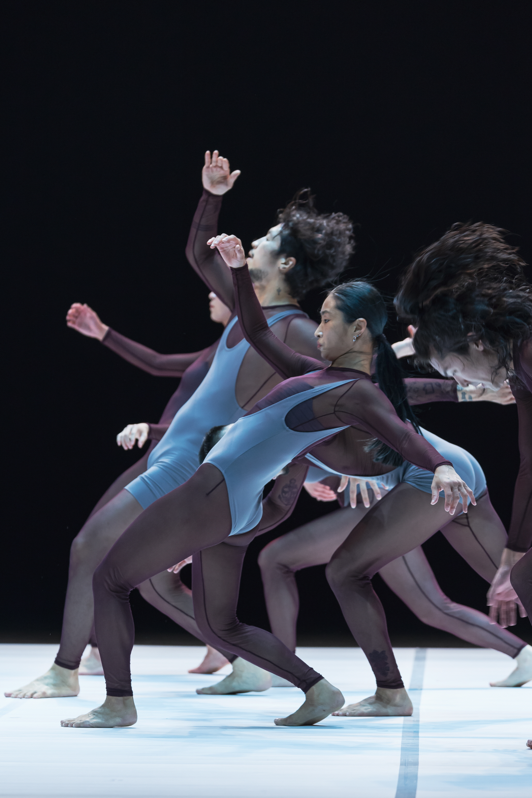 국립현대무용단 HIP合 중 이재영 안무, 〈메커니즘〉(공연사진) [사진 제공=국립현대무용단]ⓒAiden Hwang(이하 상동). 〈메커니즘〉은 분절된 단위로 움직임이 구성됨을 쌓아가며, 사운드와 함께 서서히 증폭시키는 구조를 취한다. 〈메커니즘〉이 보여주는 건 일견 안무의 경로인 것으로 보인다. 하나하나 분절된 몸짓을 통한 결과는 움직임의 느리게 감기를 통한 일종의 시각적 클로즈업이 아니라, 곡선의 흐름과 그 흐름을 추동하고 있는 인간의 정념이 삭제된다는 것이다. 레슬러의 복장을 한 무용수들은 동작 하나하나를 섬세하고 강력하게 이행한다. 춤은 마치 스포츠의 효율과 훈육된 신체의 퍼포먼스 역량 자체를 전시하는 것을 추구하는 것 같다.