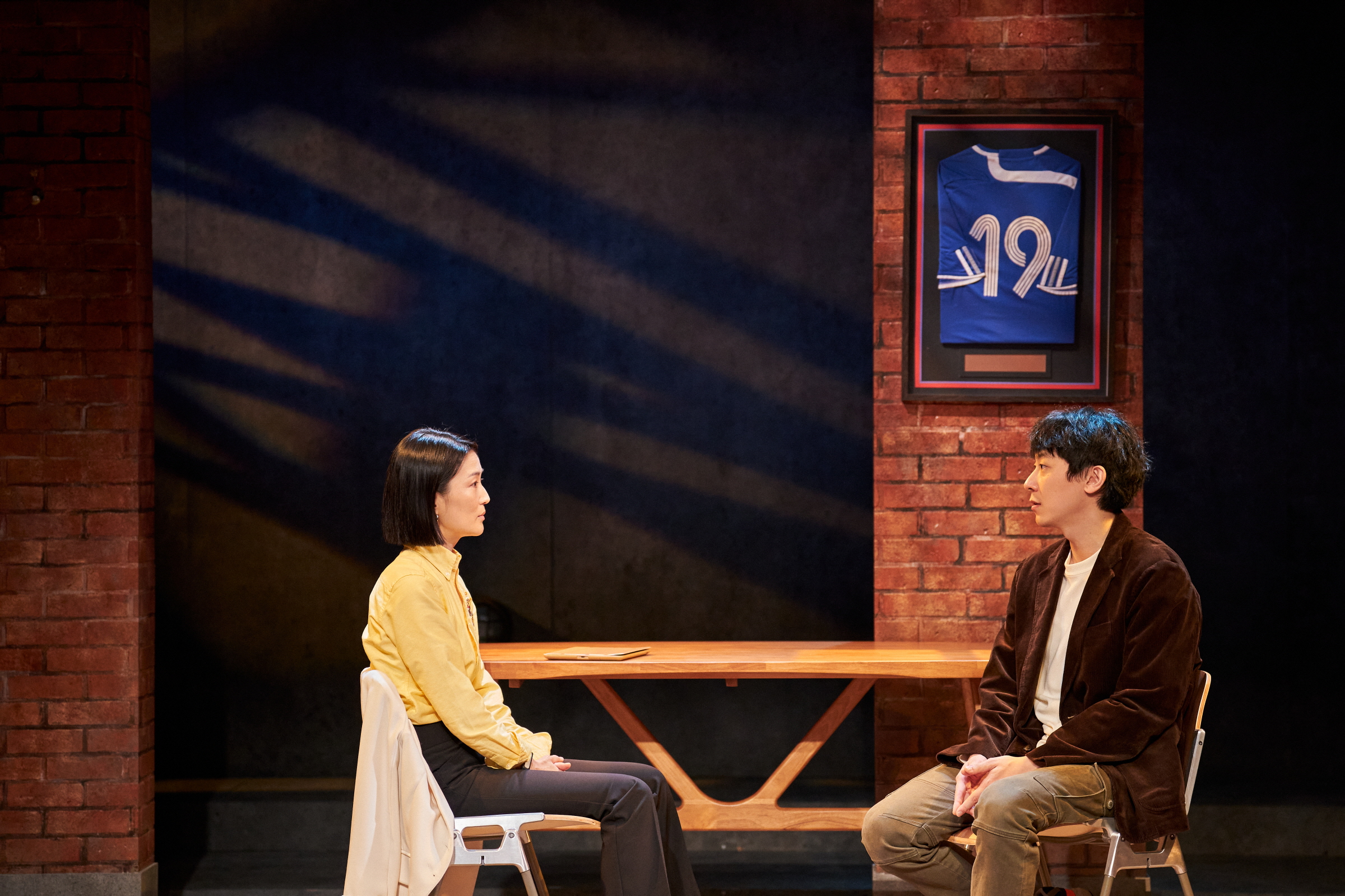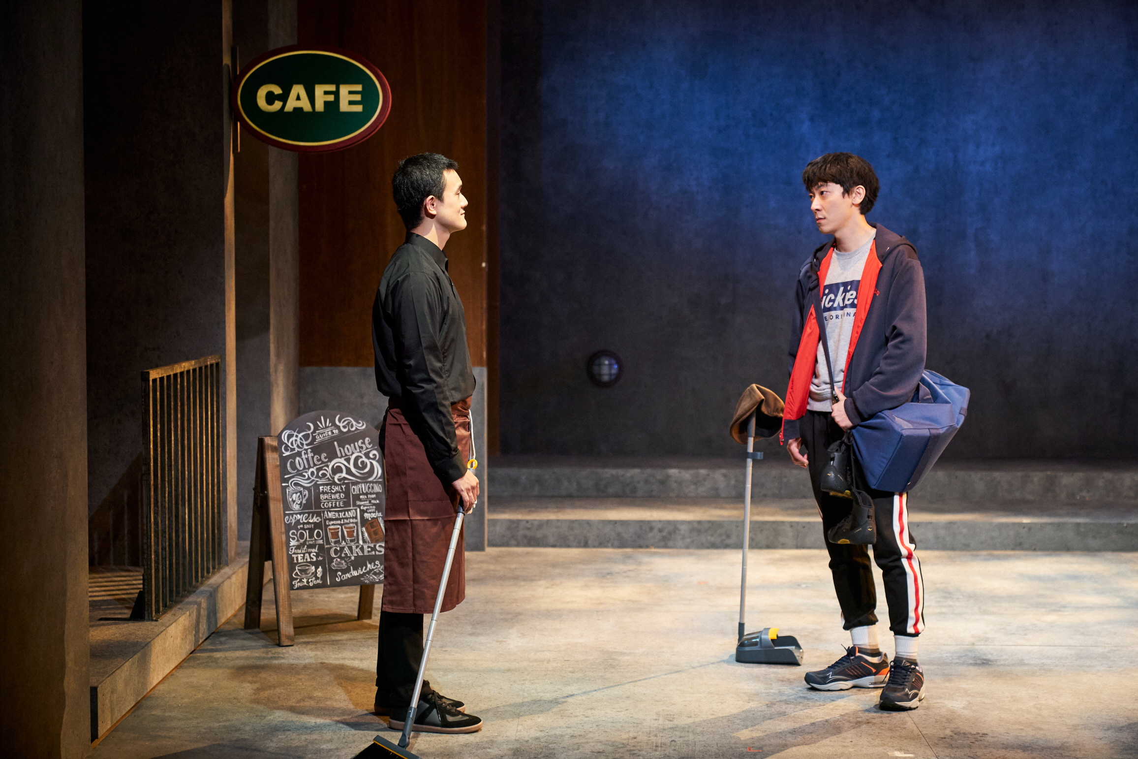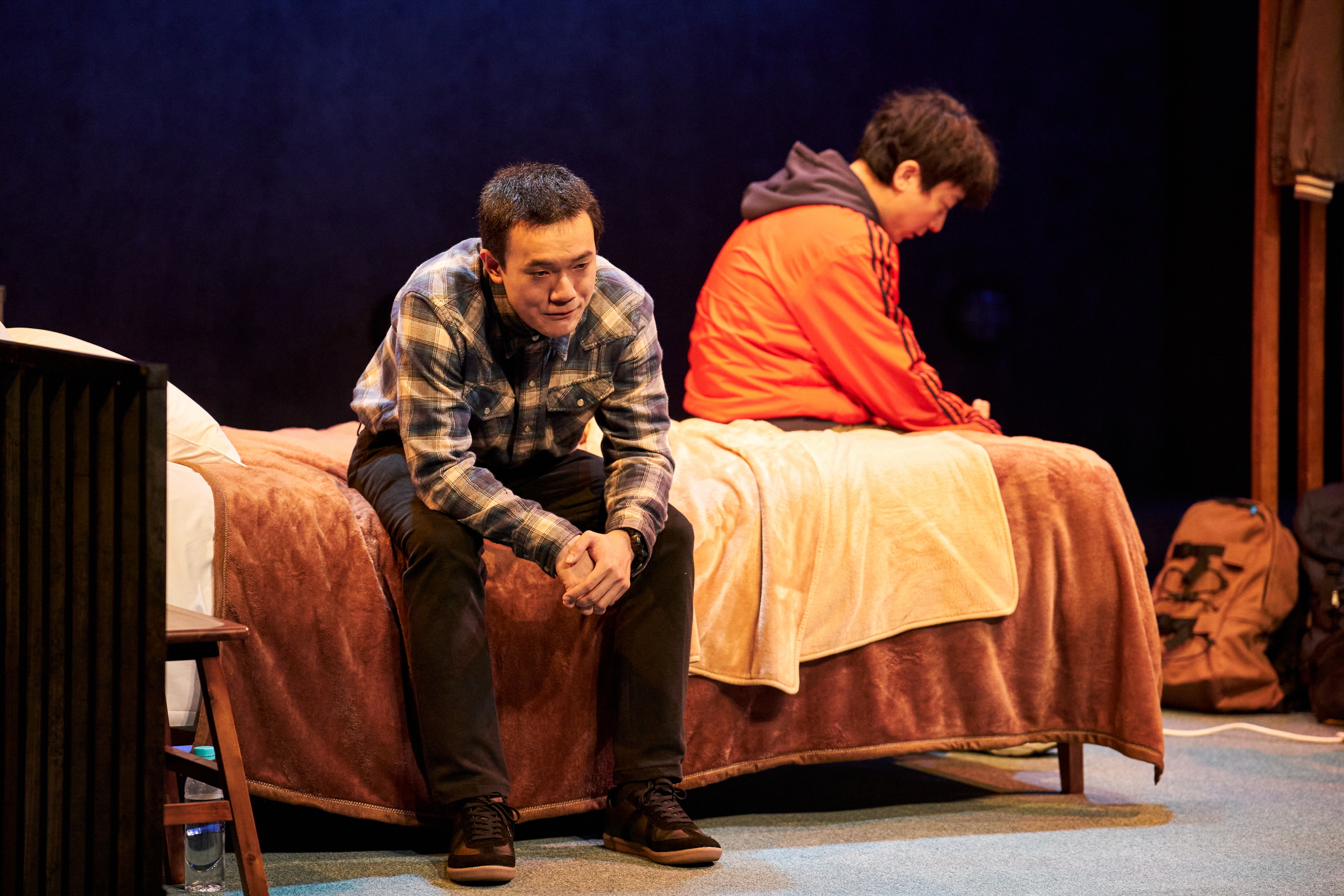 연극 〈편입생〉[사진 제공=두산아트센터](이하 상동). (사진 왼쪽부터) 클라런스 매튜 역의 김하람 배우 , 크리스토퍼 로드리게스 역의 최호영 배우. 연극 〈편입생〉은 면접을 앞둔 두 인물의 모습에서 시작해, 이들이 면접을 거치고 어떤 삶의 변화로 수렴하는지를 보여준다. 인물의 전사와 이 인물들이 외부의 시선을 통과하며 한 개인들의 삶은 사회적 실재의 한 예시가 된다. 닫힌 공간에서 인물의, 또는 인물 간의 발화는 매우 집중력 있게 진행된다.