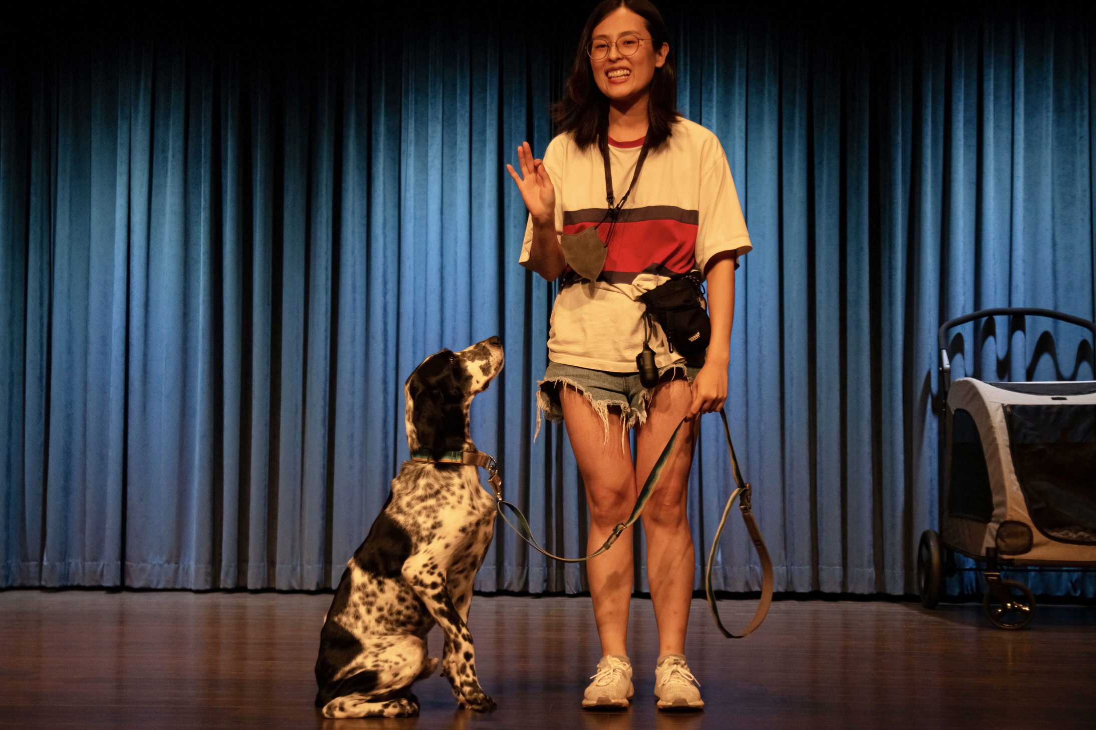 《2022 코미디캠프: 파워게임》에서 안담, 〈PowerOFF〉(2022) ⓒ손영규 [사진 제공=지금아카이브](이하 상동) 안담의 〈PowerOFF〉는 안담이 키우는 개 “무늬”가 함께 주인 안담과 등장한다. 안담의 말은 시종일관 개를 키워서 바깥으로 잘 나갈 수도 없고, 개를 데리고 다니는 것에 절대적인 한계 역시 따르고, 나아가 연애도 할 수 없다는 등의 개인적인 불만을 나열한다. 이는 또 다른 에너지로 굴절되는데, 안담은 담배를 피우며 개를 데리고 유모차를 끌고 다니는 자신이 트리플 크라운의 사회적 ‘극혐’이 되는 일이 유일하게 사회에 영향을 끼칠 수 있음을 인지하는 일이 된다는 측면에서 너무 기쁘다면서 개에 삶이 묶인 자신의 처지를 자조, 안위한다. 안담 특유의 말투가 있는데, 이는 물론 연극의 그것은 아니지만 다른 누구보다 연극적이다. 안담은 실실 웃으면서 발음을 흘리듯 발음하며 온갖 센 말을 아무렇지 않게 흘려보낸다. 페미니즘과 퀴어, 동물권에 대한 이야기가 부담스럽지 않고 그의 일상과 뒤섞여서 제시된다. 도살장에서 구조돼 분리불안이 있는 무늬를 살펴야 하는 안담은 개를 공연에 동원한다는 혐의를 받을 수 있음에 대해서도 이야기한다. 무늬의 언어를 인간의 언어로 바꾸어서 말하기도 하고, 무늬에게는 젠더가 이분법적으로 분명하게 나뉘어서 젠더를 “횡단”하지 않는다고도 이야기한다.