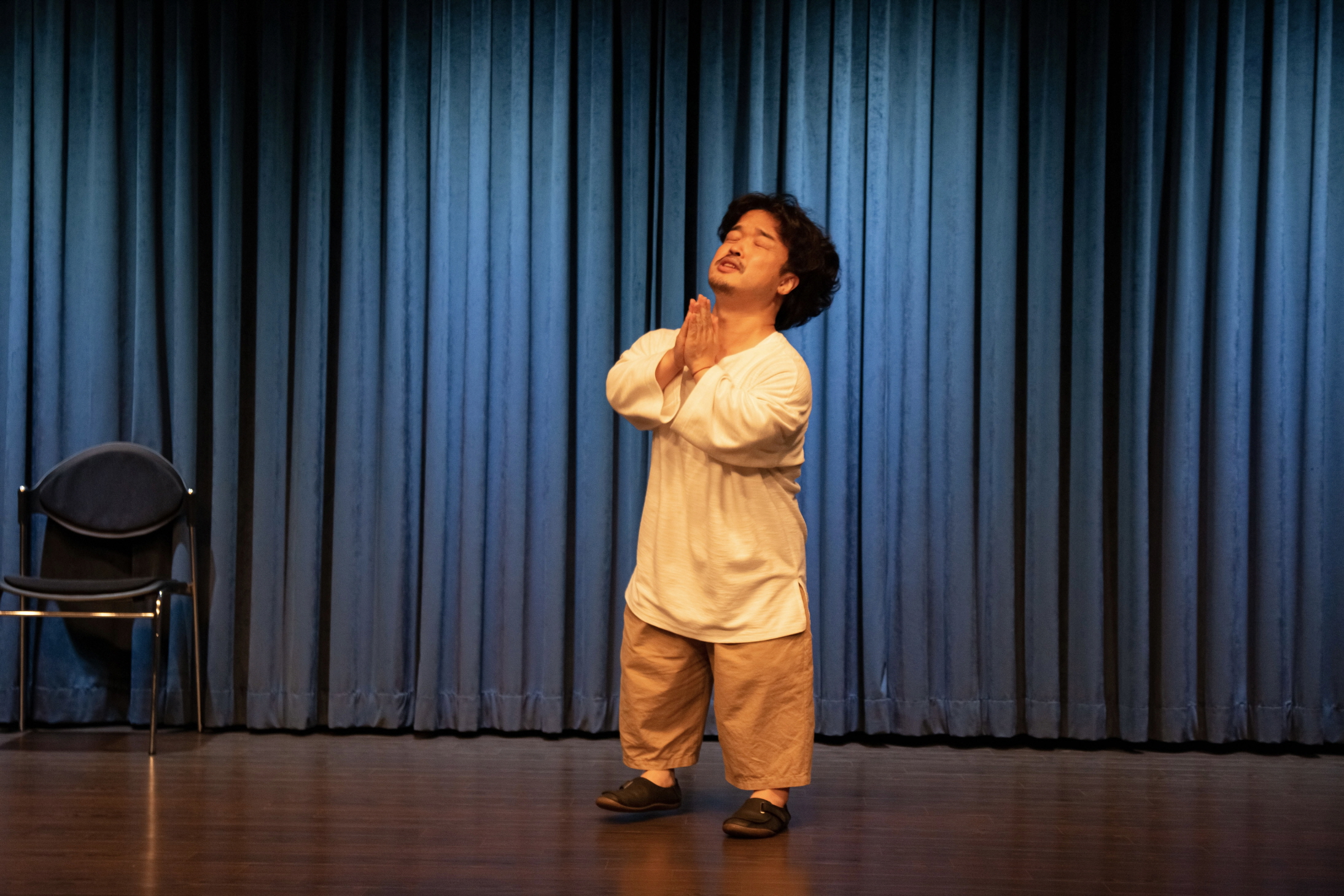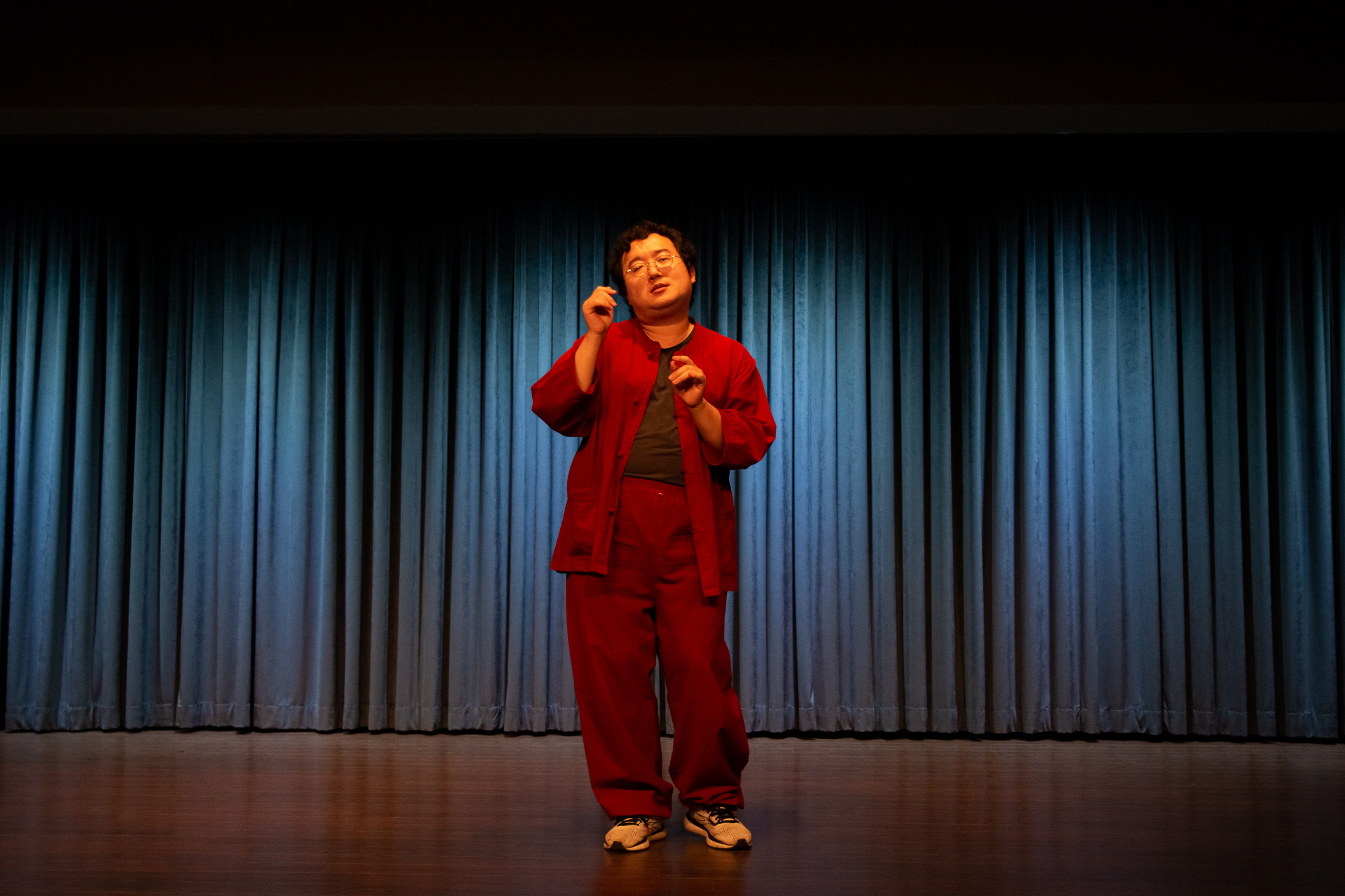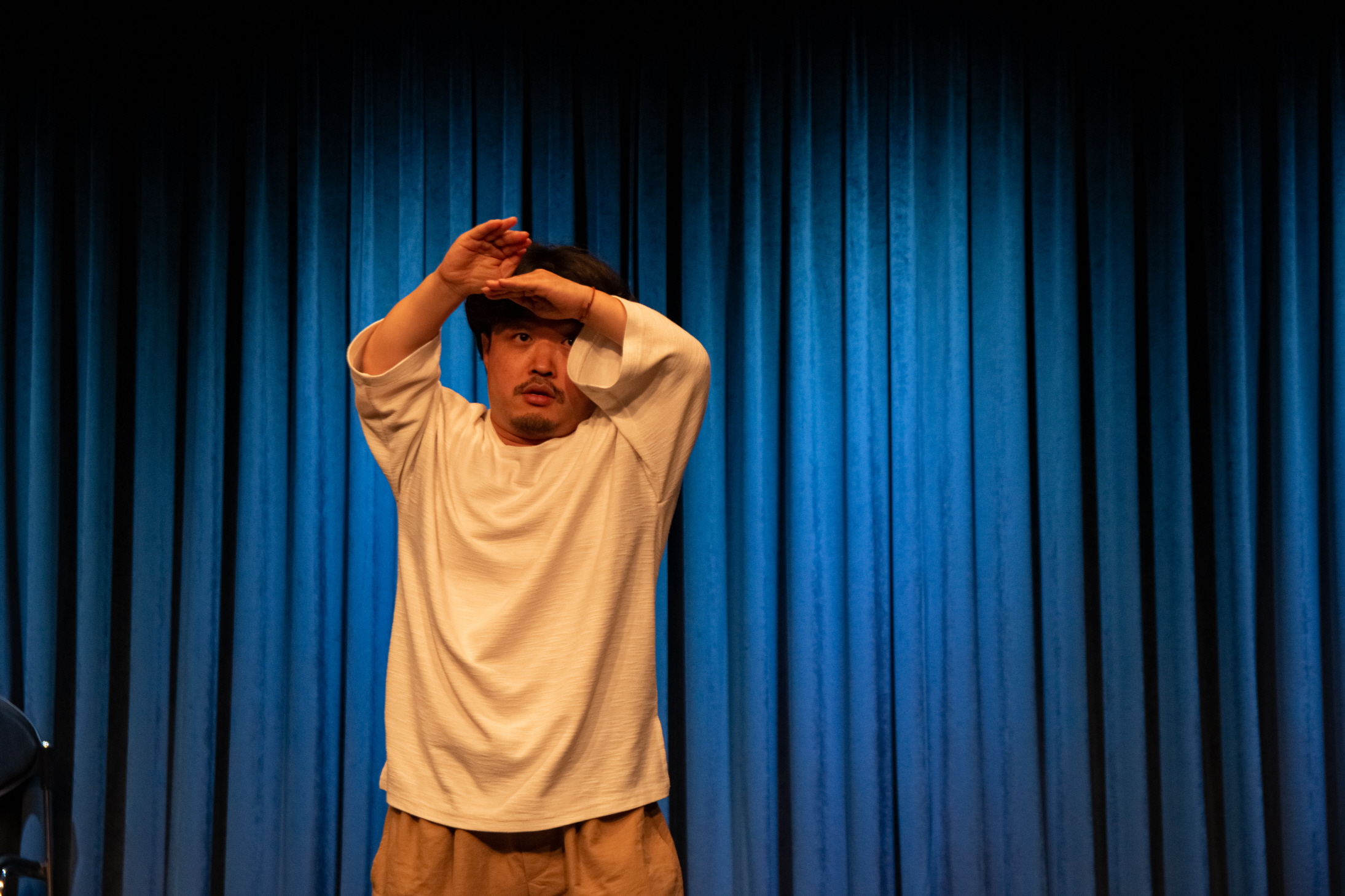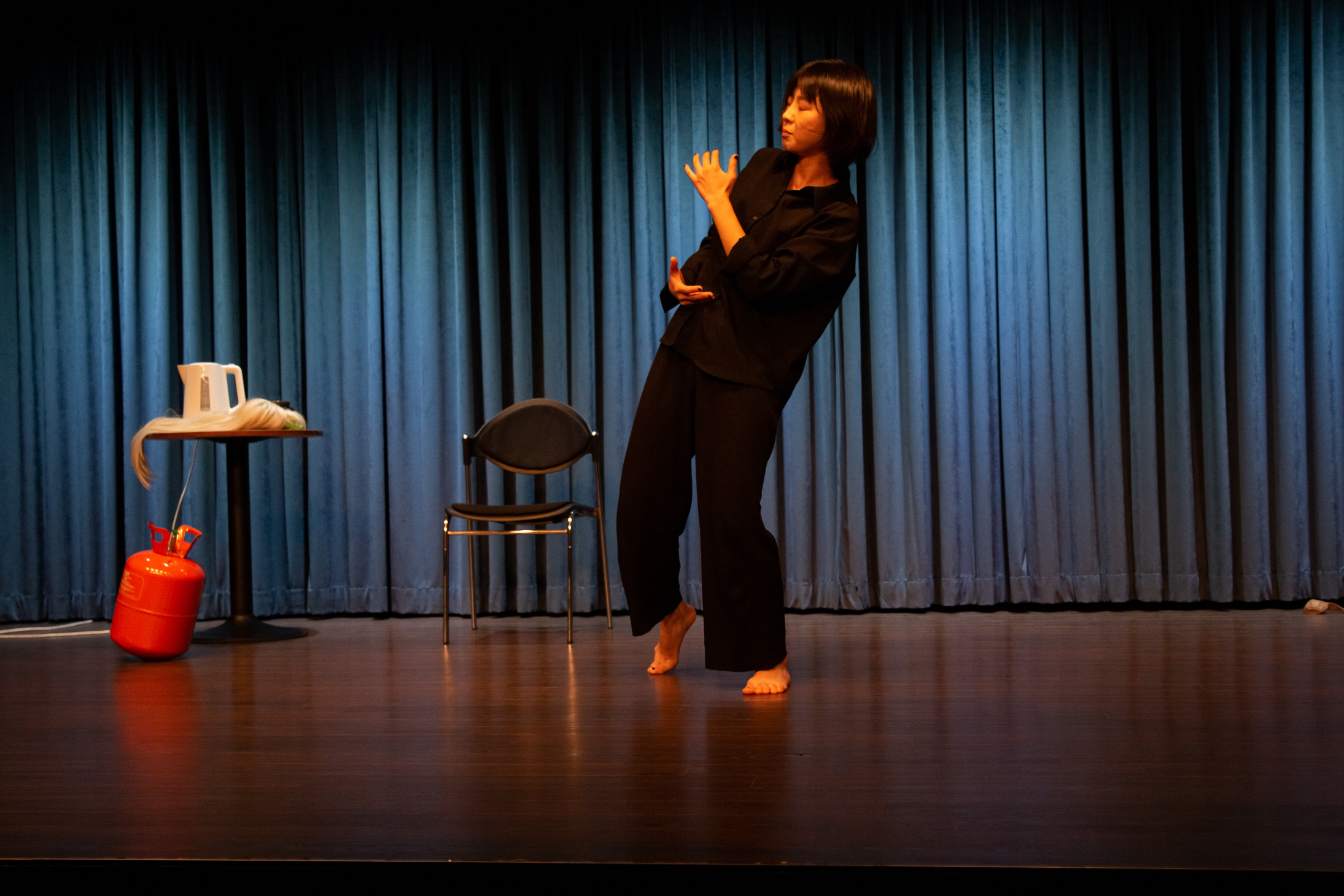김은한의 〈상식적인 접근〉은 이 관객이라는 대상이 어떻게 반응하는지를 직접 관객의 몸체를 만드는 과정을 통해 탐색한다. 처음에 레크레이션 강사처럼, 본 무대 전에 관객들을 워밍업 차원에서 훈련시키는 역할처럼 그는 일차원적인 관객의 양상을 구성하고자 하고 이에 실패한다―자신이 왼손을 들면 박수를, 오른손을 들면 함성을 이런 식으로 직접적인 관객 반응을 유도한다. 그리고 계속 다른 무대에서도 밈처럼 반복해서 쓰이는 구간인, 마임으로 퇴장해서 문을 열고 공연에 대한 실패를 자책하며 소리를 지르며 절망에 찬 모습을 보이는 장면을 연출한다. 그리고 누군가―일종의 ‘조력자’―의 등장에 의해 코미디 비밀 클럽에 입성하게 된다. 이곳은 하이쿠와 같이 문학에서의 여백이 잔상 효과로 관객에게 전이되는, 음미의 방식이 종용되고 또 통용되는 곳이다. 조금 더 고차원적인 작품 감상을 하는 곳과의 대조 이후, 마지막으로 간 더 은밀한 비밀 클럽에서 그는 어떤 타입을 선택할지 고심하며 왔다 갔다 한다.