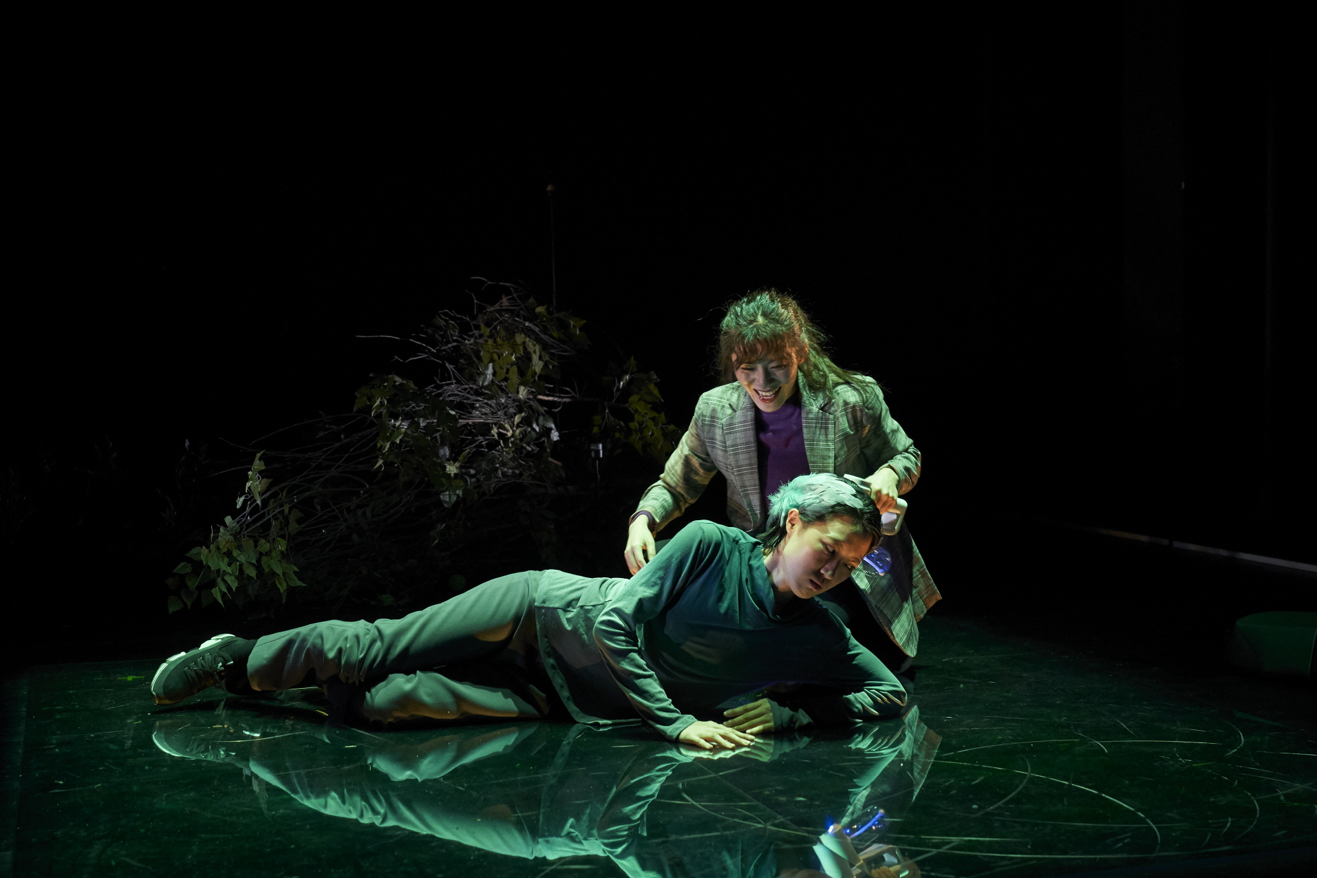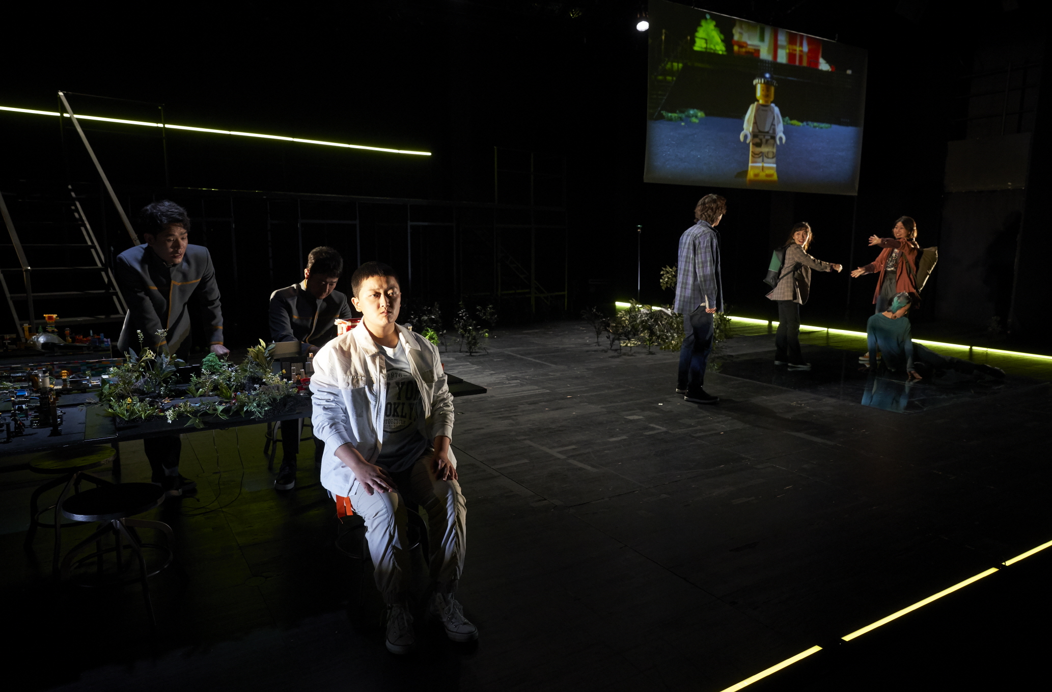 장우재 작/연출, 연극 〈A·I·R 새가 먹던 사과를 먹는 사람〉 ⓒ유한솔 [사진 제공=극단 이와삼](이하 상동). 지니 역 라소영 배우. 〈A·I·R 새가 먹던 사과를 먹는 사람〉(이하 〈A·I·R〉)이 그리는 2060년대는 사실상 오늘날의 사회 현실과 크게 다르지 않음이 체감된다. 그것은 우리가 아는 몇몇 사회의 이념형을 분할한 것이다. 자본주의가 지배하며 과학 기술이 집약된 스마트 시티의 미래상이 1구역인 국가라면, 동등하고 평등한 공동체의 자율적 역량을 신망하는 곳이 2구역 “네크”이며, 선주민이 살며 국가 바깥의 통제되지 않는 자연이 곧 3구역이다. 이러한 구분은 사실상 그 안에 각기 사는 사람들의 모습으로 재현되지 않으며, 비로소 이 세 구역을 횡단하는 등장인물들에 의해 정치체제와 사회 현실, 그리고 제도 바깥의 삶과 기후 위기 이후의 삶이 혼합―거꾸로 〈A·I·R〉는 이를 분할하여 횡단 불가능한 공간으로 경계 짓는다.―되면서 역사의 파편들로 절합된 동시대성의 일단으로 기입된다는 점에서 이념형으로 볼 수 있다. 그리고 경계를 오가는 등장인물들의 도약에 의해 비로소 세계가 그 모습을 드러낸다고 볼 수 있다. 또는 세계가 자신의 모습을 드러낼 수 있게 된다. 〈A·I·R〉은 다른 미래를 상상하기 위해서라기보다 다른 현재를 구성하기 위한 제안에 가깝다. 그것은 현재라는 몸체를 끌어안고 있다. 결국 〈A·I·R〉은 이념형의 미래를 표현하는 데 집중하는 대신, 현재성의 의제이자 현재를 벗어나지 않기 위해 미래를 절감한다.