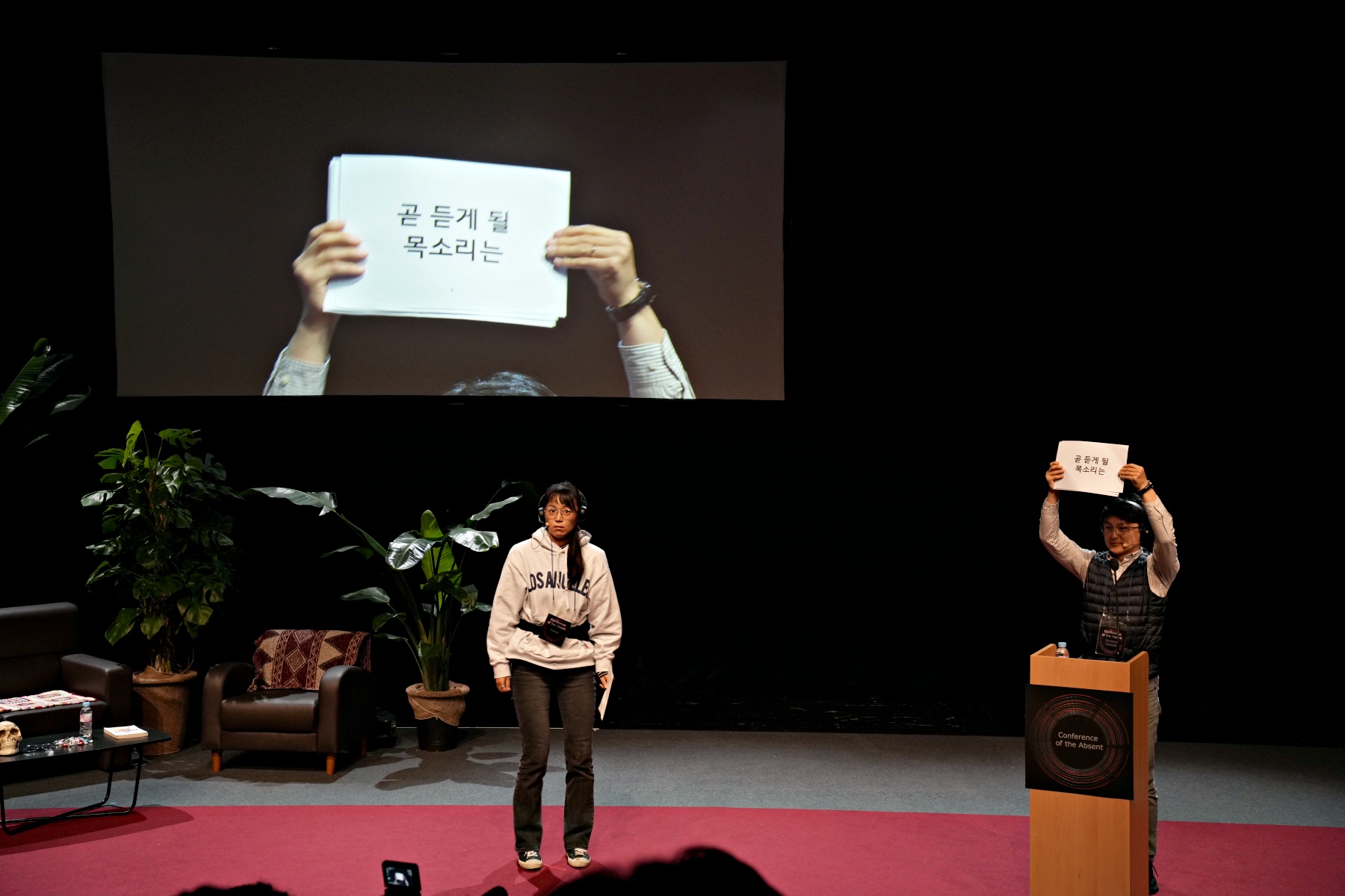 따라서 의도하지 않은 현실, 내용적인 전개와 상관없는 현존 간의 관계가 만들어진다. 〈부재자들〉은 순수하게 스크립트를 관객에게 전달함으로써 배우를 관객이 대체하여 배우의 아우라가 사라진 것이 아니라, ‘배우의 존재론을 수행하기’라는 일시적인 현존의 양태로 바꾸며 배우에 관한 인식론적 질문을 던진다. 더 적극적으로 배우에 관한 실험을, 배우에 관한 질문을 구성한다.