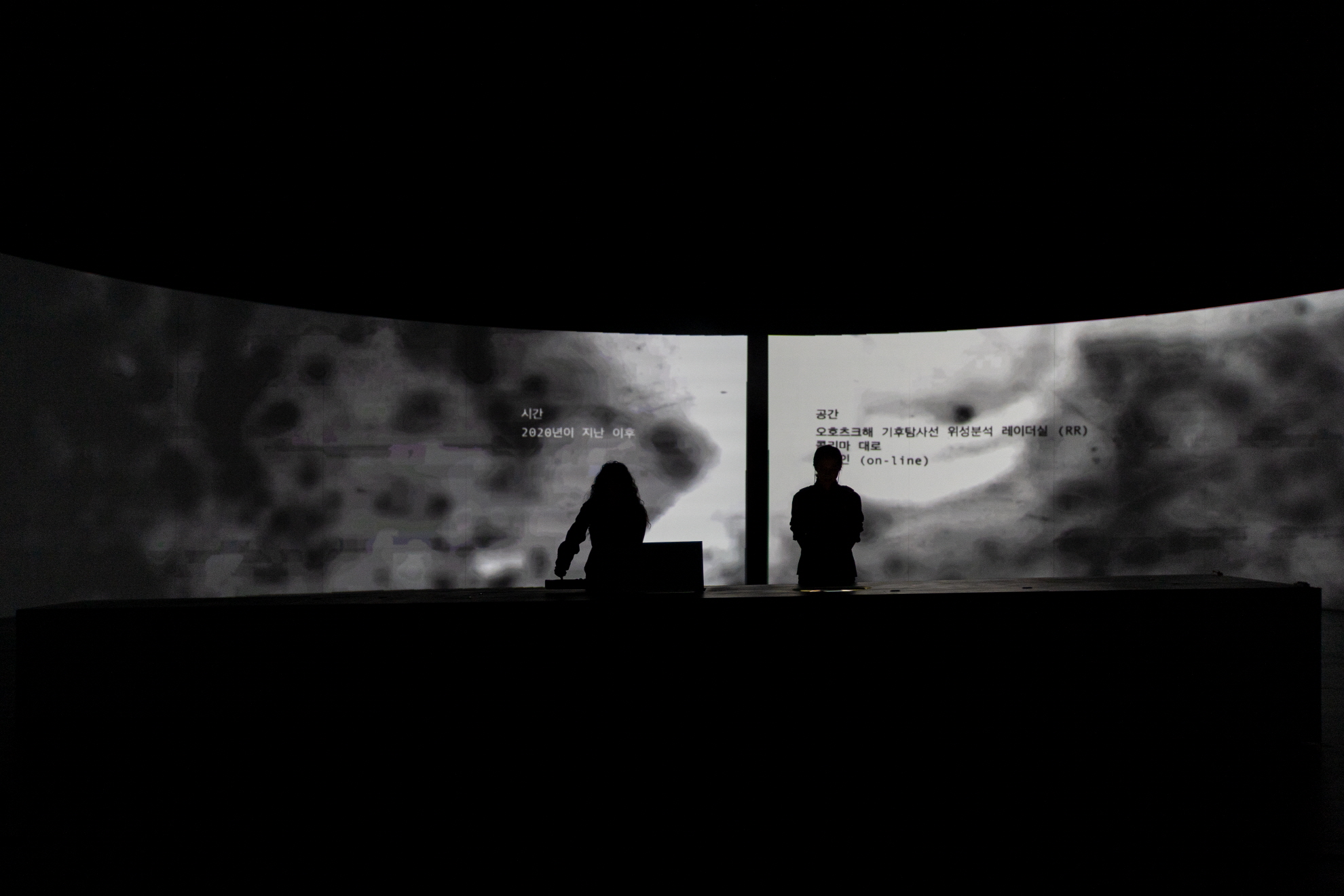 정진새 작, 연출, 〈극동 시베리아 순례길〉[사진 제공=ACC](이하 상동). 끊임없이 지구의 끝을 향해 걷는 ‘여행자’, 산티아고 순례길 반대편으로 인간의 발길이 닿지 않는 시베리아 길을 향한 그의 여정은, 온라인 게임 유저들의 화제를 모은다. 동시에 기상청 소속의 기상탐지 시스템 연구원들의 관찰 대상이 된다. 〈극동 시베리아 순례길〉(이하 〈순례길〉)에는 알 수 없는 자의 미지의 좌표가 전제되고, 이는 그 바깥에서 사유되고 추적되어 현재의 삶에 들어온다.