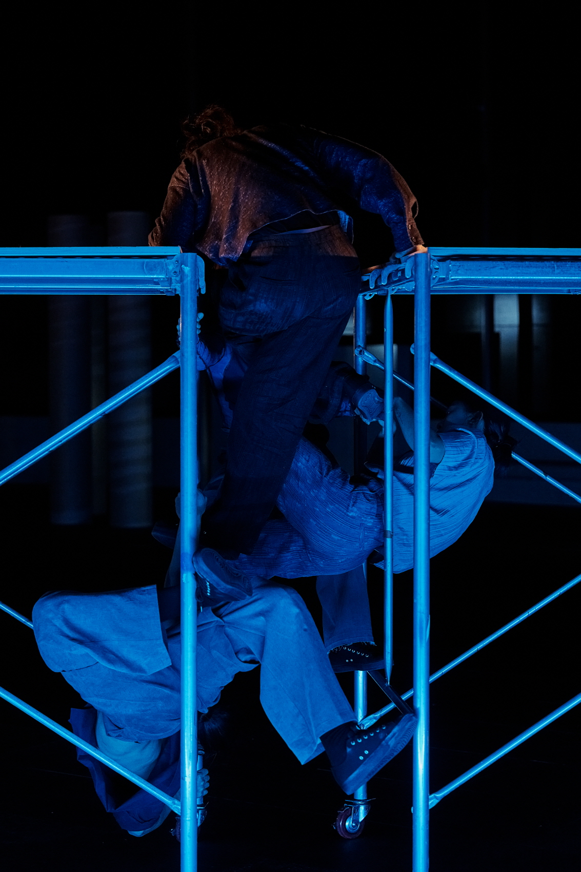 두 번째 무대인 마치 침대를 형상화한 비계 구조물에서 퍼포머들은 위아래로 분포한다. 위에서는 누워서 잠들어 있는 모습이라면, 아래는 이 신체가 위치한 단면을 건드리는 식으로, 그러나 그 위에 사람들은 여전히 잠결에 있는 모습으로 무의식을 표상한다. 그 아래의 몸짓은 존재와 연결되지 않고 현실로 표상되지 않는, 비의지적인 존재의 정형화되지 않은 몸짓이다. ‘침대’에 닫기 전에 우선하는, 살랑거리는 스텝은 존재의 차원이 아니라 비정형의 바람과 같은 형상을 의태하는 것으로 보인다.