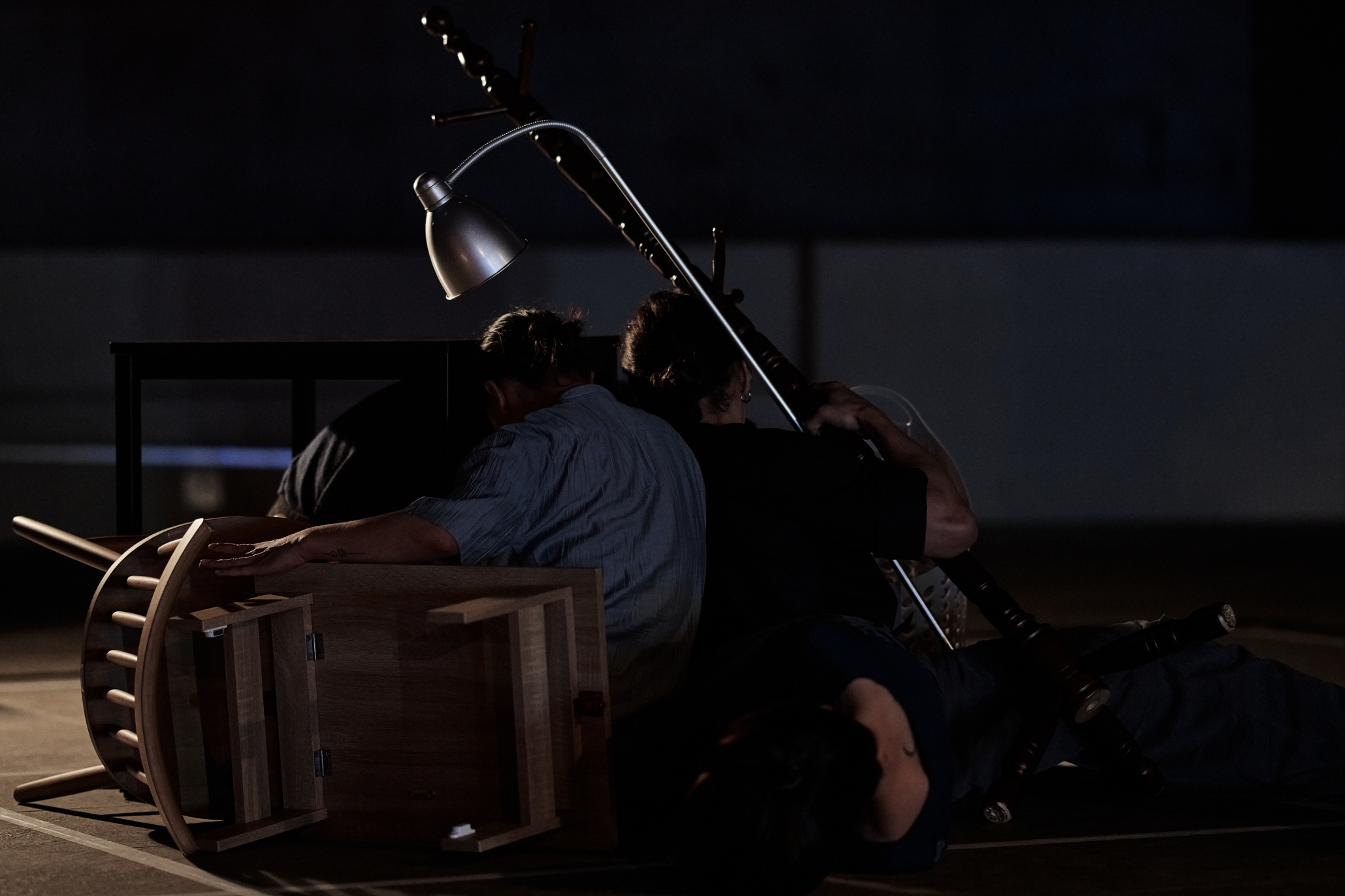 〈뿌리집〉은 우리가 소파를 봤을 때 움직임의 굴곡 또는 행동의 반경이 소파의 모양대로 곧장 우묵해지는 것처럼 어포던스(affordance) 차원의 움직임들을 시현한다. 배경과 피규어는 하나의 차원으로 맞물리며 움직임은 그러한 배경을 함입한다. 우리는 퍼포머들이 그 환경 안에 있음을 알 수 있으며, 무정형의 공간 안에 순전한 움직임을 조직하는 것이 아님을 본다. 가령 공간의 틈과 그 사이를 지나가는 존재를 구현하는 퍼포머 간의 서 있음에서 밀침과 기울어짐으로 가는 앞선 과정은, 그러한 배경과 인물의 밀접한 관계 양상을 도출해 낸다. 그 움직임이 그의 밖의 더 큰 공간과 관계 맺고 있음에 대한 인지는 그가 그 공간 안의 좁은 틈에 겨우 운신하면서 그 공간을 역으로 만들어내고 있음에 대한 인지와 맞물린다.