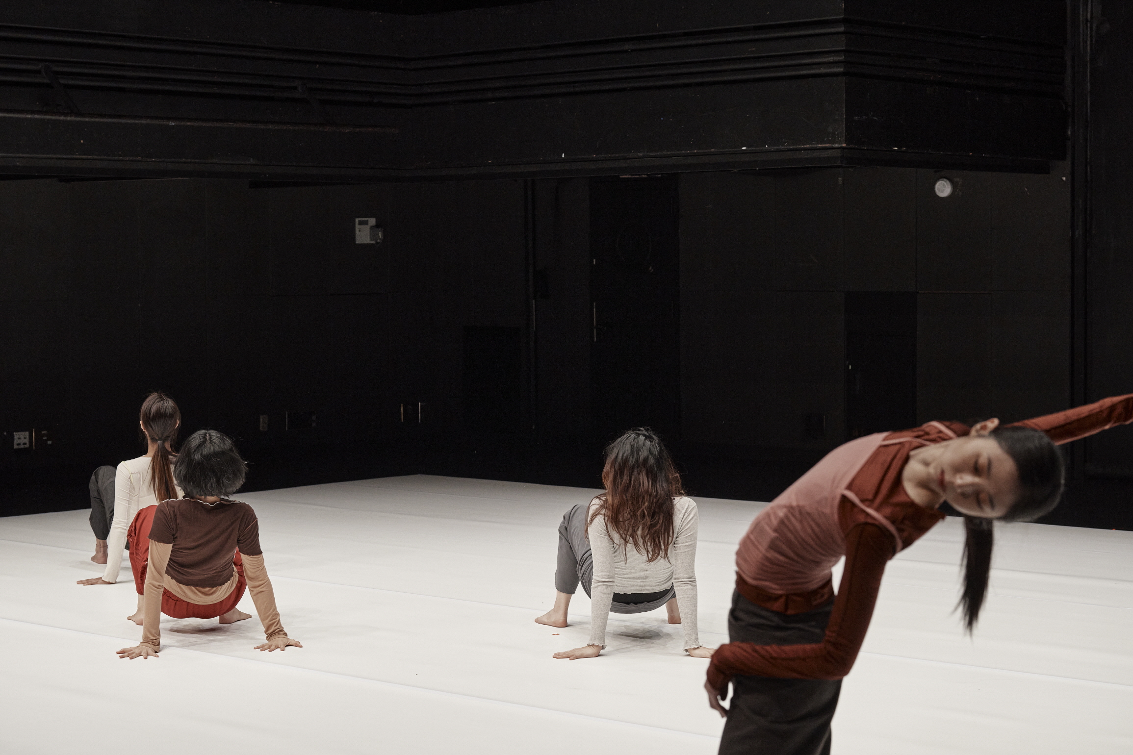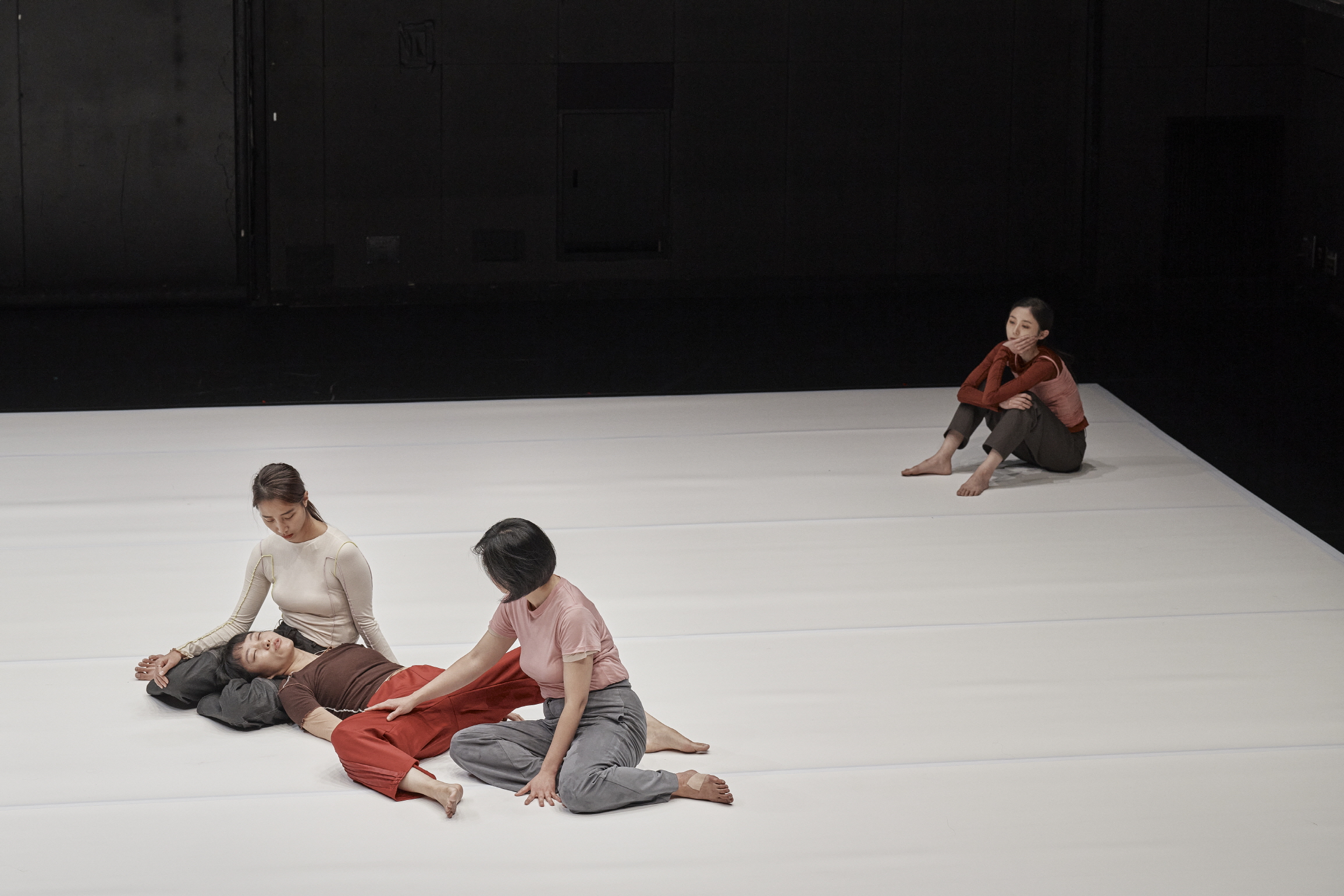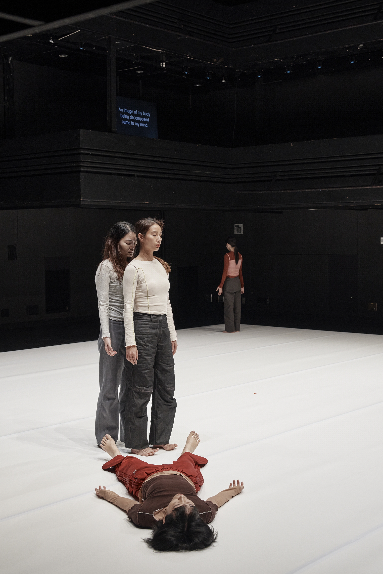 (사진 왼쪽부터) 염정연, 정이수, 윤상은, 곽유하 무용수. 〈신화 짓기〉는 누군가의 경험 이후 무대 가로 돌아가서 다시 무대로 들어서는 재귀적인 구조를 가져간다. 이는 마치 웜업처럼 가볍게 몸을 풀고 현재에 결합하는 즉흥적인 무대의 일환처럼 보이기도 한다. 〈신화 짓기〉는 고대 이후 신성으로서의 “버자이너의 죽음” 이후(에도) “신화 짓기”(가 가능하다는 전제)를 가져가는 것일까. 그러한 신화 짓기가 필요하다고 하는 것일까. 아니면 버자이너의 죽음과 신화의 죽음을 동렬로 놓는 것일까. 곧 버자이너의 죽음 이후 더 이상 신화가 불가능한 시대에 그 신화의 잔재를 갖고 이전의 신성을 되찾으려는 몸부림 같은 것일까. 아니면 그것이 불가능함을 알면서도 신경증적으로 그것을 반복하는 제스처일까.