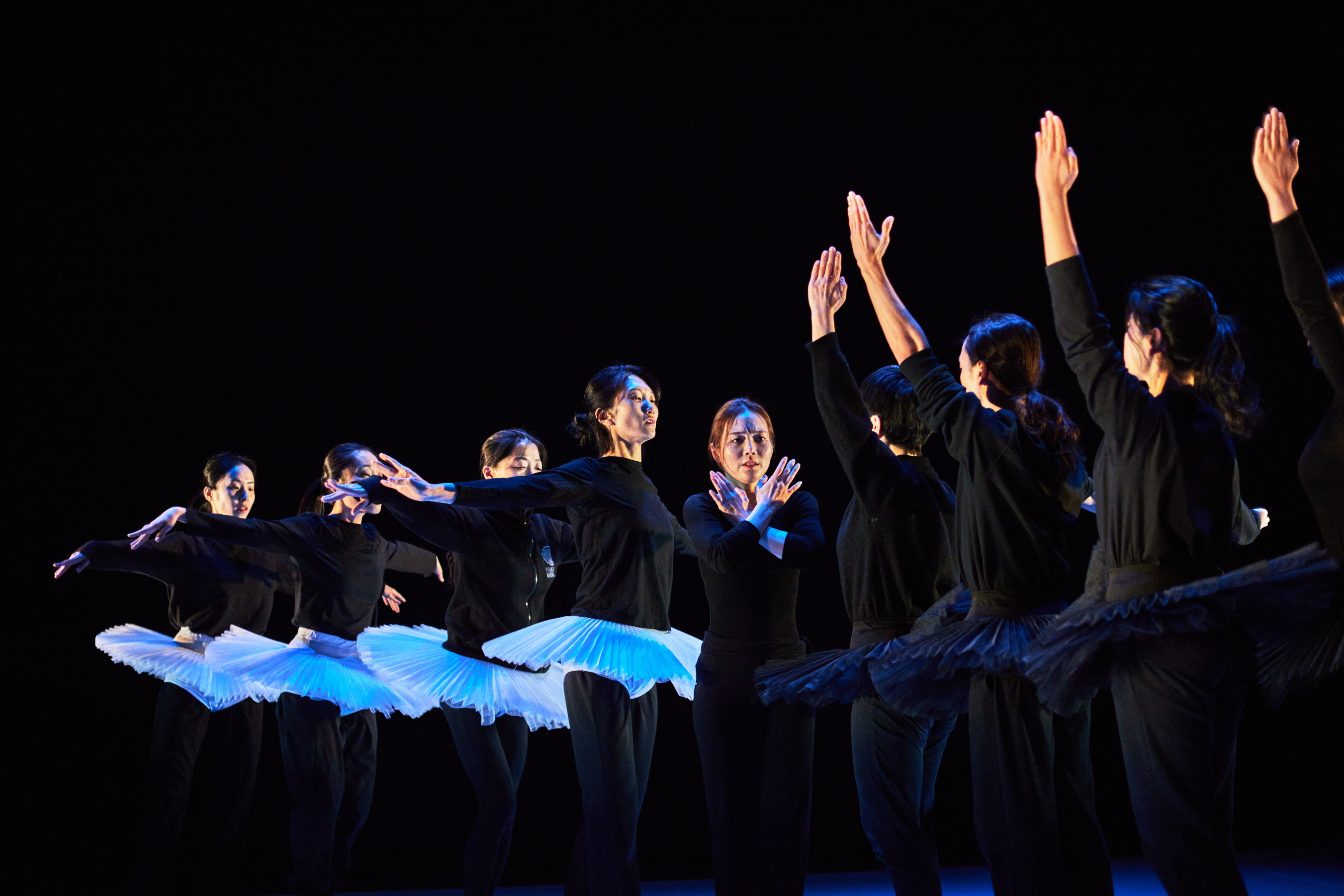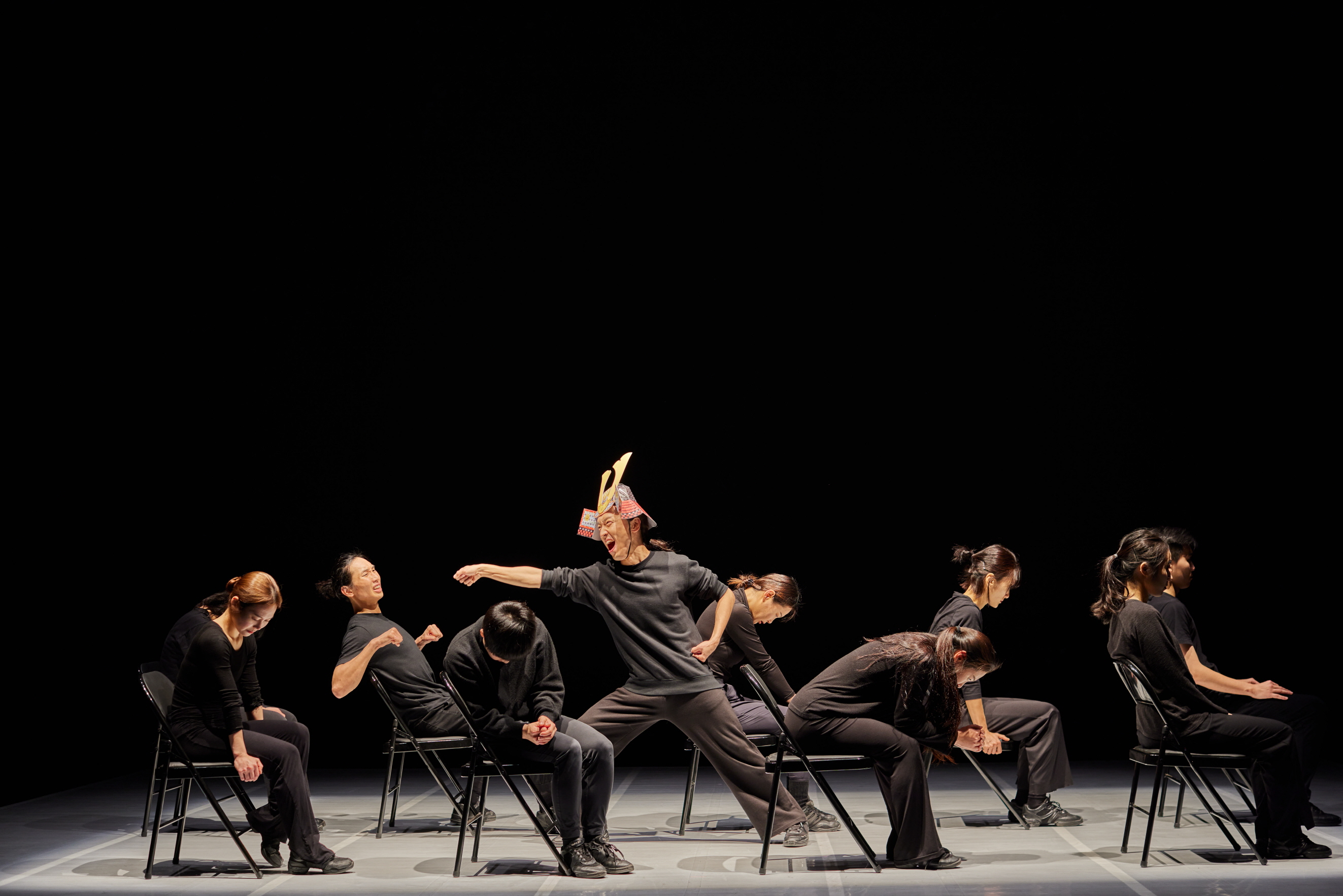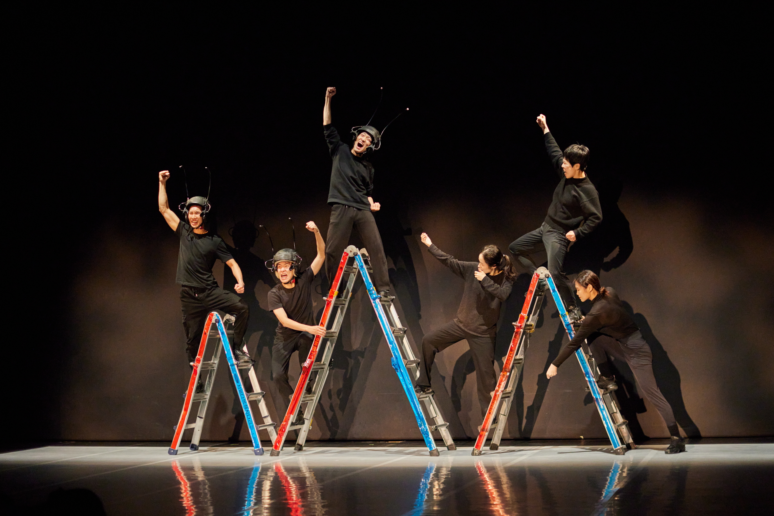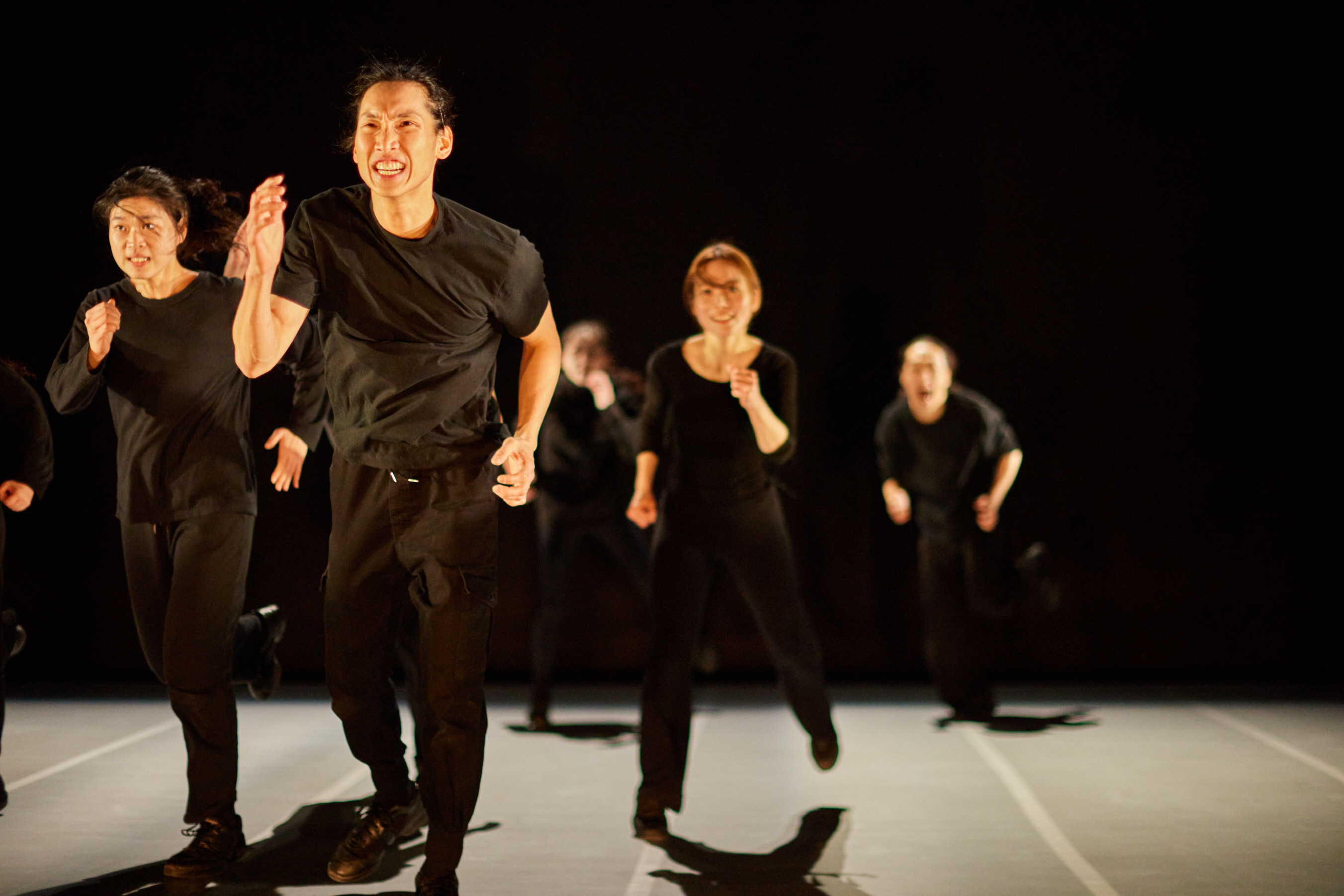 이는 영화 〈명량〉을 소위 영화 유튜버가 중계하는 것을 재현하는 장면에 이르면, ‘스마트폰’의 영상과 영상의 개연성 없는 연접을 무대로 구현하는 것과 같은데, 배우들에게는 아무래도 이러한 다중 접속의 현실들의 전환이 가혹한 일일 것이다. 이는 몸을 극단으로 밀어붙이는 게 되는데, 초반 음악 용어상의 각종 템포에 따른 변주에 맞춰 피아노 건반과 맞닿는 열 손가락의 움직임을 런지 동작을 계속하는 것으로 표현하는데, 이는 각 배우를 미세한 손 움직임과 동기화시키는 고도의 트레이닝이 된다. 각 퍼포머는 하나의 건반으로 환원되고 신체는 화면 안의 이미지로 포획되며 완벽하게 재생되어야 하는 것이 된다. 여기서 움직임은 기계적이고 물리적인 차원의 전개가 되며, 이는 현진영의 〈흐린 기억 속의 그대〉에 맞춰 출연진 모두가 격렬하게 춤을 소화하는 마지막 장면의 노래에 맞춘 춤과 같이 스코어를 법으로 수용해야 한다.