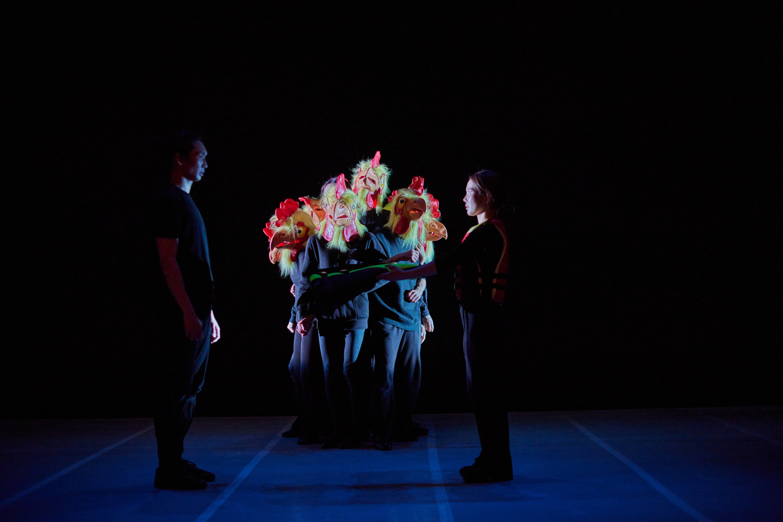 또 다른 장면으로는 ‘무대’ 장면에서 쓰러진 배우가 떨어진 조명기로 치환되고, 이는 다시 로드킬 당한 동물로, 중성화 수술의 비용이 우리의 세금이라는 대사에서 동물 전반으로 연장되는데, 〈걸리버스〉는 동물을 인간의 잣대에서 다루면 안 된다는 주의를 가져가는 대신, 그 혐오의 에너지가 어떤 식으로 맞물리게 되는지 자체를 설명하는 것에 국한한다. 닭장의 좁은 영역에 들어간 닭들에 대한 언급과 닭 가면을 쓴 배우들 이후 조용필의 〈친구여〉가 나오며, 이는 이태원 참사에 대한 알레고리로서 제시된다고 하겠다―사육장 속의 닭들과 이태원 청소년들의 이미지가 등치된다. 그렇게 느슨한 연결이지만 다른 이미지들에서의 최종적인 마무리가 되는데, 대체 가능하지 않은 이미지로서 오로지 애도의 의미를 담아 오래된 경구 차원에서 대중가요를 호출하는 셈이다. 세월호와 이태원은 양립할 수 있는 이미지이기도 하고 그렇지 않기도 하다. 국가의 위기 대응 시스템이 부재하거나 무력한 경우이면서, 이태원의 경우 겪은 지 오래되지 않았기 때문이다. 그 이후 세월호에 의해 극이 닫힌다고 하겠다.