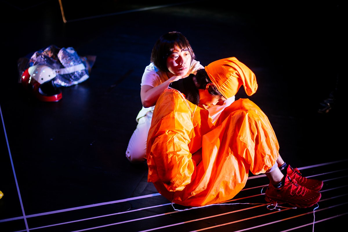 〈로켓캔디〉는 “꿈과 현실”이라는 메타포로 연극을 비유하며 시작한다. 마찬가지로 공연의 시작을 알리는 ‘공연 중’을 대체하는 “경기 중”으로써 호모루덴스의 이상으로서의 팀의 이름을 공연으로 연장한다. 천장에서 내려온 줄의 얽힘과 빗금, 통로로 분할되는 극장 공간은 딱딱하고 견고한 구조의 힘보다는 정신없는 접점, 느슨한 기울기와 유선형의 연결에 더 가깝다. 너덜너덜하고 연약하게 역할들은 무대에 투명하고도 불확실하게 뚜렷하고도 불분명하게 자리잡고 흩어진다. 이러한 양가성은 〈로켓캔디〉가 캐릭터에 치중하지 않으면서 퍼포머의 현존을 내세우기 때문이기도 하겠지만, 무엇보다 서사 자체가 현실의 폭파와 분쇄, 상상력을 폭발적으로 제시하려는, 극의 분절되고 자리 잡지 않는 언어들이 결정적이기 때문이다.