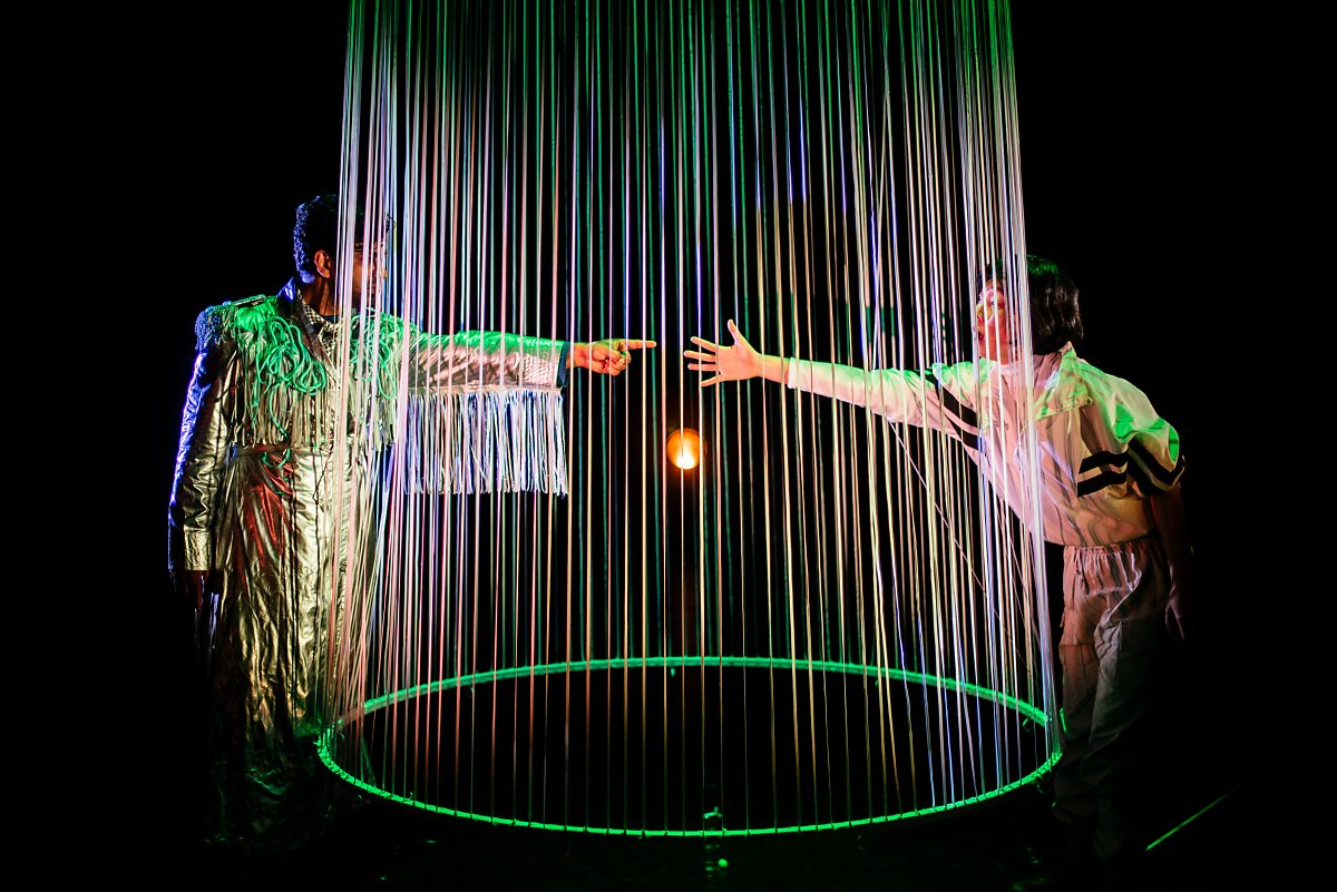 연극 〈로켓캔디〉ⓒ이지응[사진 제공=공놀이클럽](이하 상동). 공놀이클럽의 〈로켓캔디〉는 인간은 달을 개척하고 로봇이 노동을 대체해 더 이상 노동을 하지 않아도 되는 2043년을 다루지만, 정교한 우주 과학적 정보와 변화된 세계의 구체성을 특별히 가져가지는 않는다. 이는 한편, 등장부터 “더 나은 삶…”을 줄기차게 읊는, 솔라리아 최초 개발자 노아―버디-x가 인간의 노동을 대체하게 되었다고 한다.―가 화성에 가려고 하는 기업가 일론 머스크에 대한 기시감을 주는 것과 같이, 2043년 역시 미래가 (또한 달에) 완전히 도착했다기보다 염원과 희망의 슬로건이 세계에 남아 있는 현재의 양상을 띠며, 다른 한편, 질산칼륨과 설탕을 섞은 로봇캔디를 추진제로 해서 아버지를 보러 달로 떠나려는 ‘지구’의 상상계적이고 도착적인 관점에서 극이 연장되기 때문이다. 곧 지구(와 그와 결합하는 우주)의 망상이 극을 그리고 현실을 지배한다.