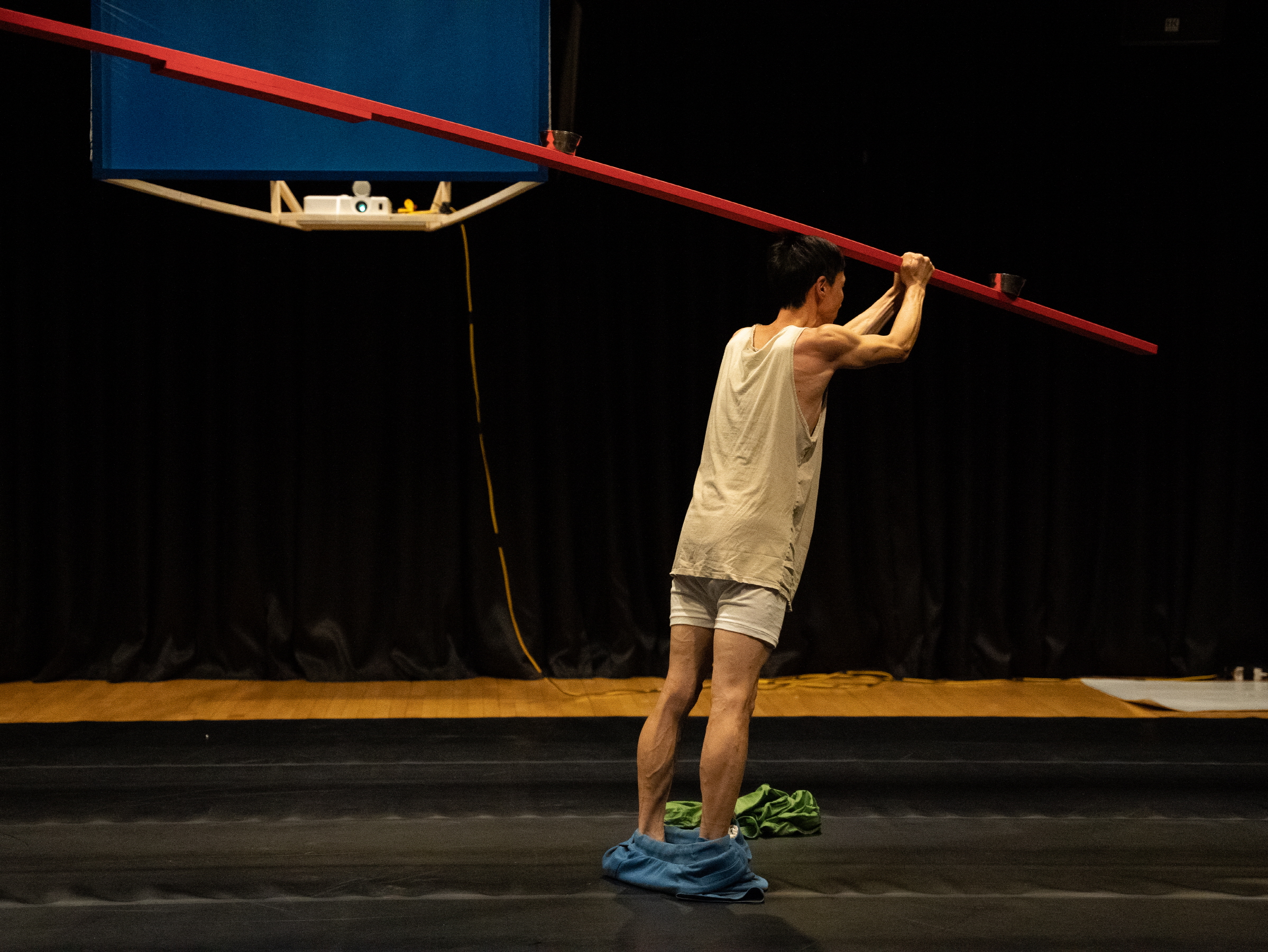 춤판야무, 〈WORK〉ⓒadela.[사진 제공=춤판야무](이하 상동). 〈추락〉의 한 장면. (사진 왼쪽부터) 정한별, 금배섭. 춤판야무의 〈WORK〉는 무대 위에 몸을 두고자 한다. 이 몸들은 우화적이거나 우스꽝스럽고도 진지하게 작동하지만, 이들은 뭔가 신성한 무대를 향해 간다. 수행적인 몸은 표현 양식의 심미적인 차원만을 추출할 수 없음을 가리키기보다는 몸이 작동하고 있음 자체를 확인하게 한다. 관객이 이 몸이 어떻게 기어이 그 과제를 수행하는지를 바라봐야 하기 때문이다. 그 몸이 얼마나 더디고 떨리며, 따라서 진동과 호흡의 신체로 육박하는지를 바라보게 하는 것이다―몸은 인식 주관을 따라올 수 없고, 예기치 못하게 미끄러진다. 옴브레의 음악은 몸과 몸, 움직임과 움직임 사이에 적절하게 ‘간격’을 삽입한다―그것은 전개되기보다 진행된다. 무대 안쪽에는 각재를 활용해 임시로 짠 프로젝터가 투사되는 영상 이미지가 있는데, 최종 화면이 나오는 곳에 씌운 천으로 인해, 관객은 영상의 정면이 아니라 뒤집힌 면을 보게 된다.