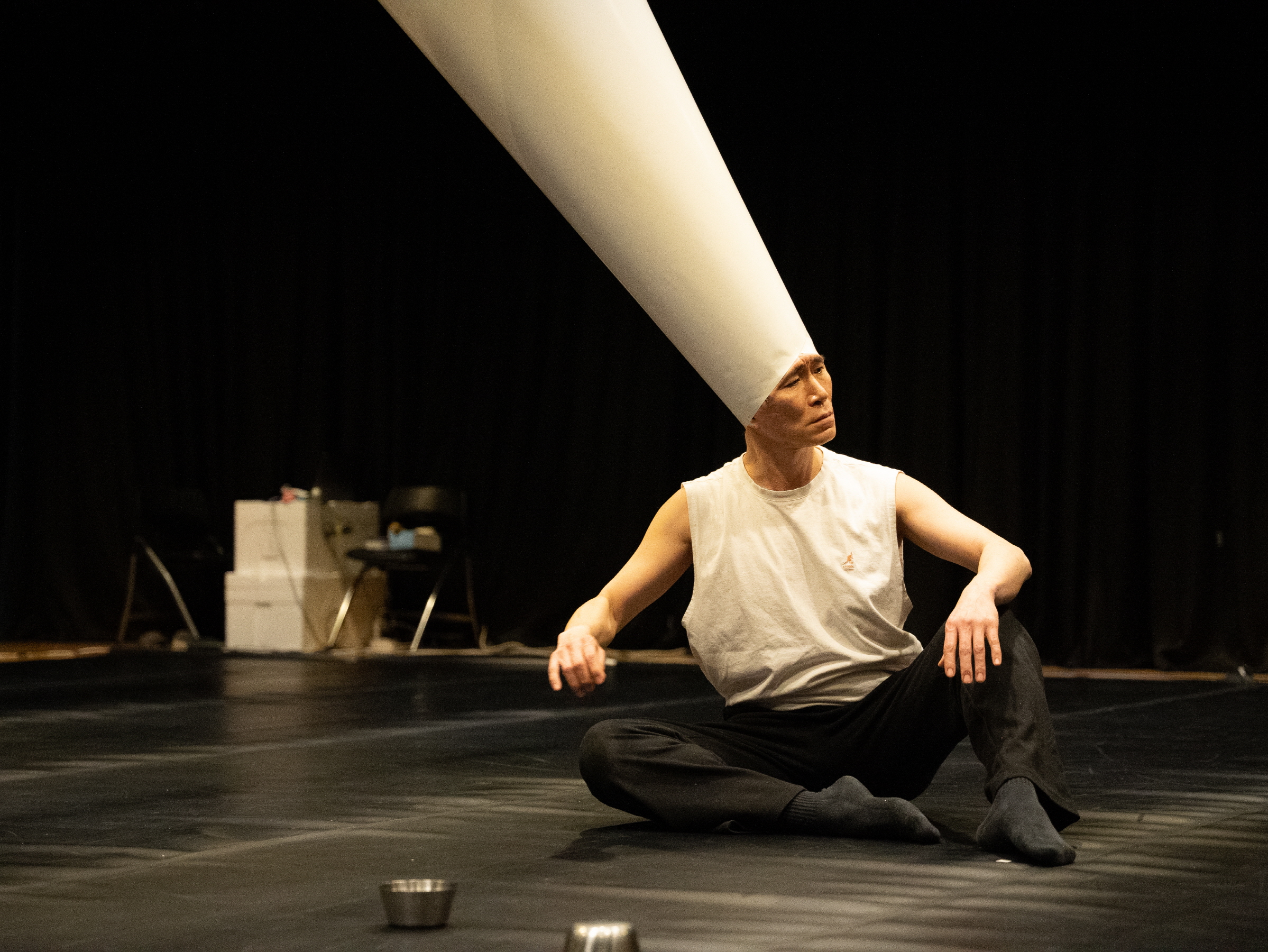 금배섭의 무미건조한 표정이 그 어려움을 어떤 한계나 어려움으로 받아들이고 있지 않음을 나타내는 것 같다면, 정한별의 묘한 미소는 정수리를 막대와 결착시킨 채 움직임으로 인한 그 반동이 다시 신체에 미치는 효과를 긍정하는 스펀지와도 같았다. 곧 머리의 유지 자체는 몸을 곧추세우는 춤의 일부가 되었고 거기서 움직임을 만드는 건 훈련과 기지를 요청했다. 정한별이 빠지면서 금배섭의 중심은 묘연해졌고, 의도적으로 구조물과 결합된 신체의 중심을 잃는 동작이 부각되었다고도 보인다. 결국 밥그릇은 ‘추락’한다.