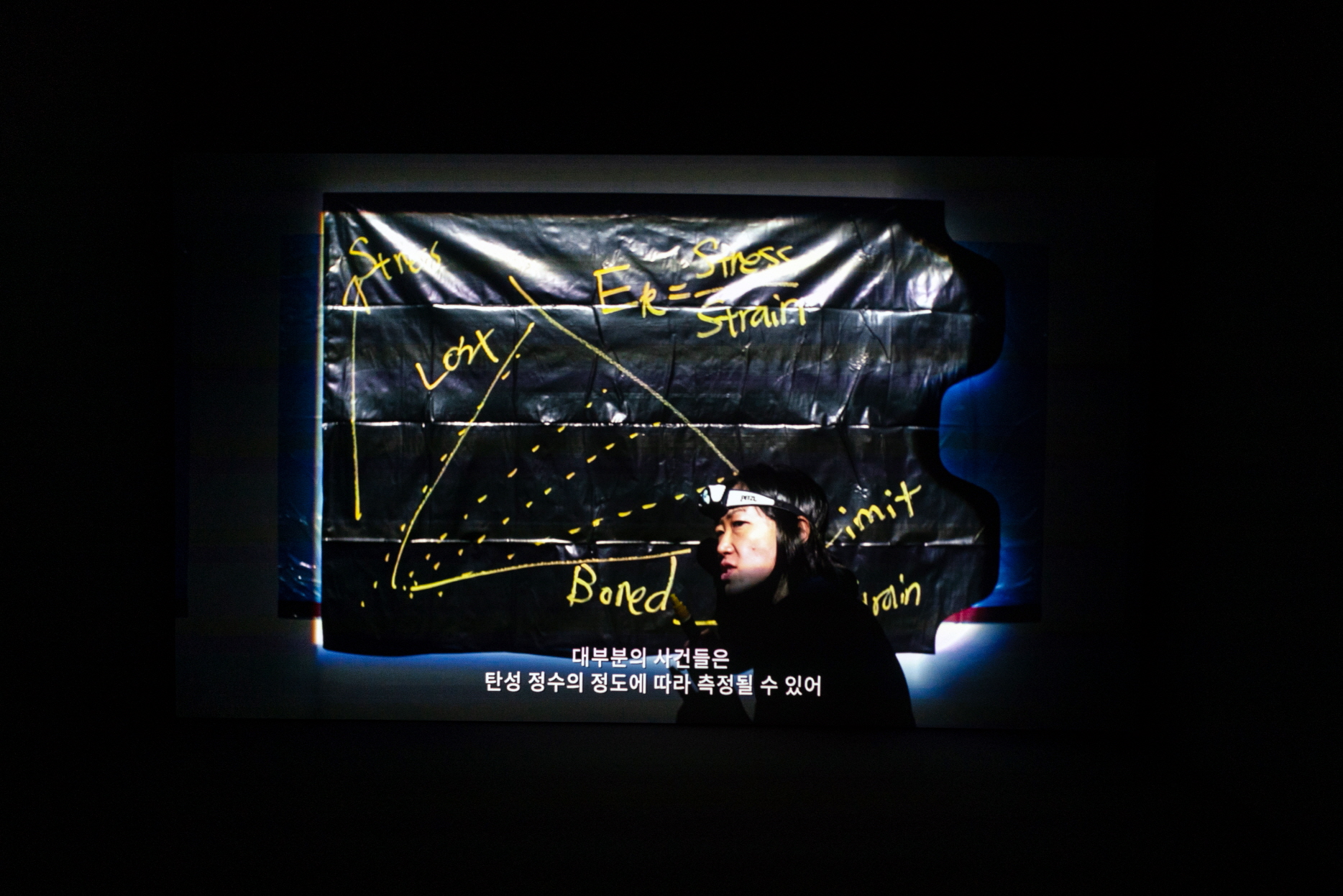 사사모토 아키(Aki Sasamoto), 〈영상: 항복점〉, 2017, 단채널 비디오, 컬러, 사운드, 21:44. 부산현대미술관의 한 방에 독립적으로 상영되는―영상의 경우 대부분 독립적인 하나의 공간을 수여했다.―, 사사모토 아키(Aki Sasamoto)의 퍼포먼스 영상 역시 흥미롭다. 〈영상: 항복점〉[2017, 단채널 비디오, 컬러, 사운드, 21:44.]은 탄산 정수에 따라 모든 사람이 측정 가능하다고 주지하는데, 전시장을 퍼포먼스의 장소로 일회적으로 연출한다. 모빌, 쓰레기통, 봉지, 벽의 캔버스까지 설치와 회화 등 모든 것이 렉처 퍼포먼스의 재료로 변환된다. 또한 트램펄린을 타는 등 ‘탄성’이라는 성질을 재료들에 부여하고, 파이프 오르간, 색소폰 등의 악기가 동원되는데, 대부분의 시간이 퍼포먼스의 시간을 위해 섬세하고 정교하게 세공되어 있으며 촬영 역시 기록적이면서도 그 세부를 잘 담아낸다.