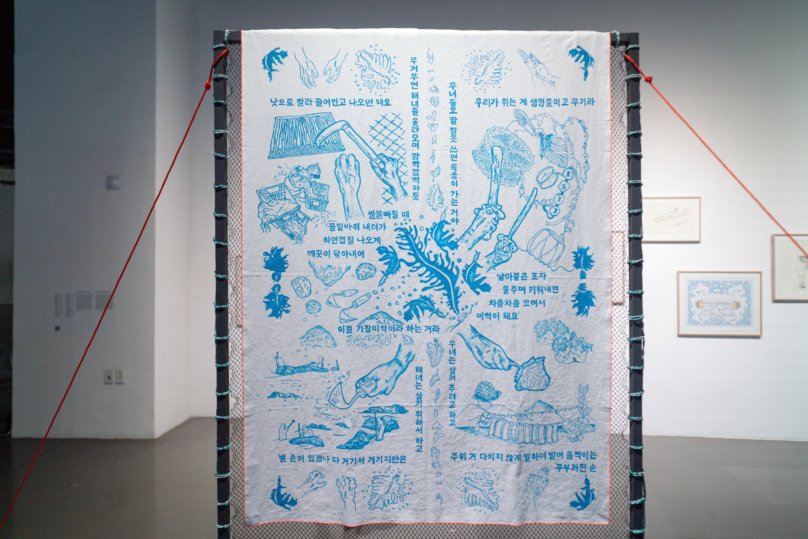 라이스 브루잉 시스터즈 클럽(손혜민, 신현진, 유소윤), 〈손엮어풀얽힌갯바위〉, 2022, 혼합매체 잉크젯 프린트, 목재, 광목, 그물, 부표, 초), 영상(02:20, HD 컬러, 무음), 가변크기(200×785×650cm). 설치: 신익균, 영상편집: KAY. 메간 코프나 필리다 발로와 같이 부산의 사물을 작업으로 전유하는 작업이 다소 임시적인 조각의 특질을 실험하는 일차원적인 충동성의 발로로 보인다면, 단순히 부산에서 태어난 작가들이 아니라 전적으로 ‘부산에서 작업’을 한 몇 명의 작가들의 작업은 심층적인 충동의 특질을 보여준다고 할 수 있을까. 라이스 브루잉 시스터즈 클럽(손혜민, 신현진, 유소윤)은 메간 코프의 작업에 비해 상대적으로 훨씬 더 구체적인 과정 자체를 작업으로 연장하는데, 이는 부산 해녀, 맨손 어업인의 목소리를 작업으로 현전시키는 행위로 나타난다. 곧 필리다 발로의 작업에서 부산이 표면화된다면, 그리고 현남의 작업에서 다시 부산이 사물의 환경으로 환원되어 가는 것으로 보인다면, 라이스 브루잉 시스터즈 클럽의 작업에 의해 가시화되지 않은 부산의 존재가 드러나게 된다. 물론 이와 같은 또 다른 예시는 미술관을 제외한 다른 공간들의 채택 그 자체이다.