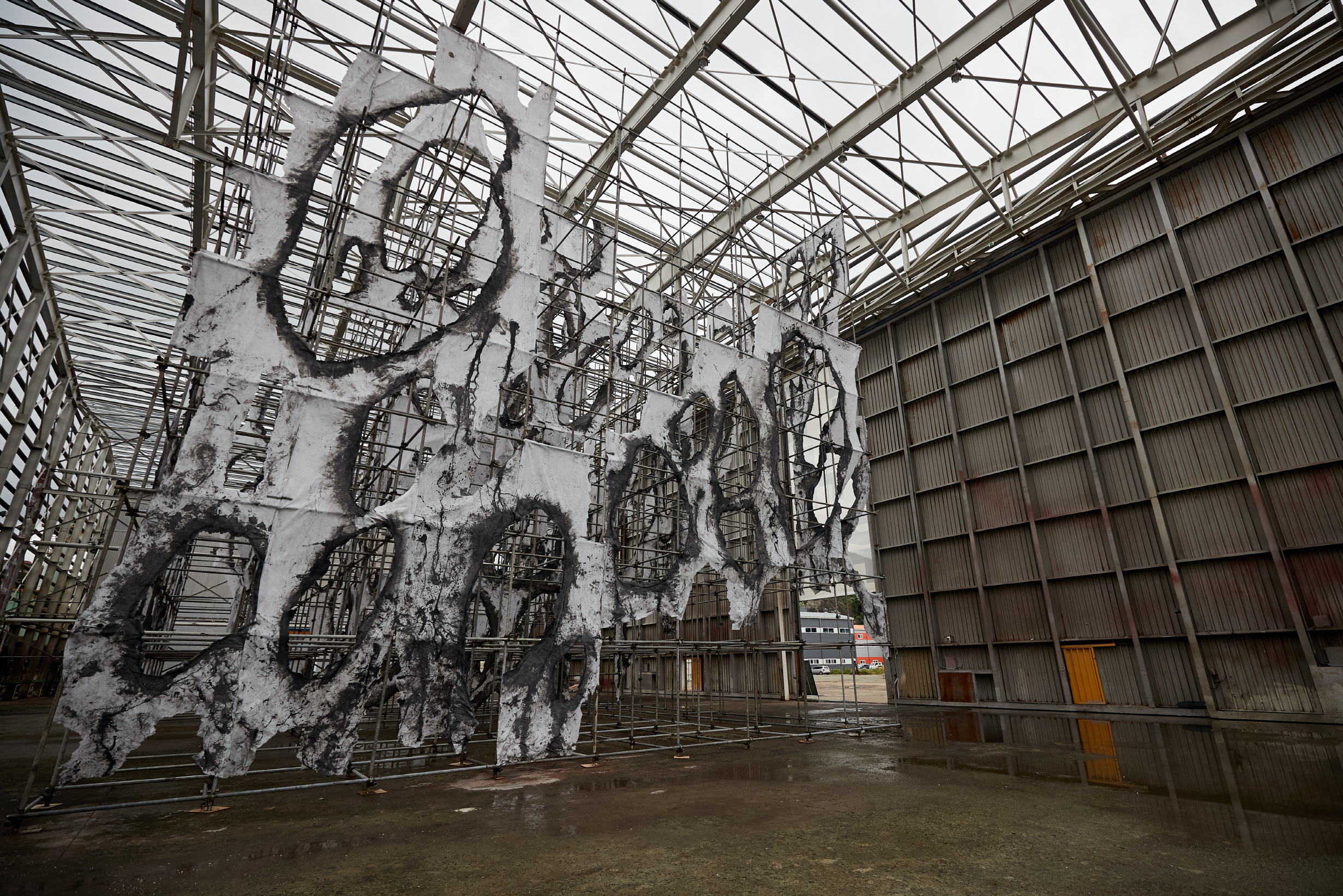 이미래, 〈구멍이 많은 풍경: 영도 바다 피부〉, 2022, 비계, 폐유, 공사 가림막, 1620×2160×1660cm.[사진 제공=2022부산비엔날레] 영도에 전시된, 건설 현장에서 사용되는 재료들을 가지고 작업해온 이미래의 작업 〈구멍이 많은 풍경: 영도 바다 피부〉[2022, 비계, 폐유, 공사 가림막, 1620×2160×1660cm.]는 《비엔날레》를 상징하는 또 이를 환유하는 거대한 체험 공간과 이미지가 되었다. 사실상 이 작업은 “건물의 골조가 드러나 있”는 공간 안에서 건설 현장의 외형을 스펙터클하게 재현했다는 인상과 함께 태풍 힌남노와 난마돌로 인해 원래의 천이 더 손상되며 시간의 잔해와 같은 형상을 하며 오히려 더 주목받게 되었는데, 공간을 채우기 위한 스펙터클이든 스펙터클을 채우기 위한 공간 선정이든 그것이 환경과 적확하게 맞물림이 발생하는 지점에서 ‘부산’이 현재화됨을 의도치 않게 드러낸다.