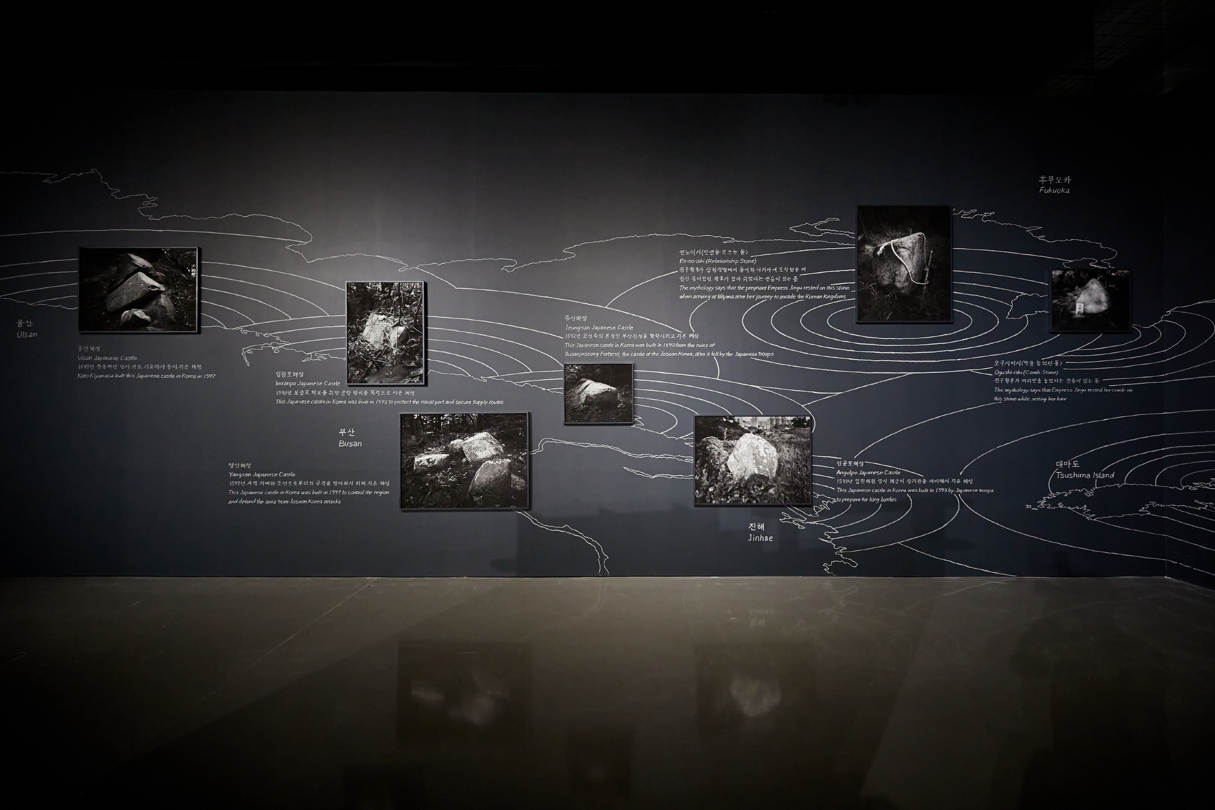 가마타 유스케(Yusuke Kamata), 〈일본식 주택, 제국주의의 석정〉, 2022, 목재, 잉크젯 프린트, 아크릴, 페인트, 모래, 모니터, 455×1160×1020cm.[사진 제공=2022부산비엔날레] 부산을 로케이션으로 한 오석근의 ‘적산’ 시리즈는 한국 근현대사와 맞물려 현지에서의 적응 과정 등 적산가옥의 변화상을 추적, 탐구해 가는데, 기존 인천에서 부산으로 그 작업 과정을 연장했다고 하겠다[출처: 「《적산가옥》: 중층의 시간과 시각」, https://www.artscene.co.kr/1766]. 관련해서 오석근과 함께 전시를 했던 가마타 유스케(Yusuke Kamata)는 『일본서기』에만 기록된 삼한정벌, 곧 “고대 일본의 진후 황후가 신라에 군대를 보내 굴복시켰다는 이야기”가 이후 계속해서 조선 침략의 명분으로 작용했음에 주목해, 16세기 왜란과 함께 지어진 부산, 경남 일대의 왜성의 흔적을 쫓아 “부산과 규슈 지역을 잇는 하나의 석조 정원 이미지를 구축”한다―〈일본식 주택, 제국주의의 석정〉[2022, 목재, 잉크젯 프린트, 아크릴, 페인트, 모래, 모니터, 455×1160×1020cm.]. 이는 상상적인 차원을 이미지로 재현함으로써 유아론적으로 나의 영토를 주장하는 전쟁의 이념 혹은 정치적인 차원에서 전쟁을 설계하는 이데올로기의 연장선상에서 전쟁과 연관된 행위를 감각으로 치환한 것이라 하겠다.