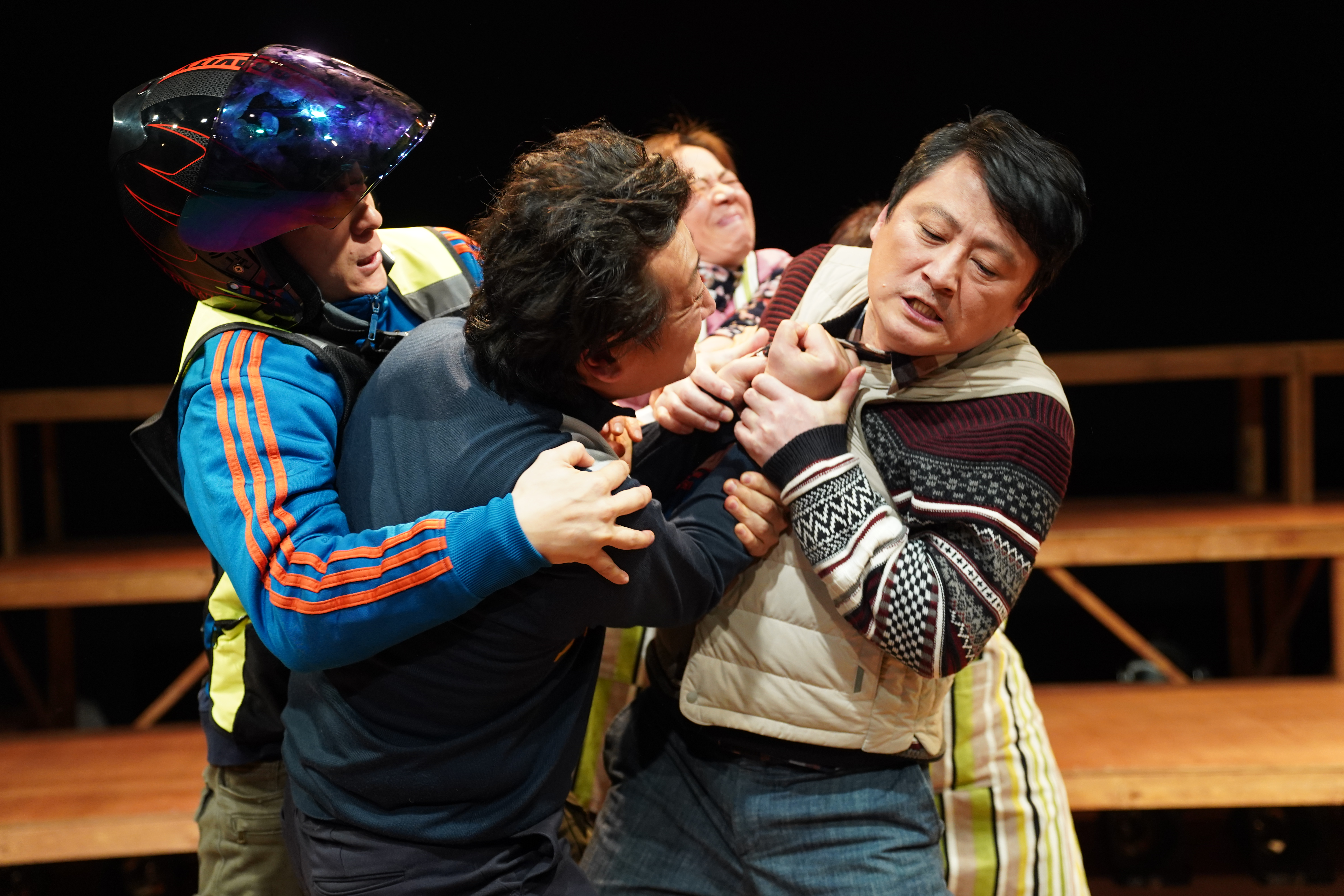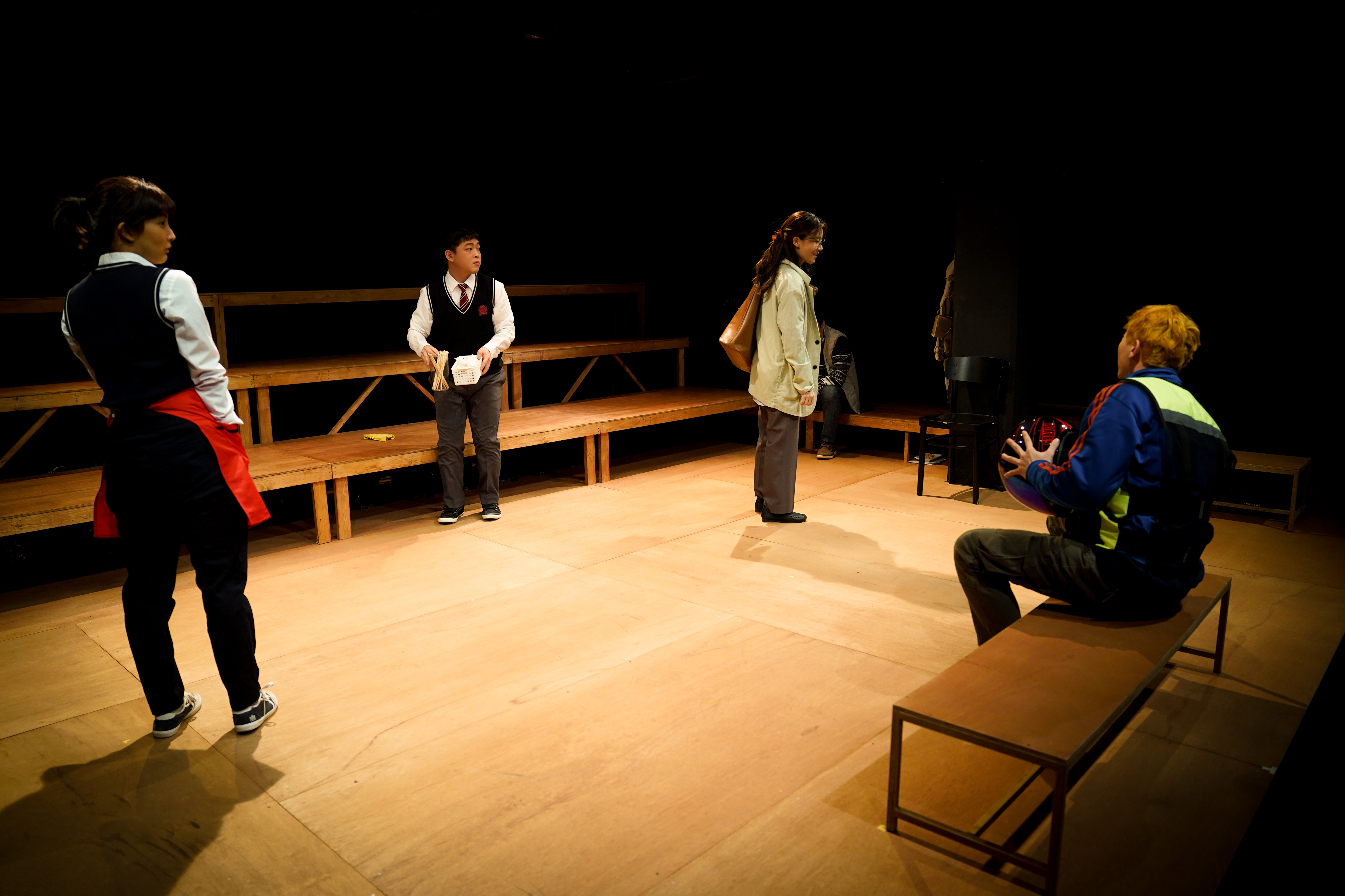 연극 〈라이더〉(작가 고정민 / 연출 신진호)ⓒ이지수(이하 상동). (사진 왼쪽부터) 밀리 역 조혜안, 호영 역 이재혁, 선생 역 하지은, 호영 아빠 역 최태용, 세훈 역 최호영. 아마 현실을 다루는 대부분의 연극은 현실을 인지하게 하는 메타-현실의 관점을 창안하고자 할 것이다. 물론 이는 전적인 형식이 되지는 않더라도/않겠지만 일부분 그러한 지점에서 ‘현실’을 반향하는 바가 생겨날 것이다. 그리고 〈라이더〉의 물리적이고 형식적인 차원에서 가장 특이한 점은 바로 자신의 장면이 끝나고서도 그 무대를 떠나지 않는 배우들에 있다. 이들은 다른 등장인물들의 갈등을 바라보며 의도치 않은 개입에 적잖이 당혹하면서도 자신의 역할의 연장선상에서 이 연극과도 같은 현실에 부가적으로 동기화되어야 한다. 언제든지 개입할 수 있다는 차원에서 주로 무용 공연의 일종의 워크숍적 순환의 차원으로 종종 등장하는 이러한 구도가 〈라이더〉에서는 조금 더 지나친데, 이들의 존재가 무대로 함입되기 때문이다. 이는 배우의 입장에서는 발화(의 장면)에서 구성되는 ‘내면’이 발화 없이 태도와 감정 등을 종합한 입체적인 입장의 차원으로 비쳐야 한다는 것인데, 이러한 캐릭터를 구축하는 건 아무래도 쉽지 않은 과제임이 틀림없다.